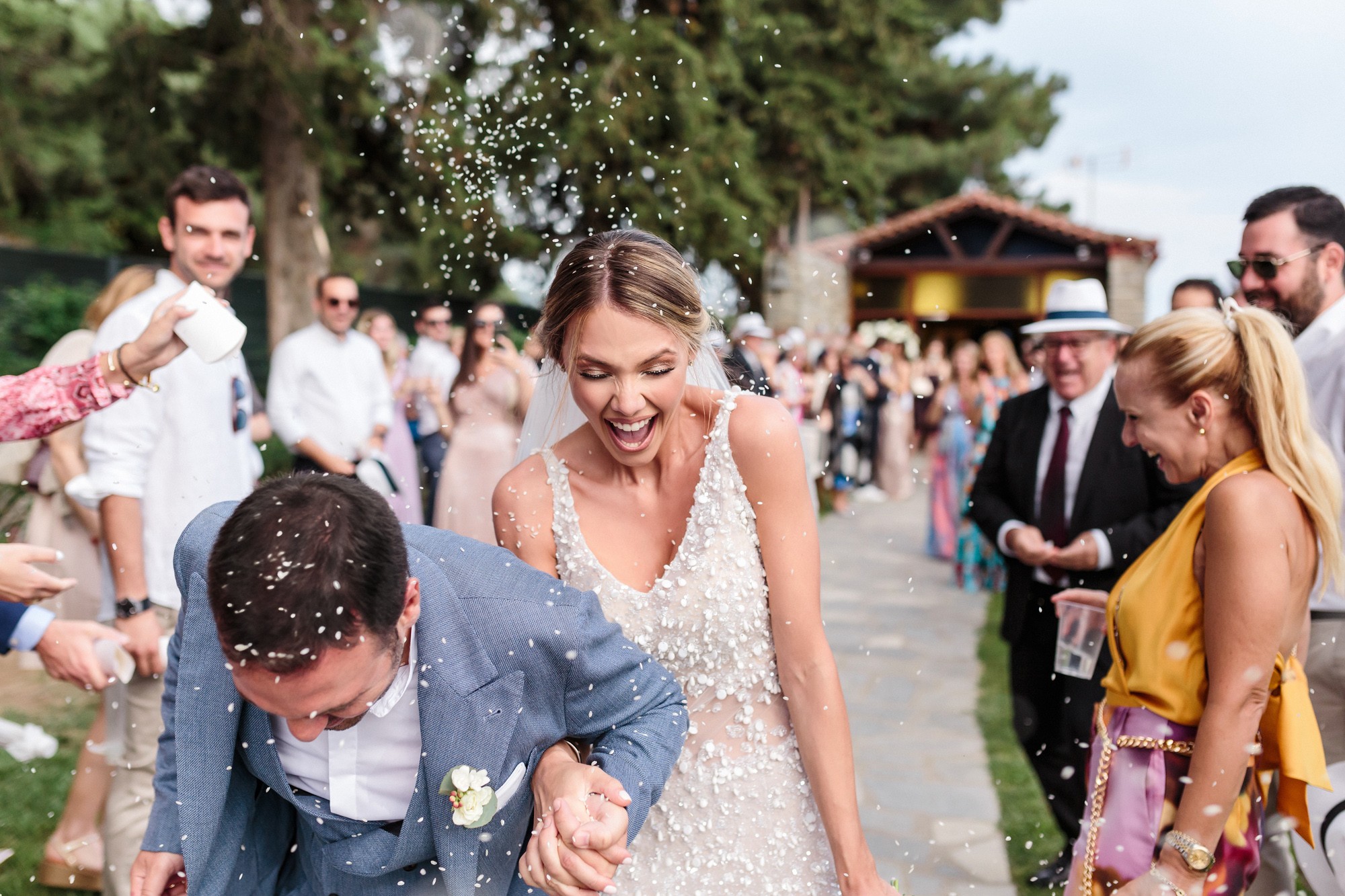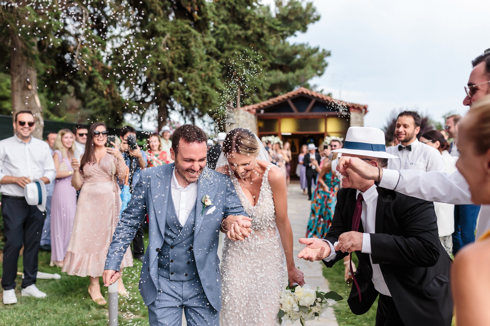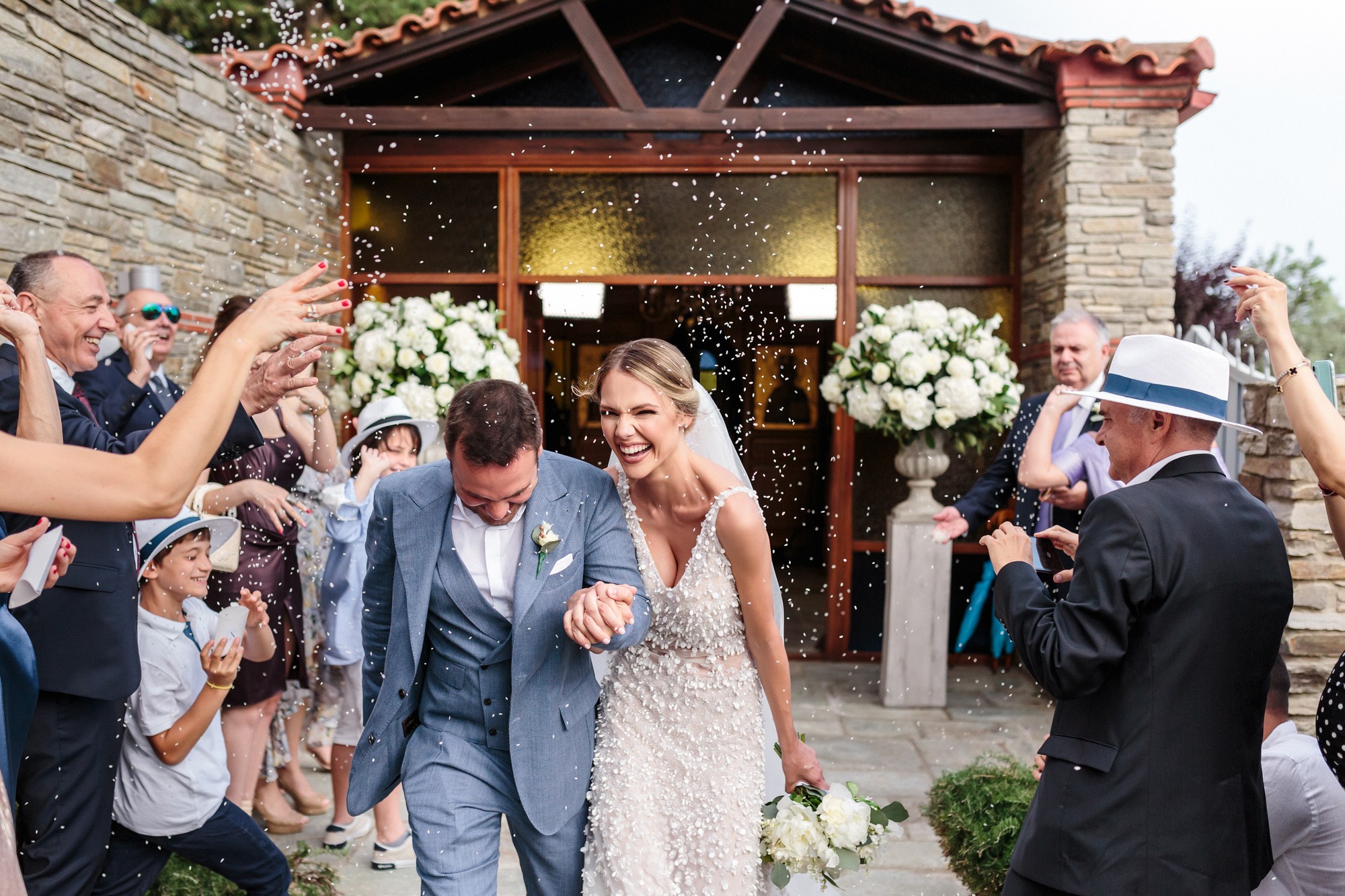 The wedding ceremony was held in a beautiful stone chapel inside the resort. Their first look while Lida was walking down the aisle and their first hug, created an emotional scenery and definitely some of the most moving wedding photos. From this lush ceremony, there could not be missing some of the most common traditions of a greek wedding, the rice tossing. Our couple surely had some laughs while their friends and family showered them with rice, which is a wish for a life full of love and luck.