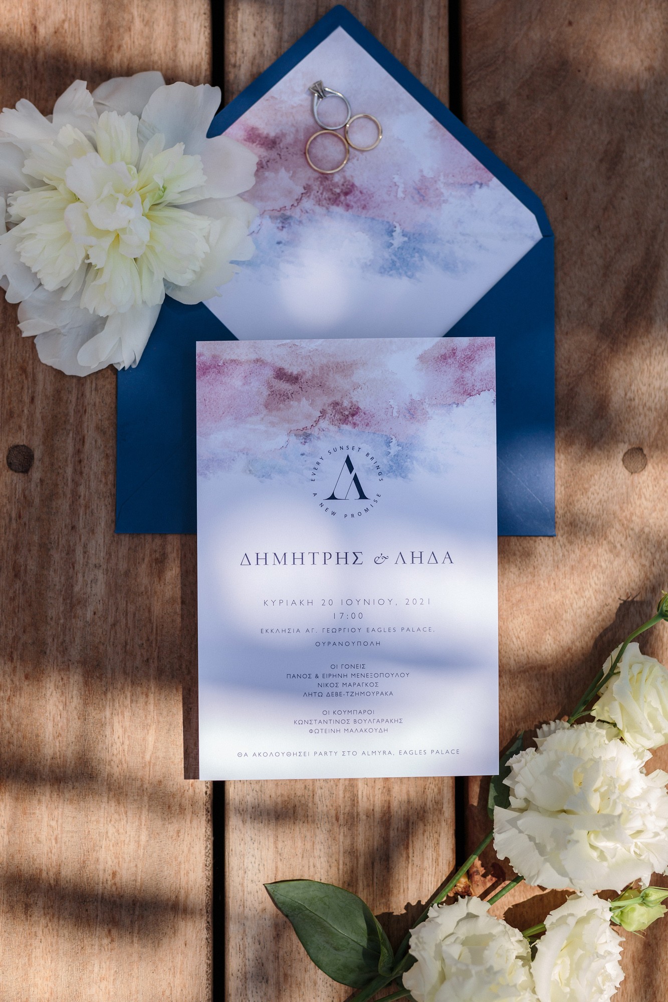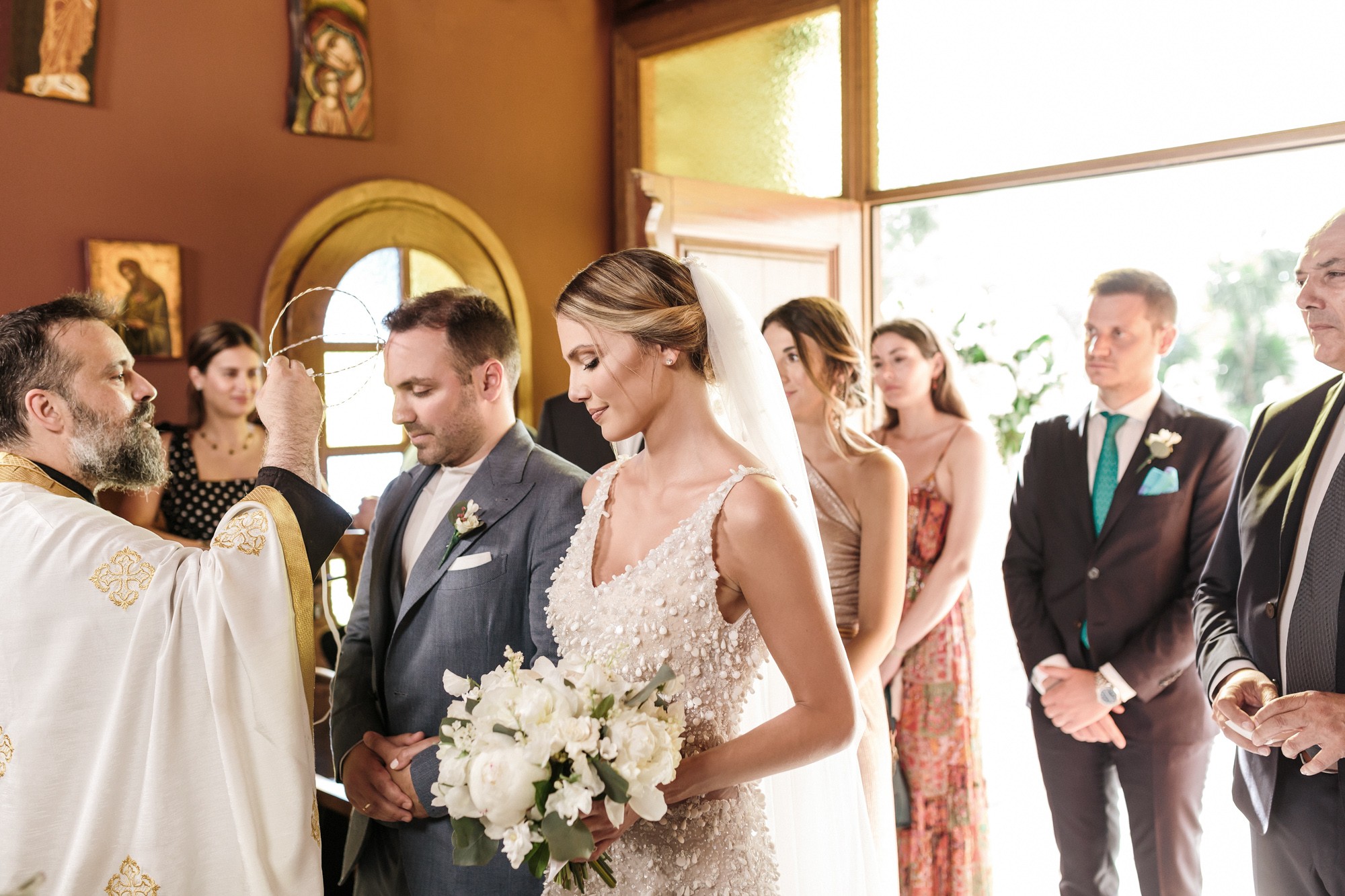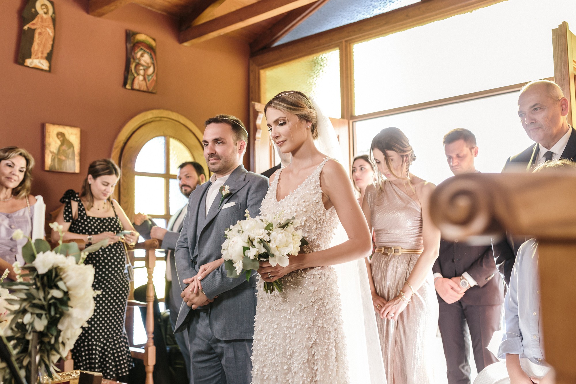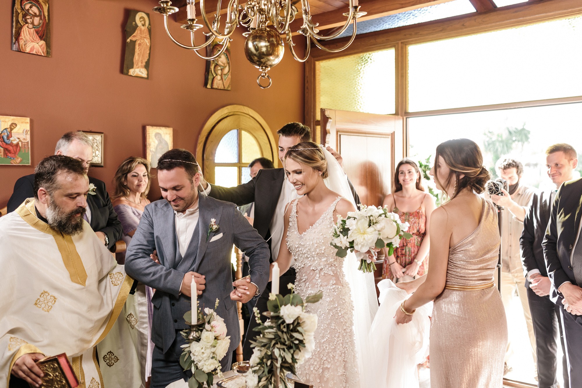 In both rooms there was a festive joyful vibe while our couple was getting ready for their big day. Dimitris looked absolutely charming and happier than ever as he was wearing his grey suit. In the mean time Lida was enjoying the company of her loved ones, while she was having her hair and make-up done. Her white dress with the stone details by the designer Denise Eleftheriou stole the show. She truly looked more beautiful than ever.