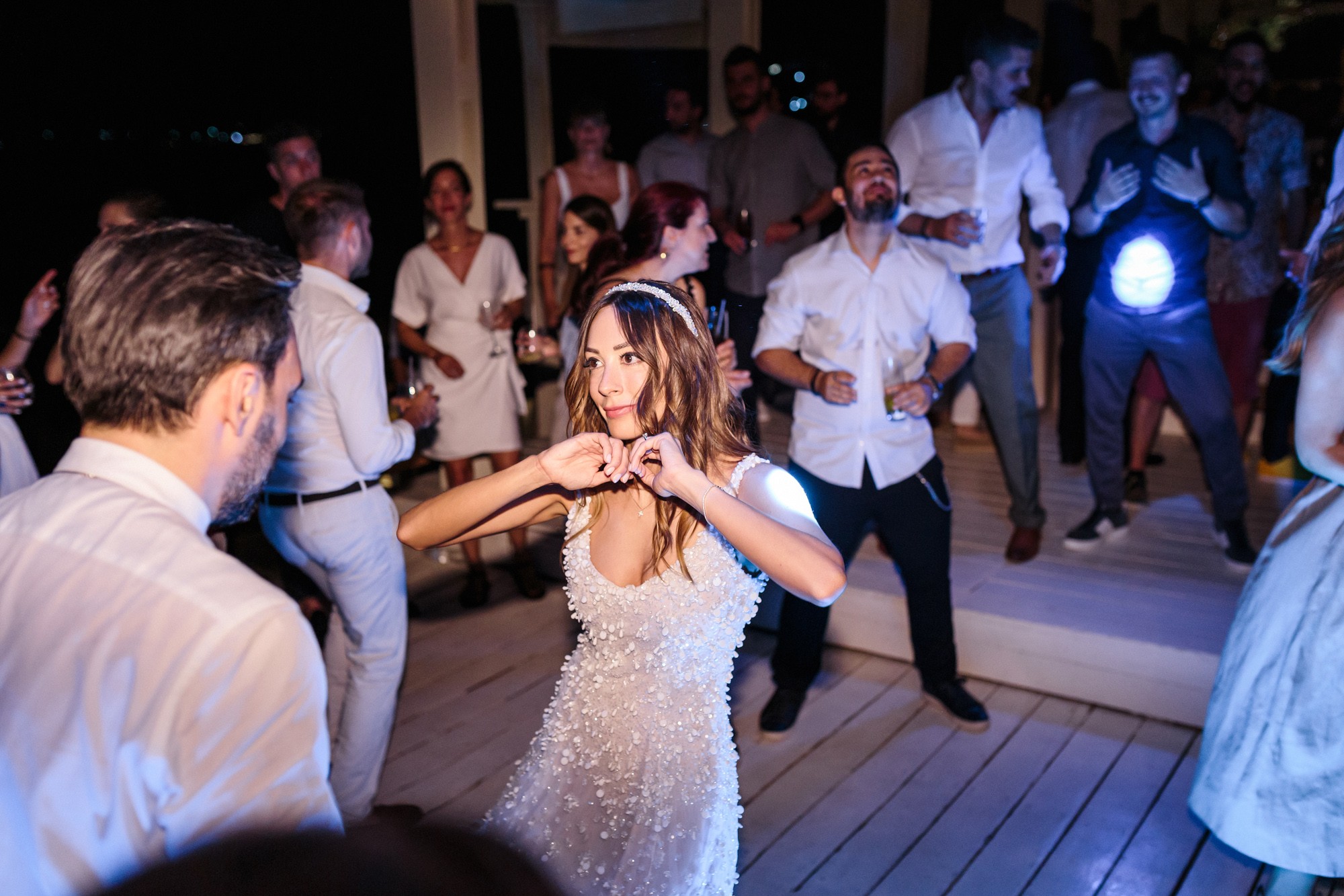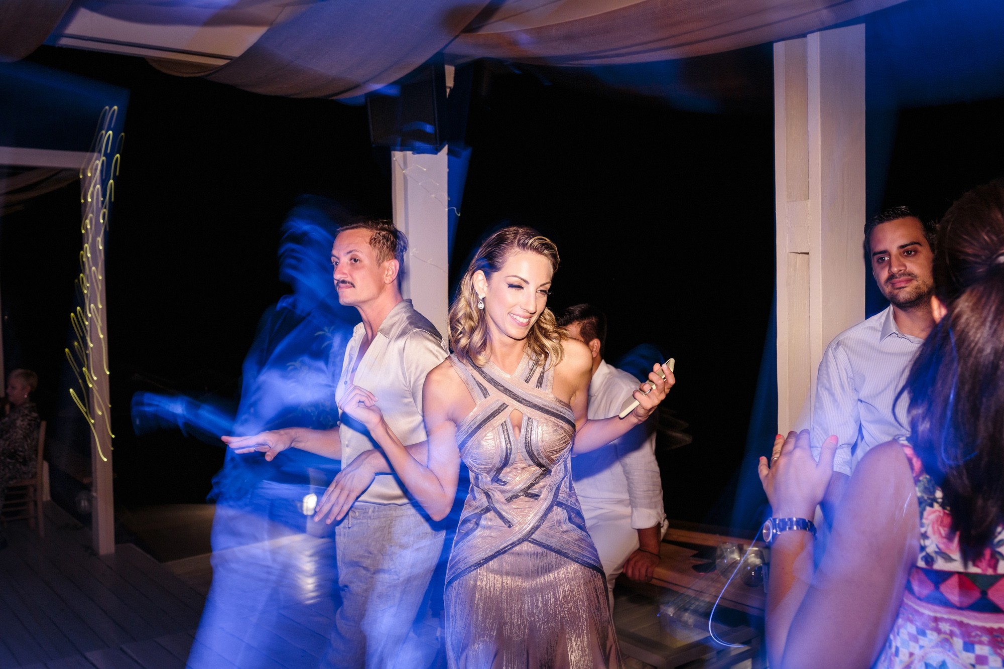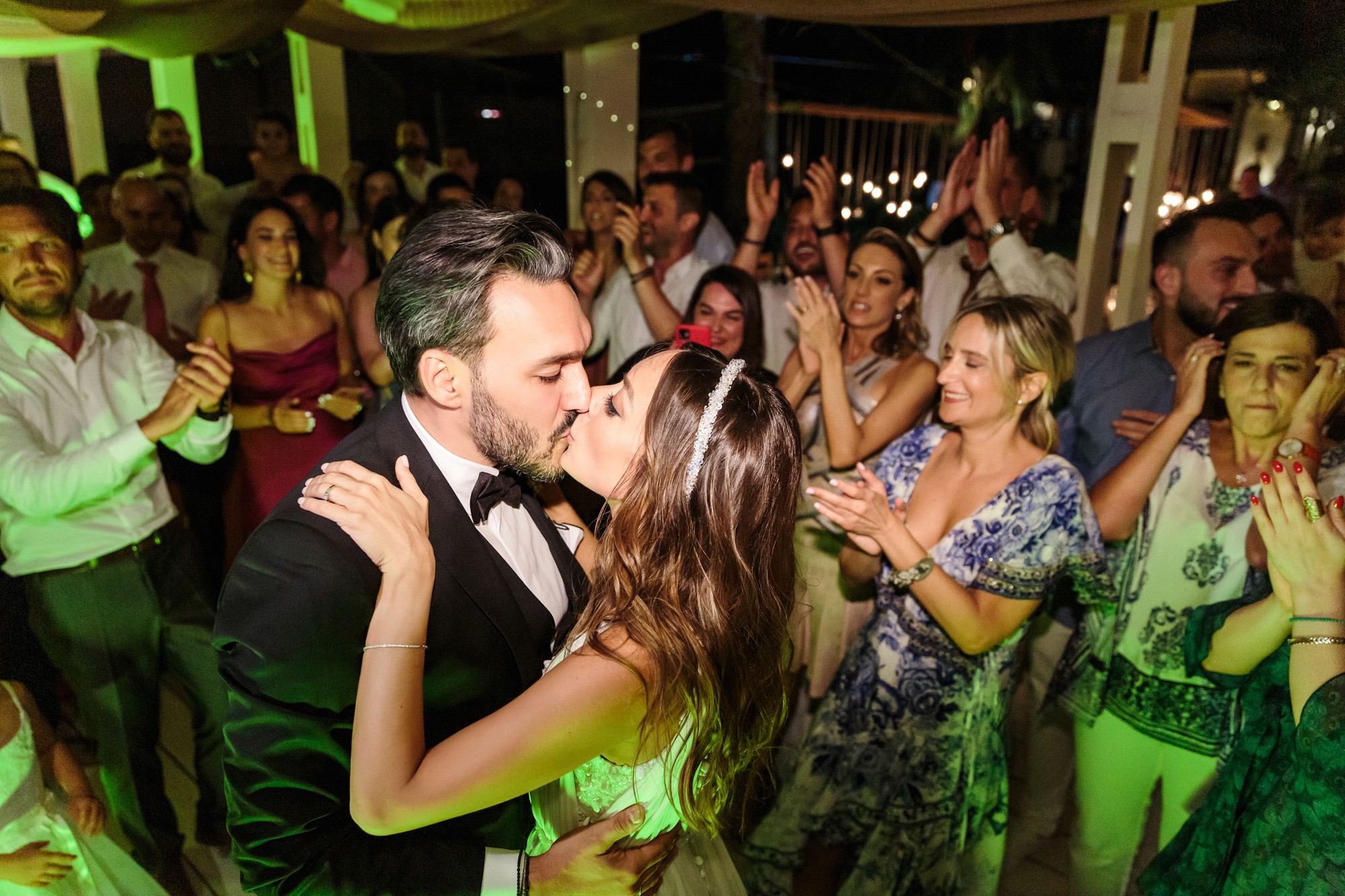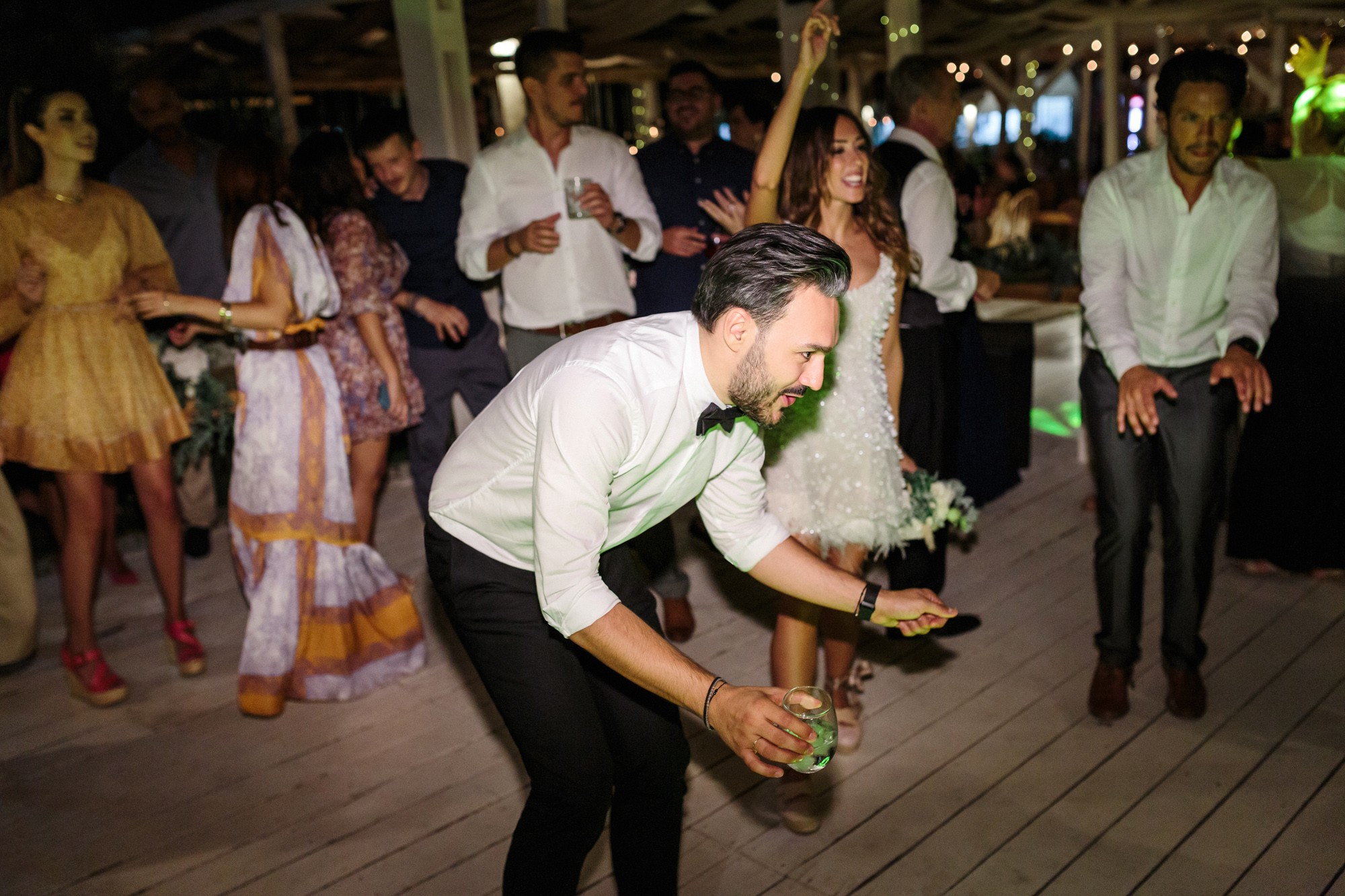But that was not all. A celebration was about to start in Navagos Beach Bar. The venue was decorated beautifully by the caravan project. Blue and white details in the decor accompanied by a floral arrangement of white roses created the perfect wedding reception. All the moments of pure fun, dance, and laughter were captured in our wedding photos which our couple will happily show in the generations to come.