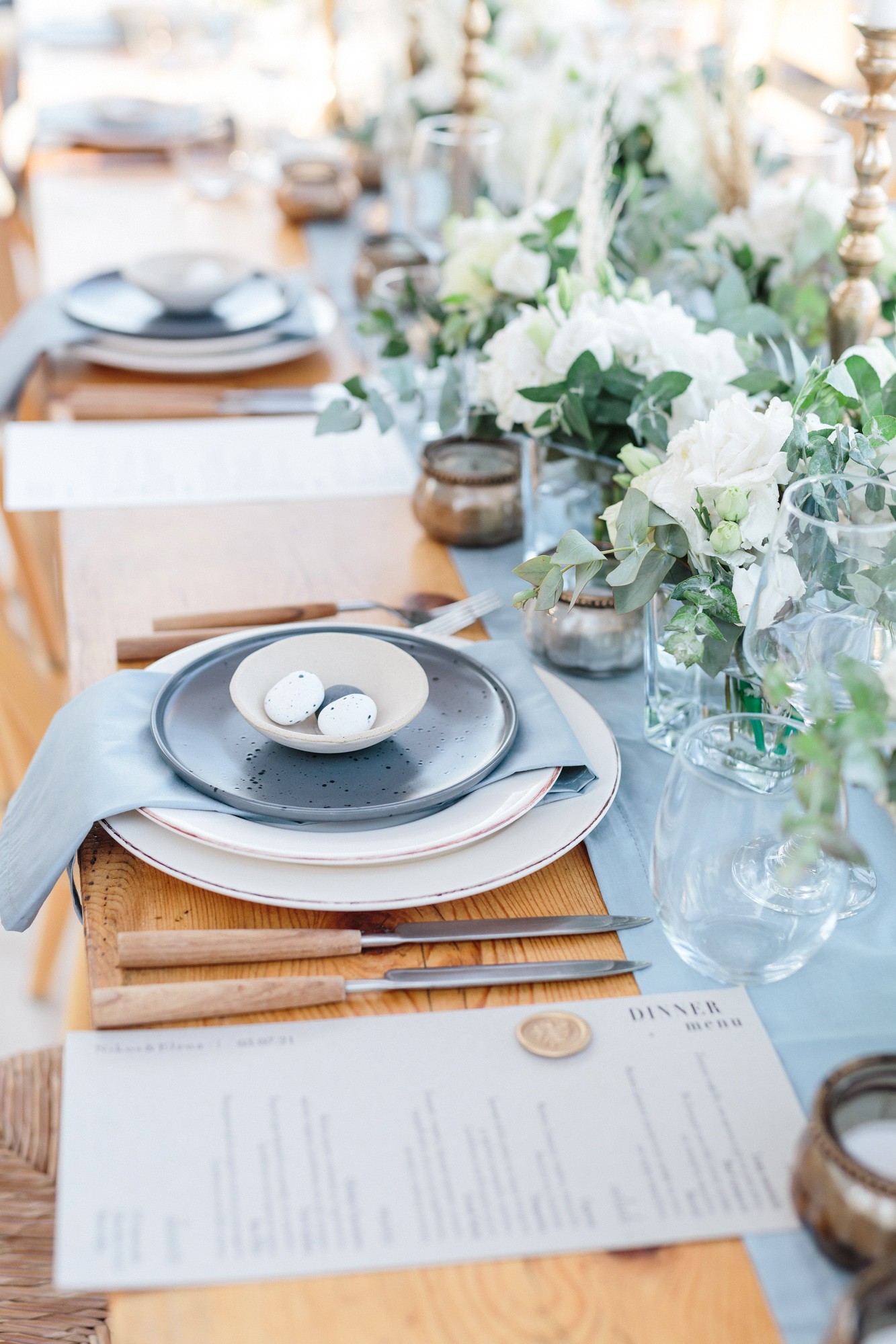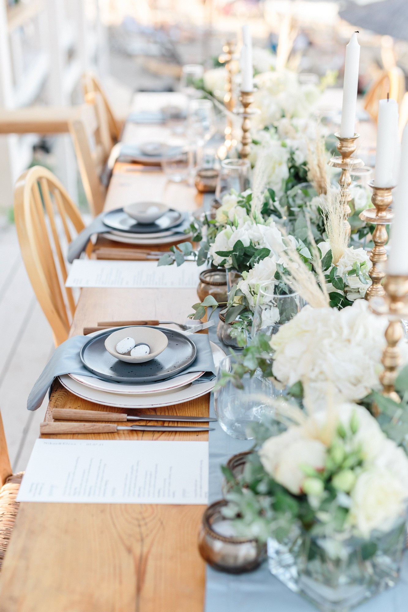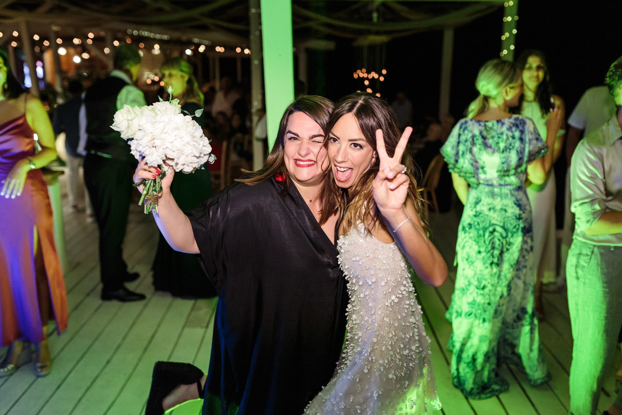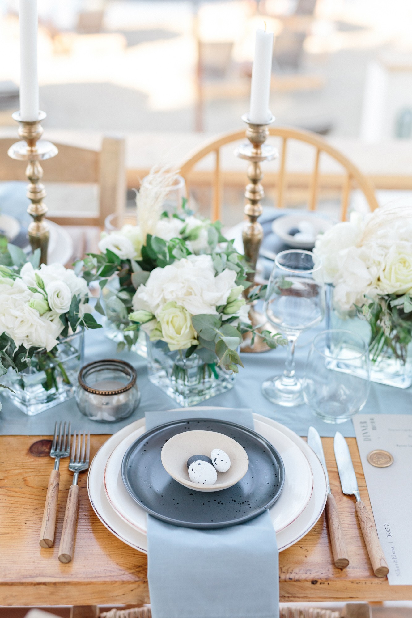 But that was not all. A celebration was about to start in Navagos Beach Bar. The venue was decorated beautifully by the caravan project. Blue and white details in the decor accompanied by a floral arrangement of white roses created the perfect wedding reception. All the moments of pure fun, dance, and laughter were captured in our wedding photos which our couple will happily show in the generations to come.