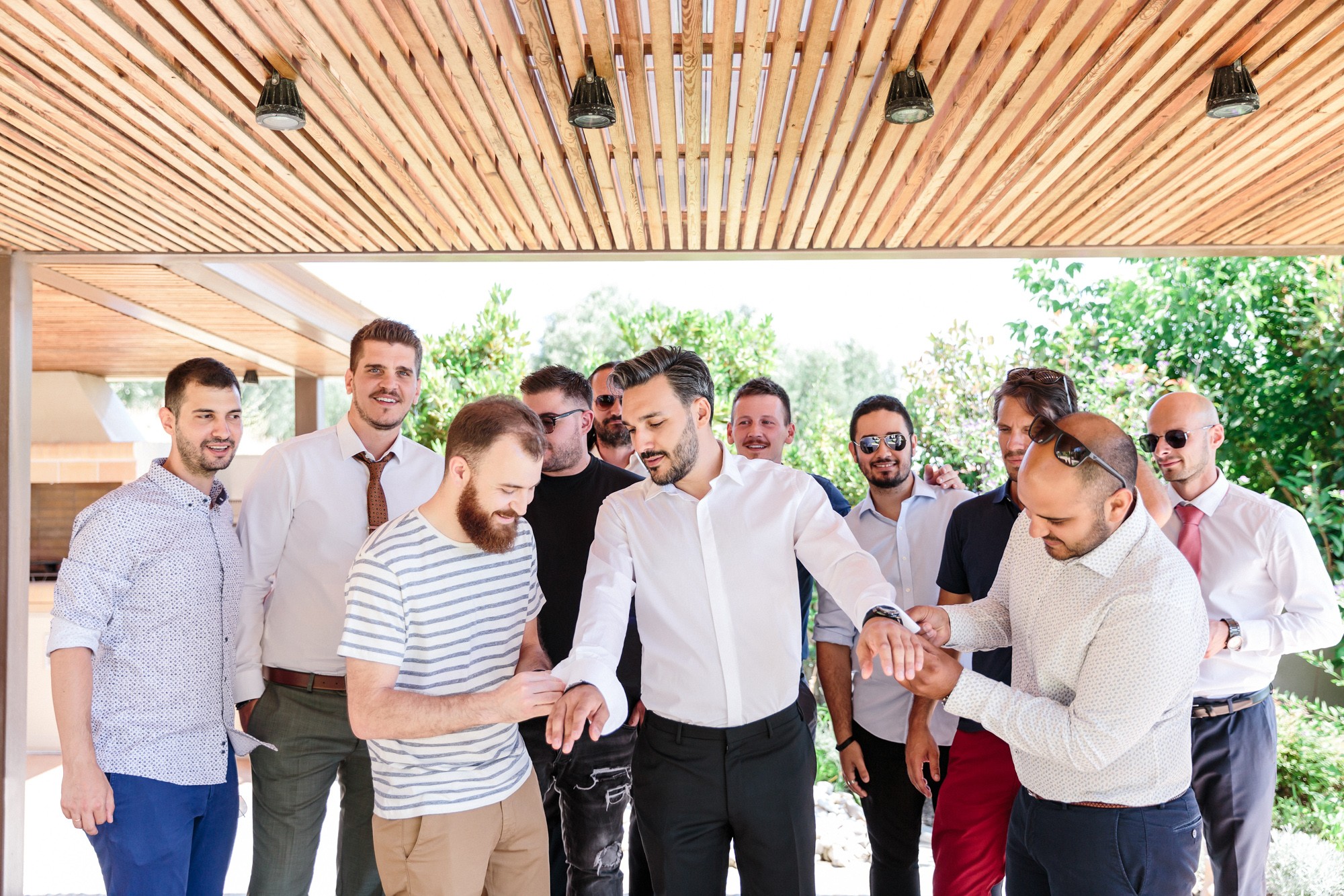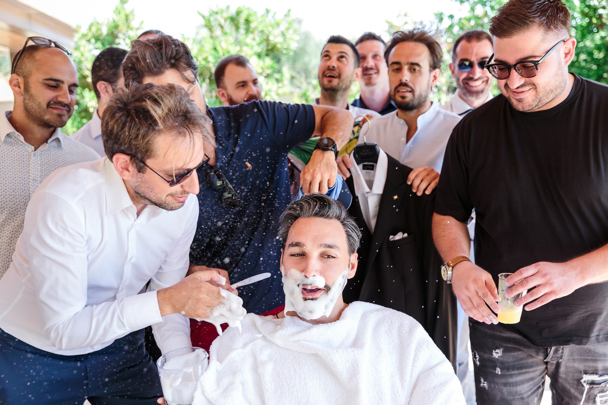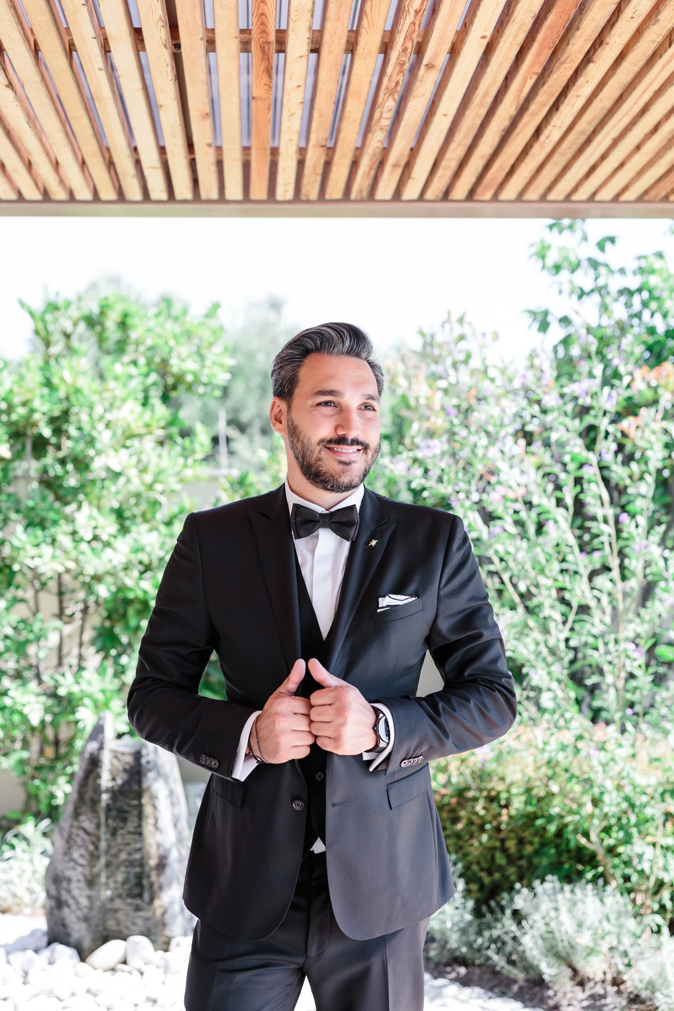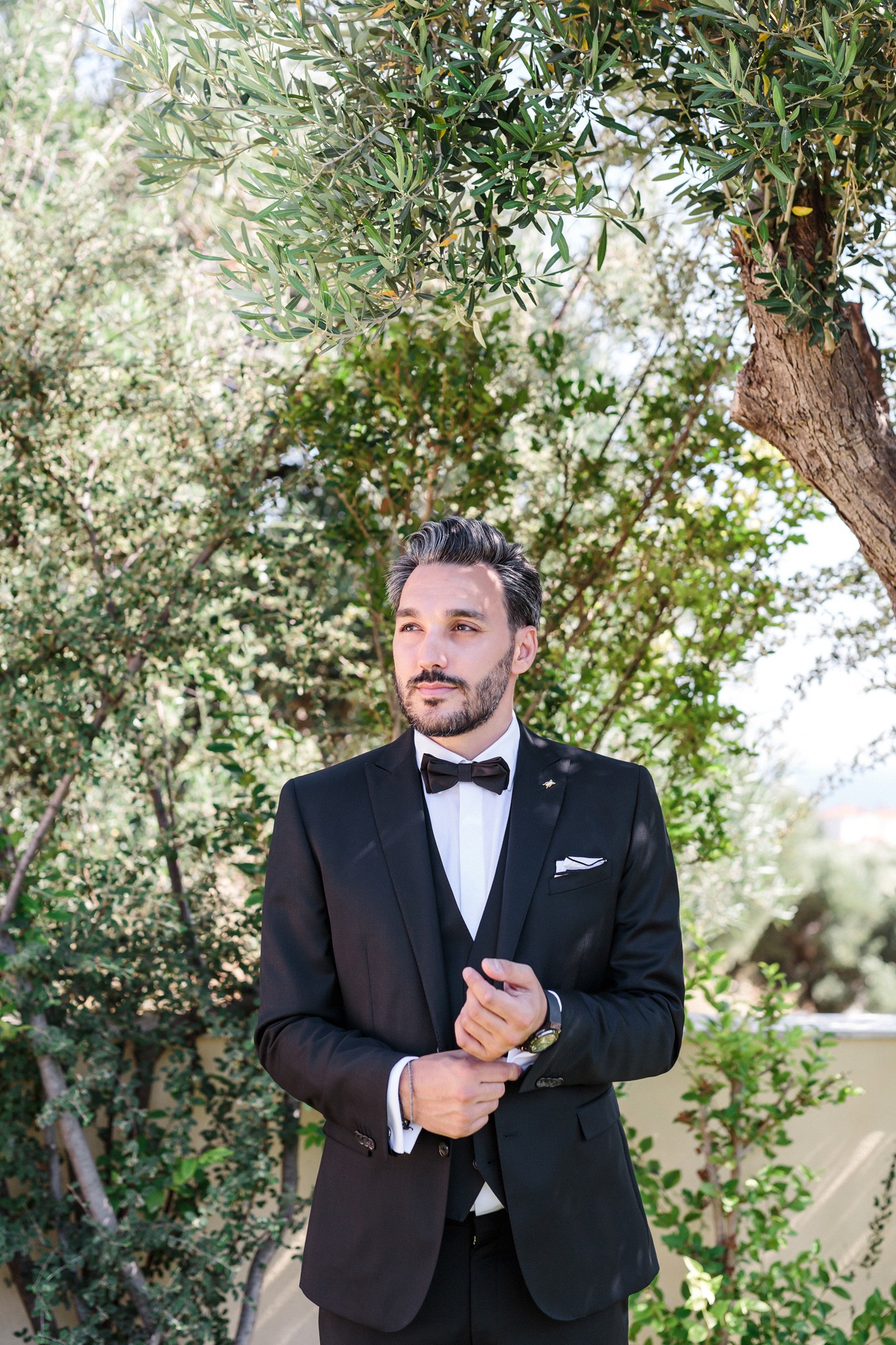 Nikos got ready in his house in Chalkidiki together with his friends and family. Their jokes and small traditions like shaving him before the ceremony, created a fun atmosphere that every guest enjoyed. His choice of a black Prada suit was perfect, as he looked as charming as ever.