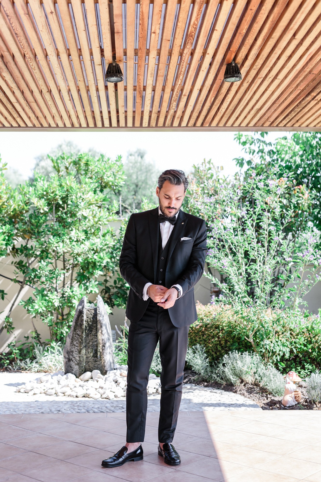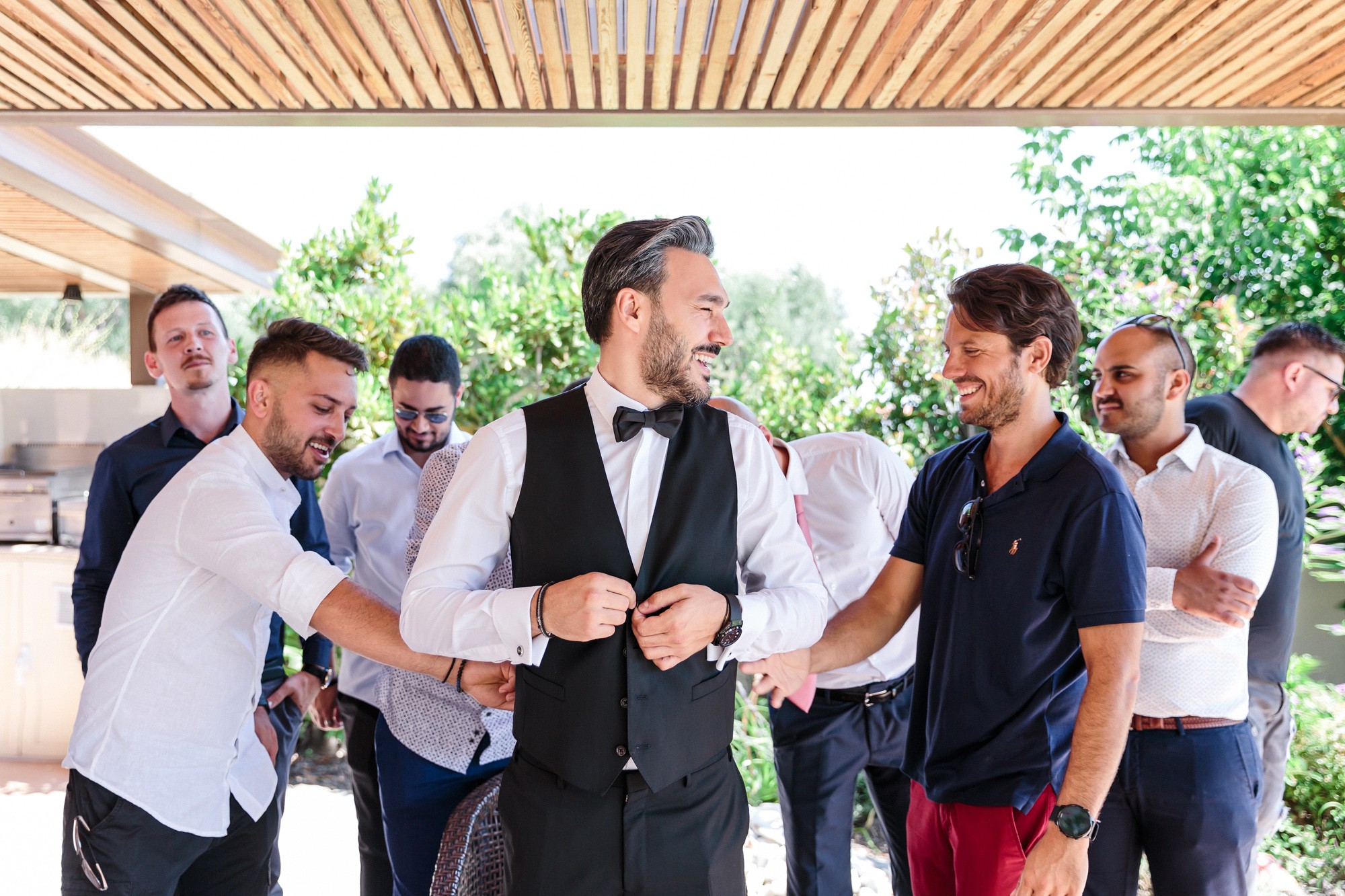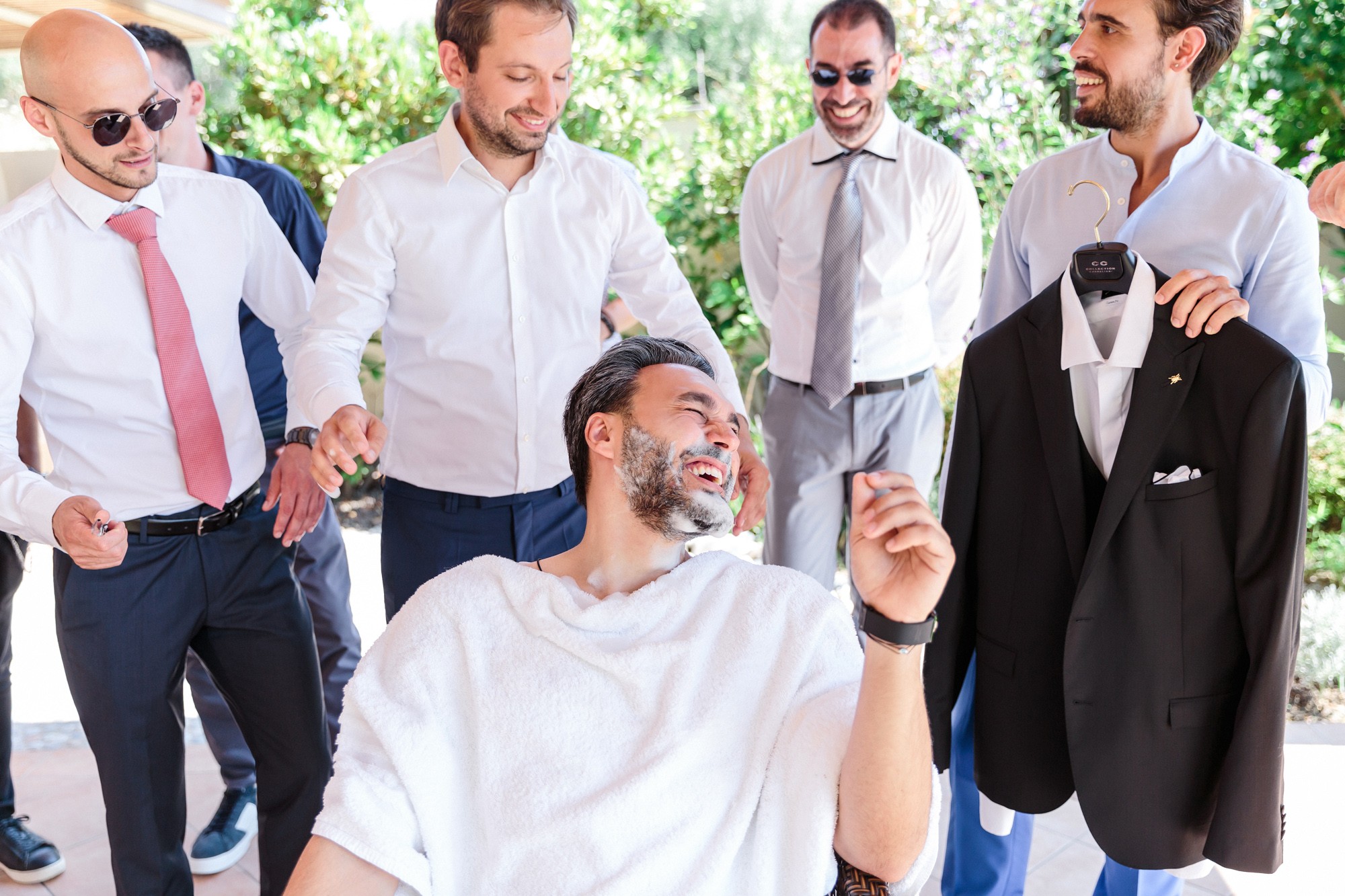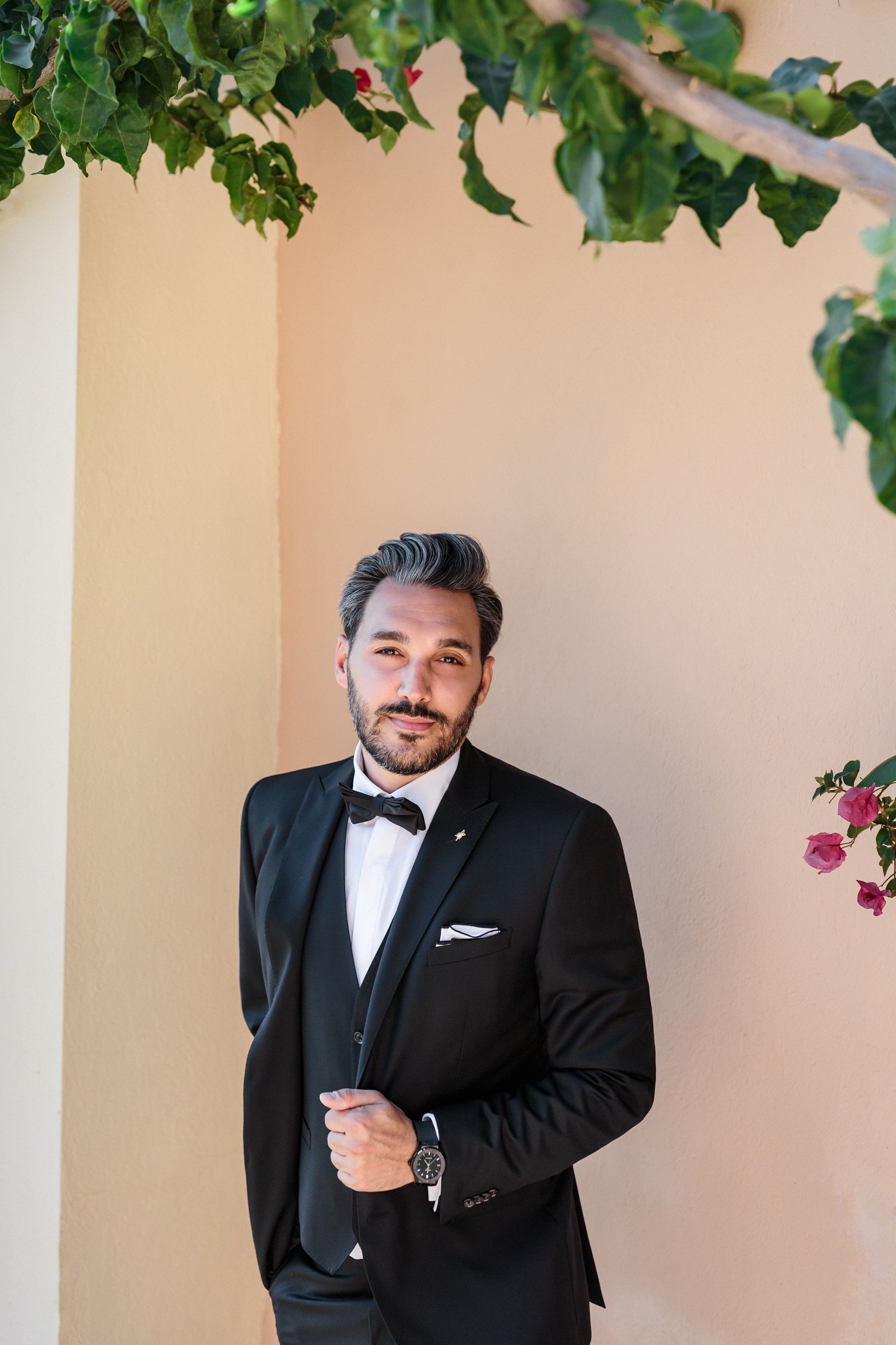 Nikos got ready in his house in Chalkidiki together with his friends and family. Their jokes and small traditions like shaving him before the ceremony, created a fun atmosphere that every guest enjoyed. His choice of a black Prada suit was perfect, as he looked as charming as ever.