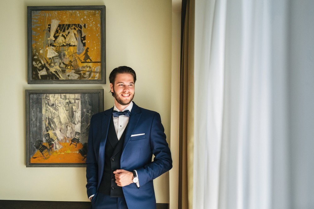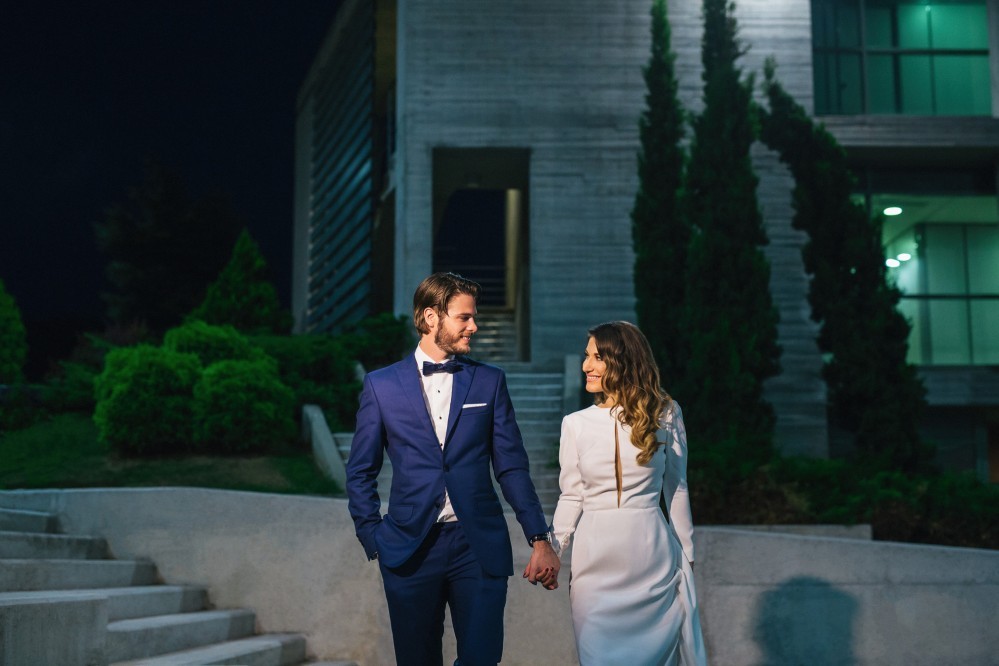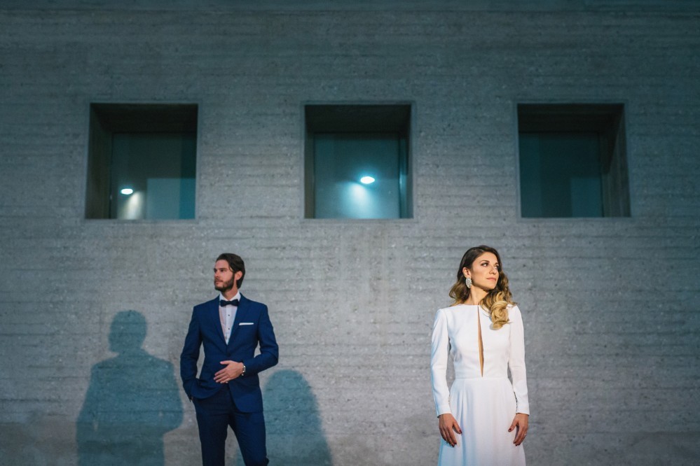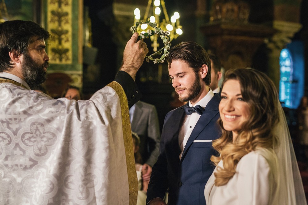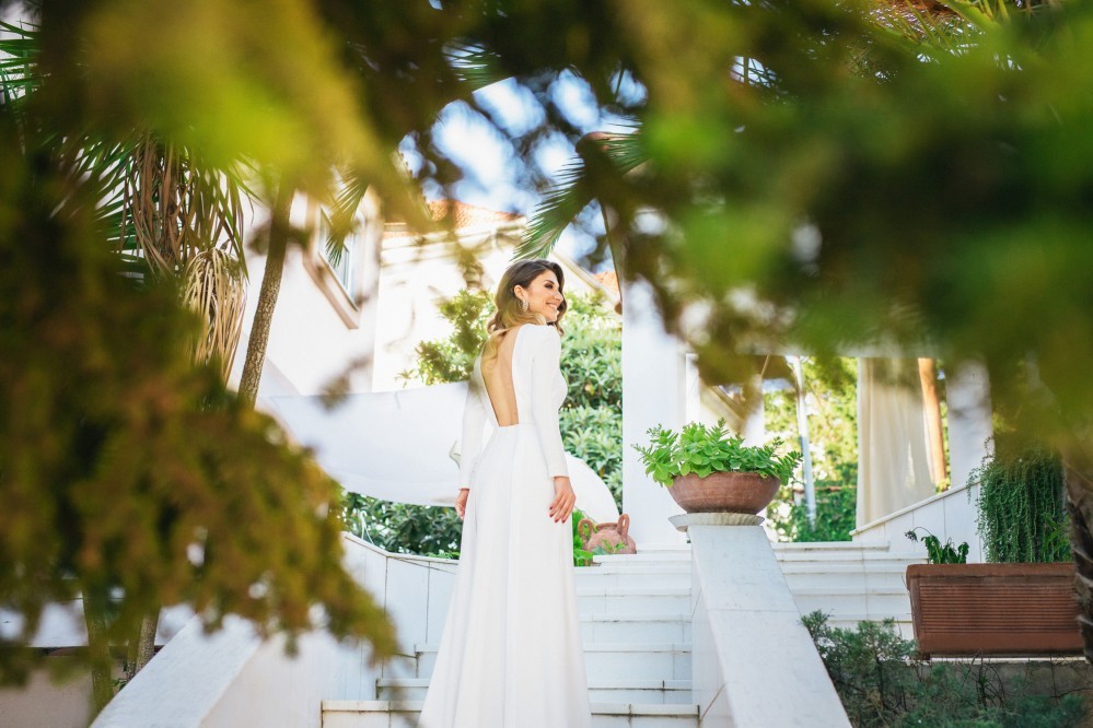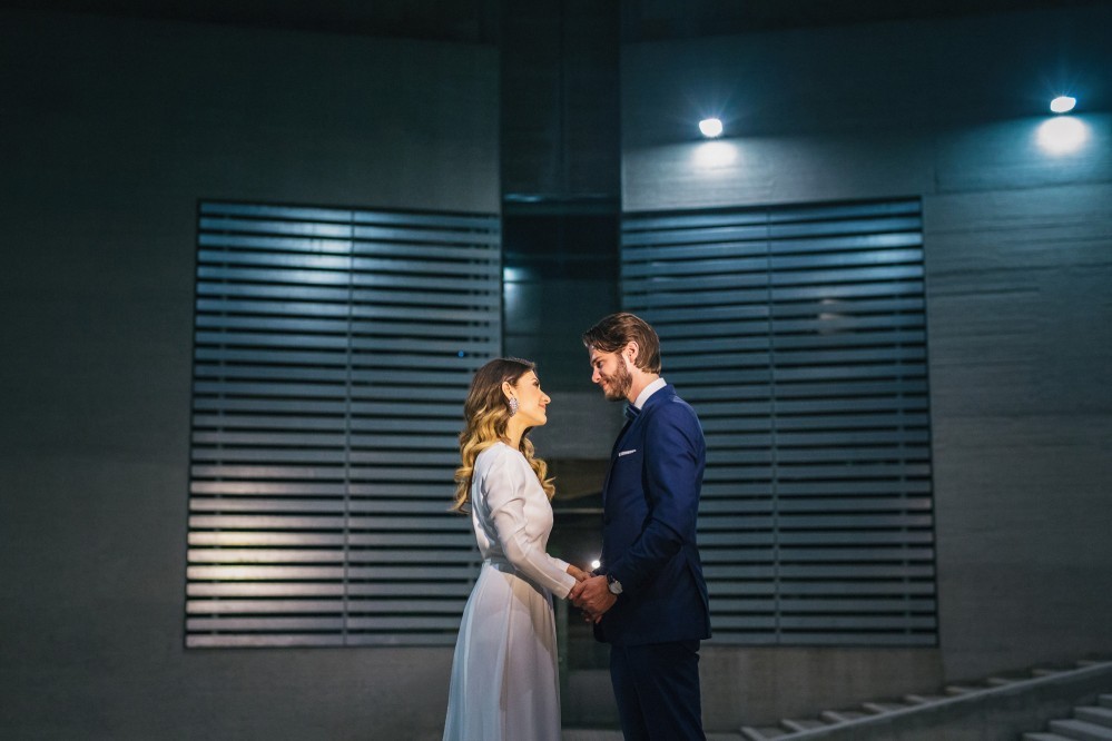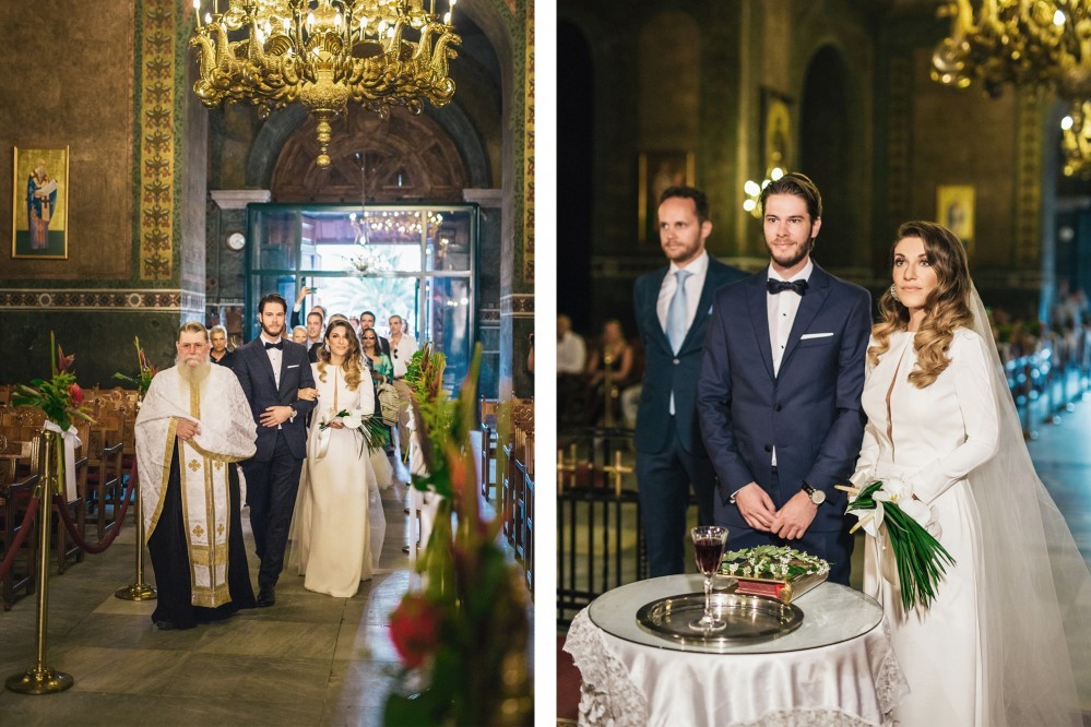 Maria chose a chic, minimal gown featuring clean lines. The design accentuated her figure with its open back and neck-to- navel slit on the front- yet retained its structural shape. The preparation of the bride took place in the family residence while the groom chose Hotel Nicopolis. Oscar wore a midnight blue three-piece that aligned with Maria’s style, creating thus an image of refined aesthetic and elegance.