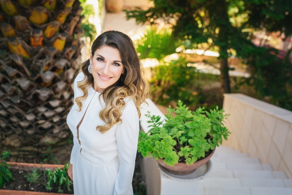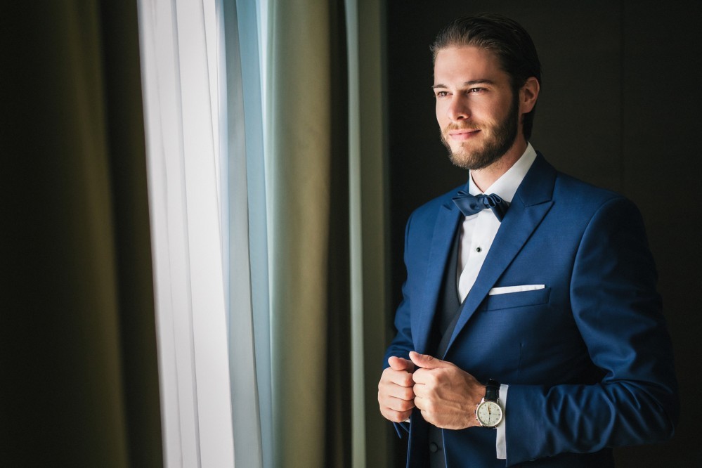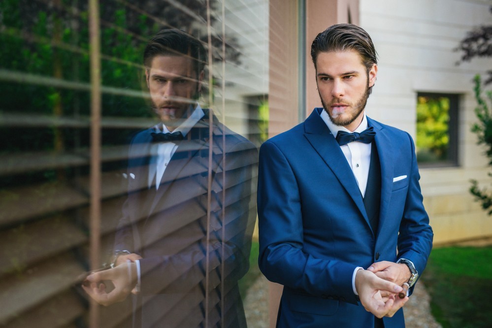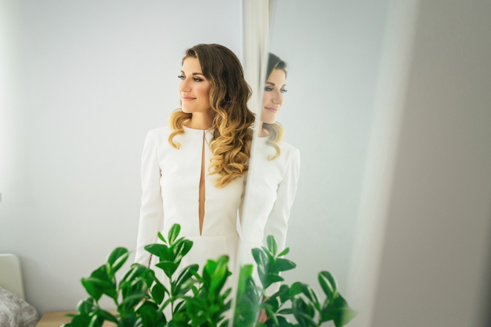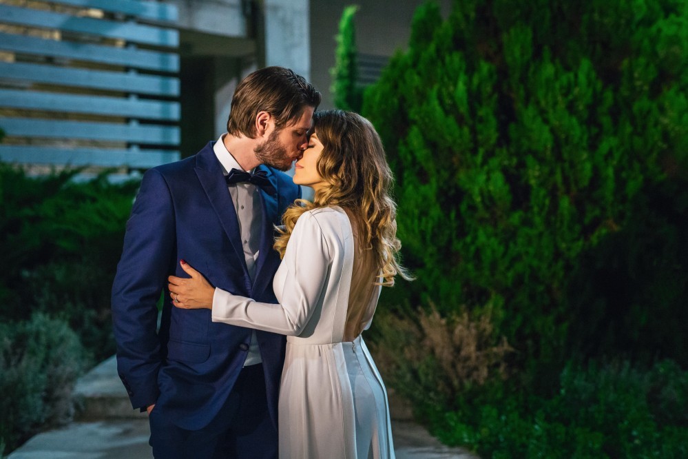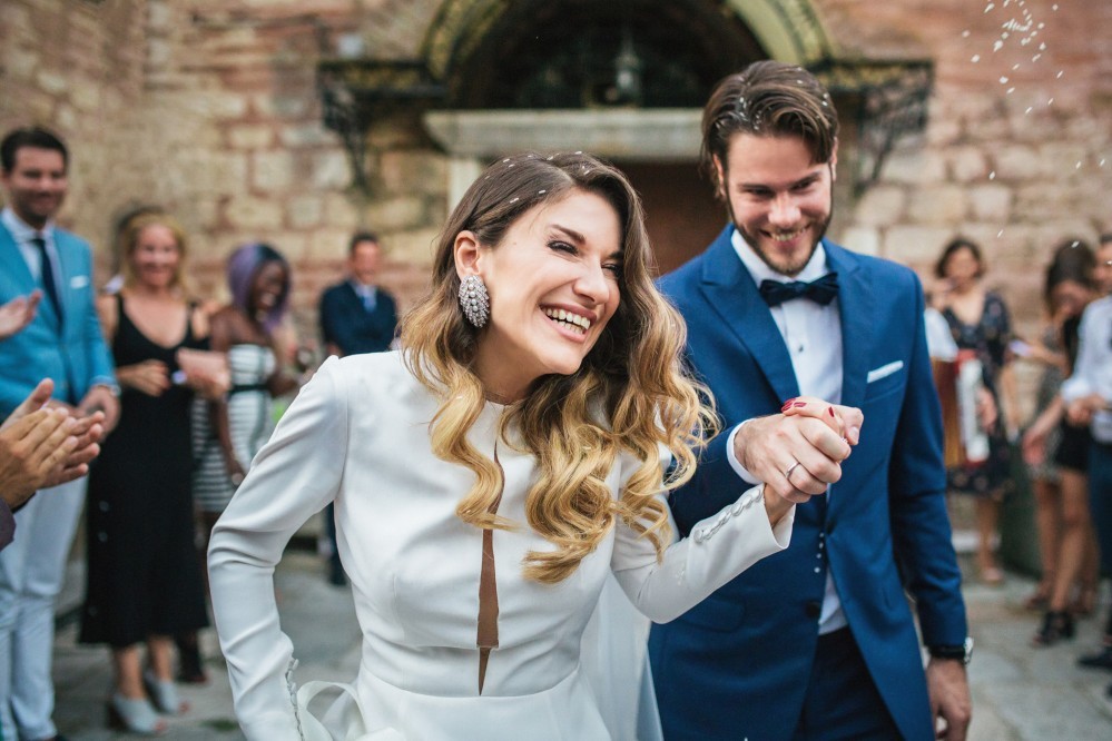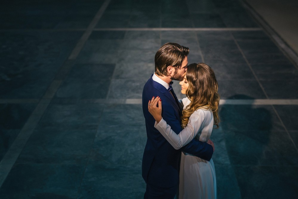 Maria chose a chic, minimal gown featuring clean lines. The design accentuated her figure with its open back and neck-to- navel slit on the front- yet retained its structural shape. The preparation of the bride took place in the family residence while the groom chose Hotel Nicopolis. Oscar wore a midnight blue three-piece that aligned with Maria’s style, creating thus an image of refined aesthetic and elegance.