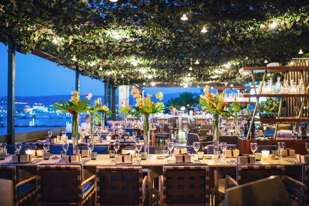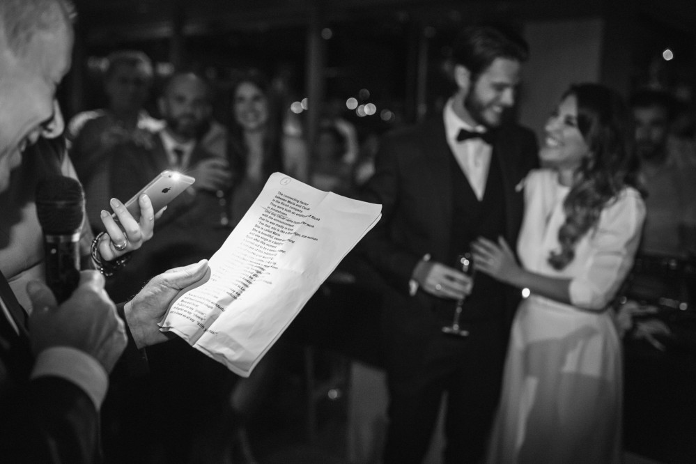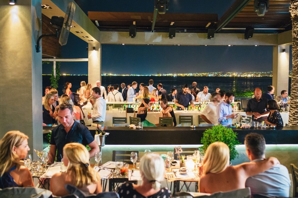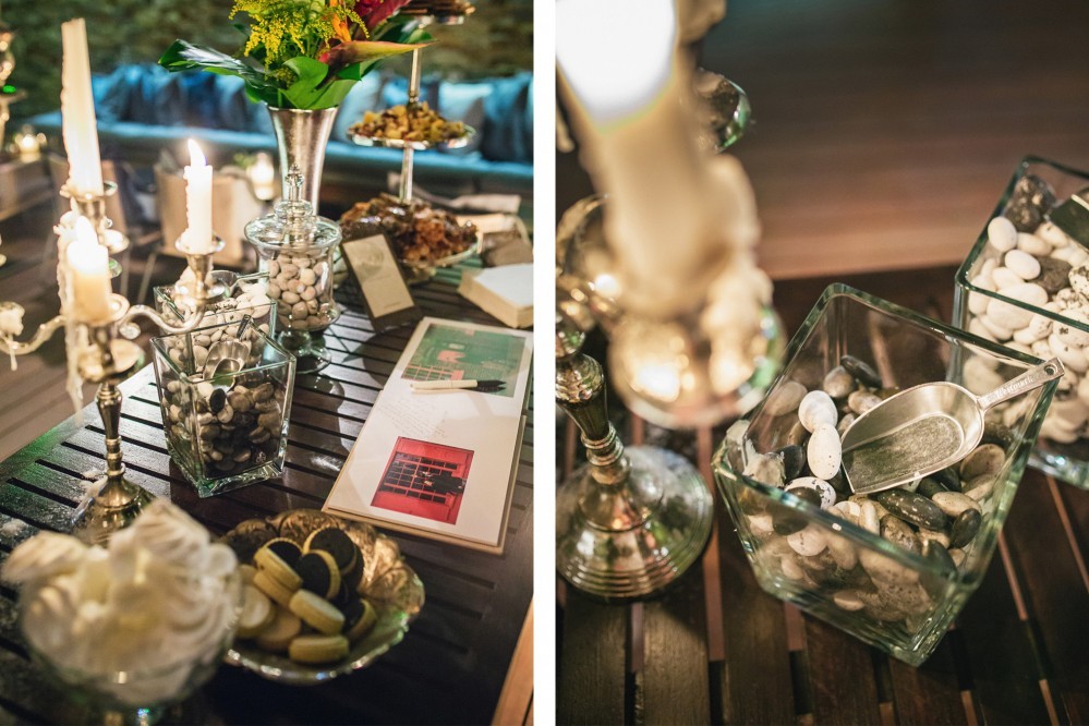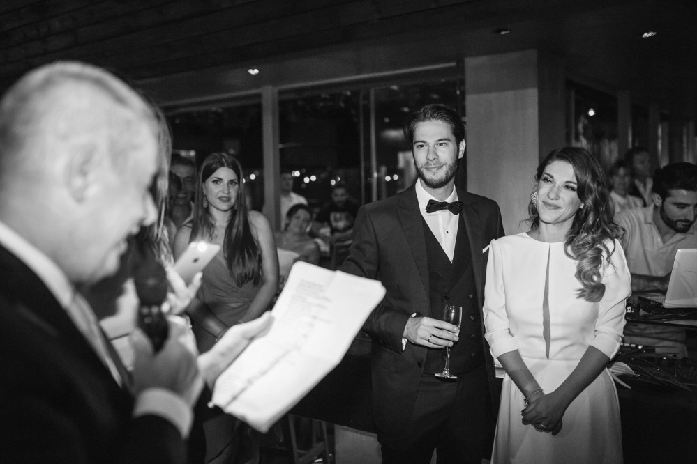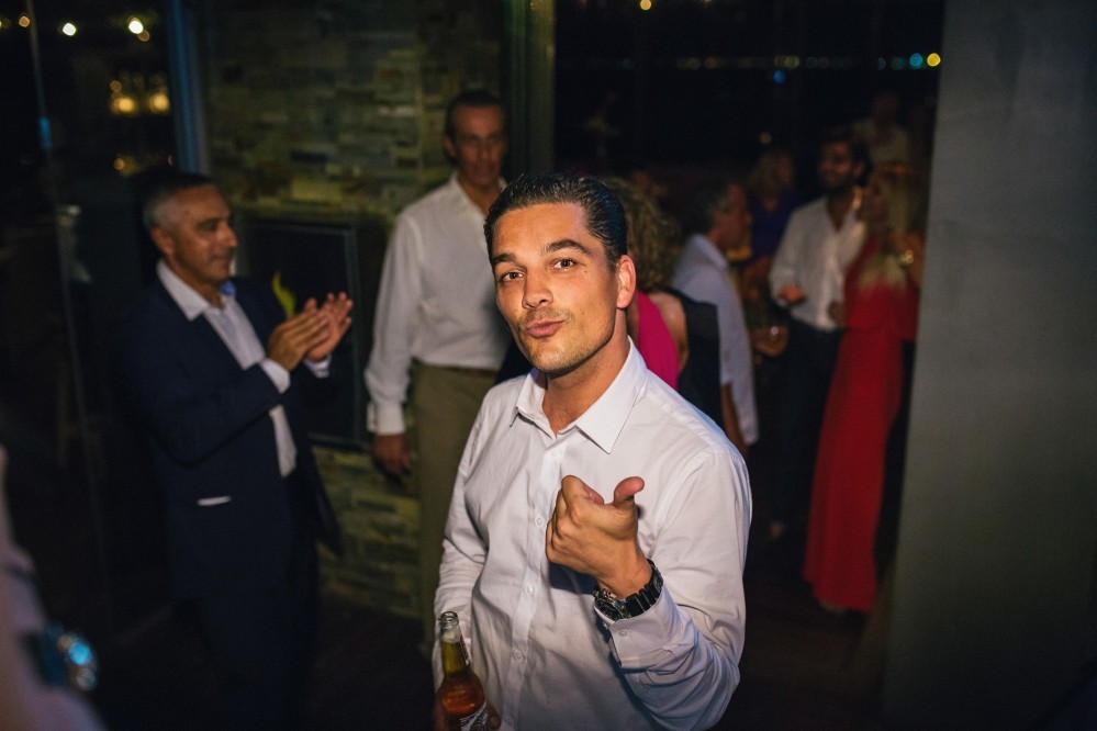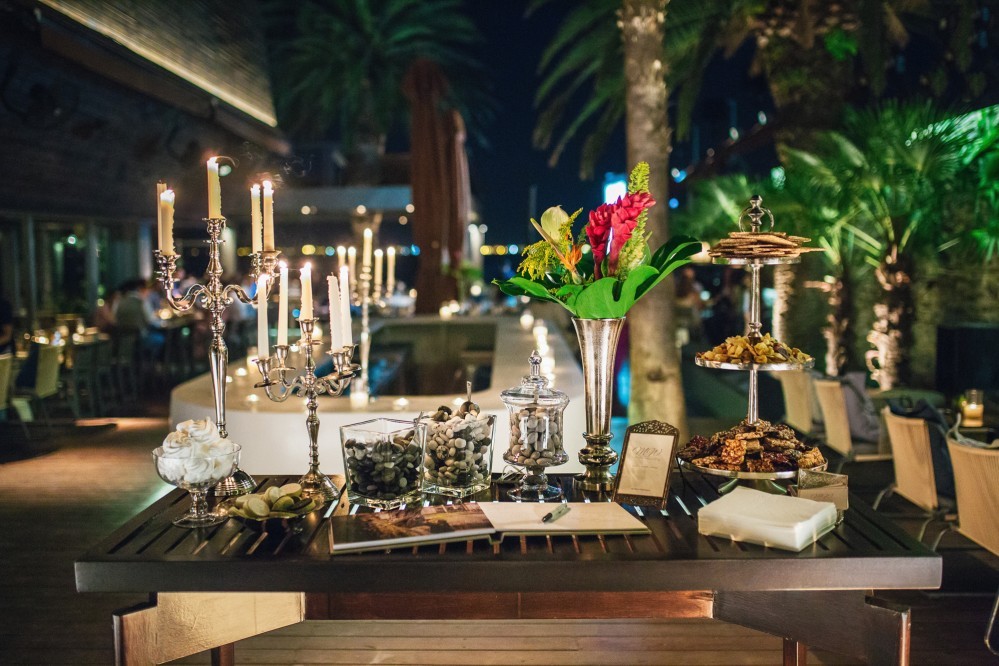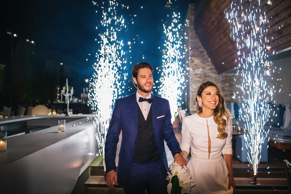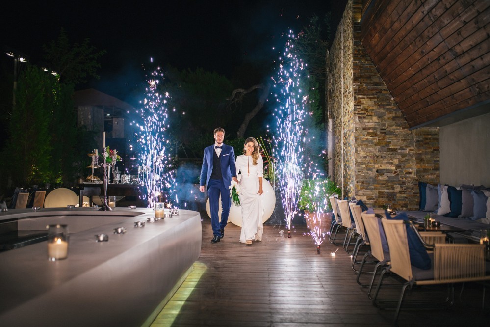 The wedding reception took place in one of the best seaside venues in town, Les Zazous Bar Restaurant. The city lights and the moon reflecting on the calm sea offered a splendid view. The decoration followed the wedding theme. Vases with fiery reds, vibrant oranges and lush greens were scattered around the space and on the dining tables. Candles and candelabras, silverware and a magnificent entrance table, offering a selection of wedding treats to those who filled in the wish book- all arranged by Mya Wedding and the couple’s planner Helena Paleologou. The wish book, as well as the pre-wedding video clip were shot in London. While the video clip was shown, the couple used the last bit of the song to make an entrance amid fireworks and a loud applause from the excited guests- a moment and sight I personally loved as a wedding photographer.