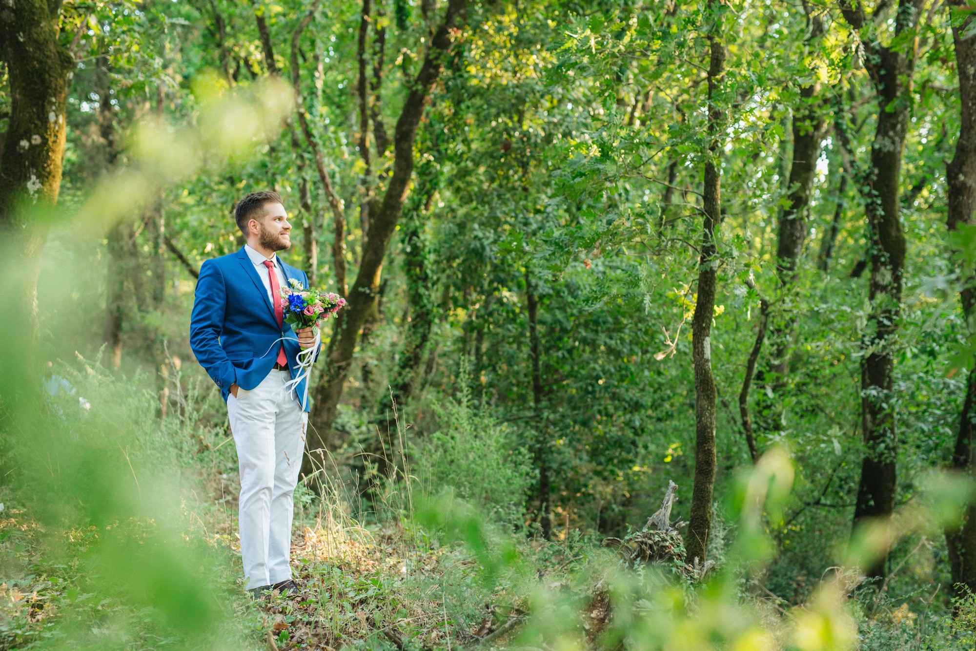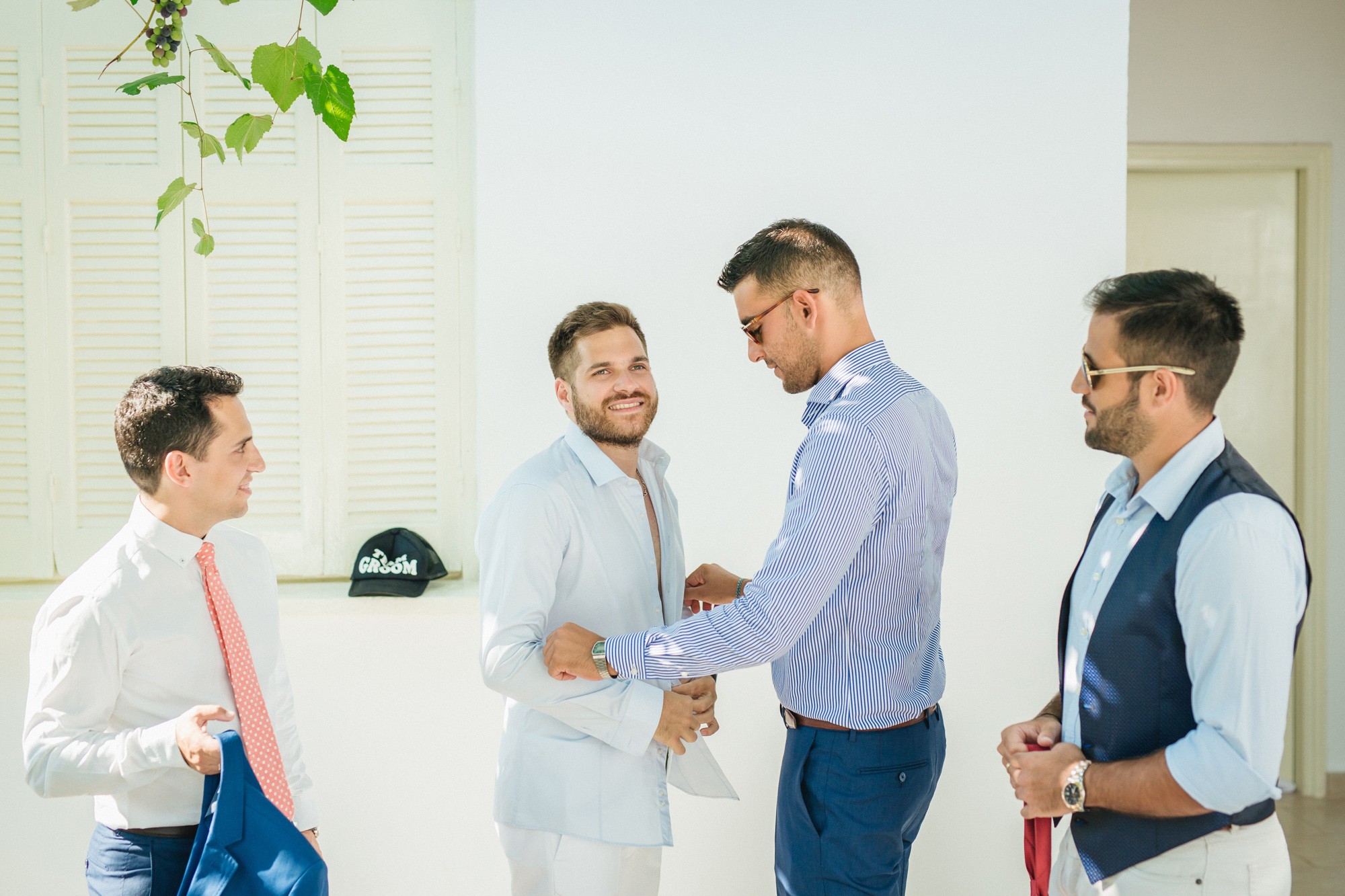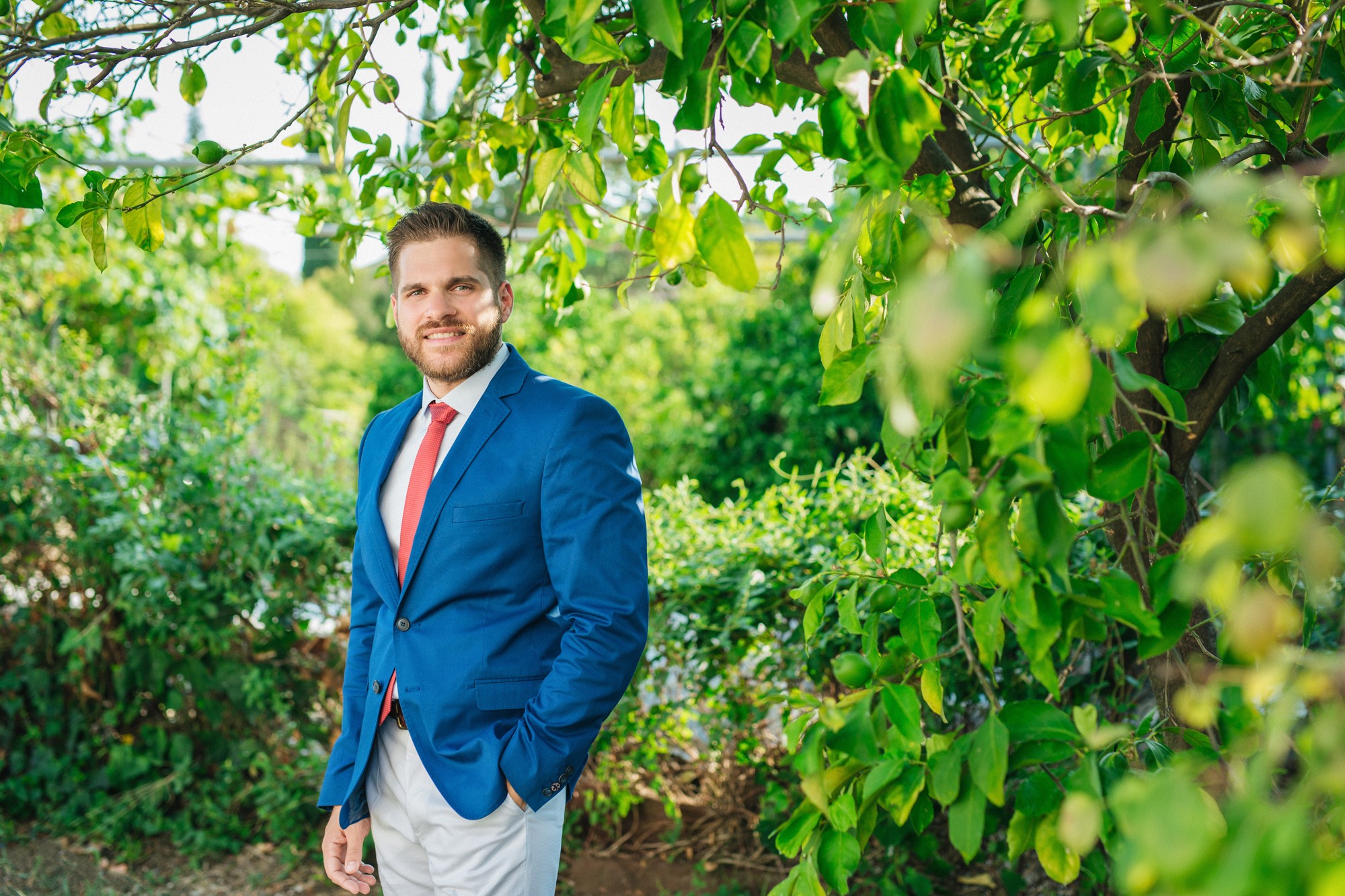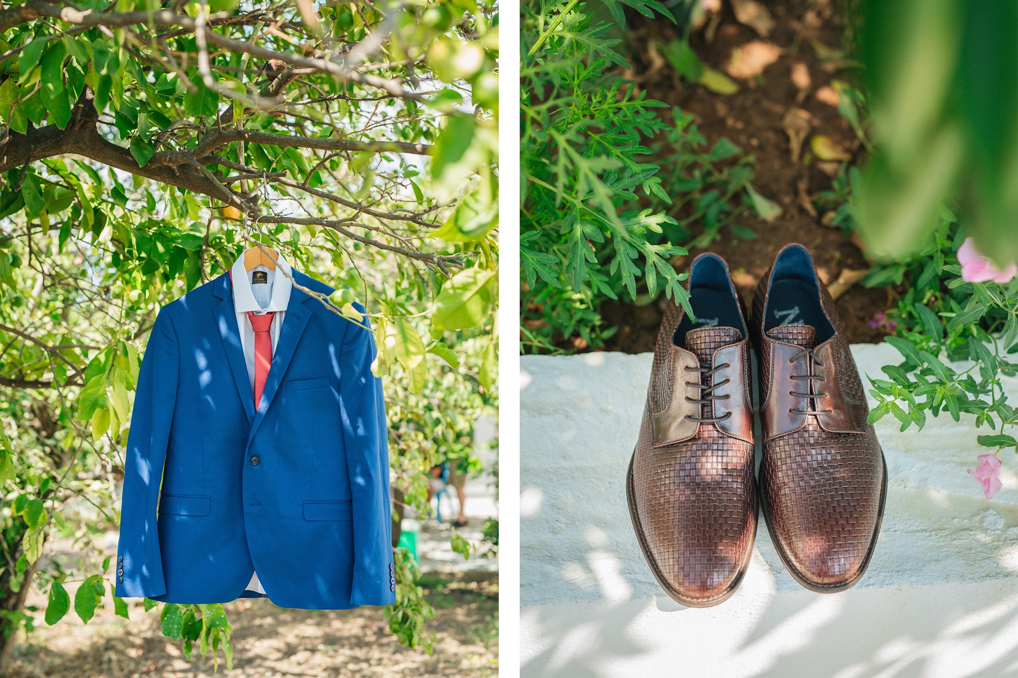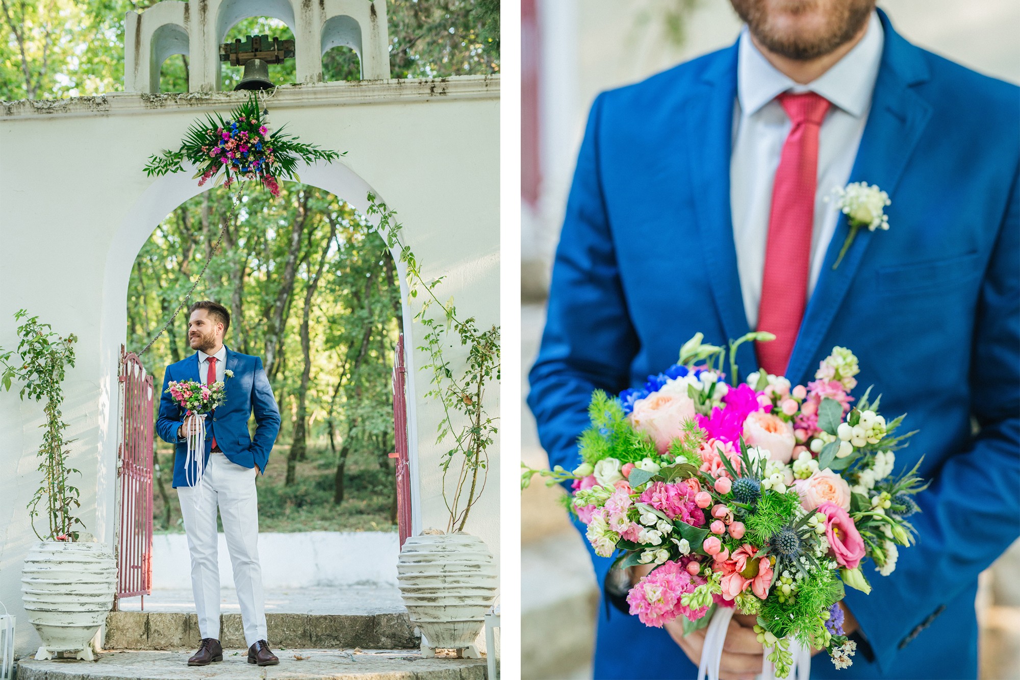Αντίστοιχα και ο Βασίλης, πρωτοτύπησε φορώντας ένα λευκό παντελόνι, συνδυασμένο με μπλε σακάκι και κόκκινη γραβάτα που απογείωσε την εμφάνισή του. Τα χρώματα στο ζευγάρι τόνισαν το νεαρό της ηλικίας τους, τη θετική τους διάθεση και δημιούργησαν τις πιο ¨ζωντανές¨ και ¨καθαρές¨ φωτογραφίες γάμου.
