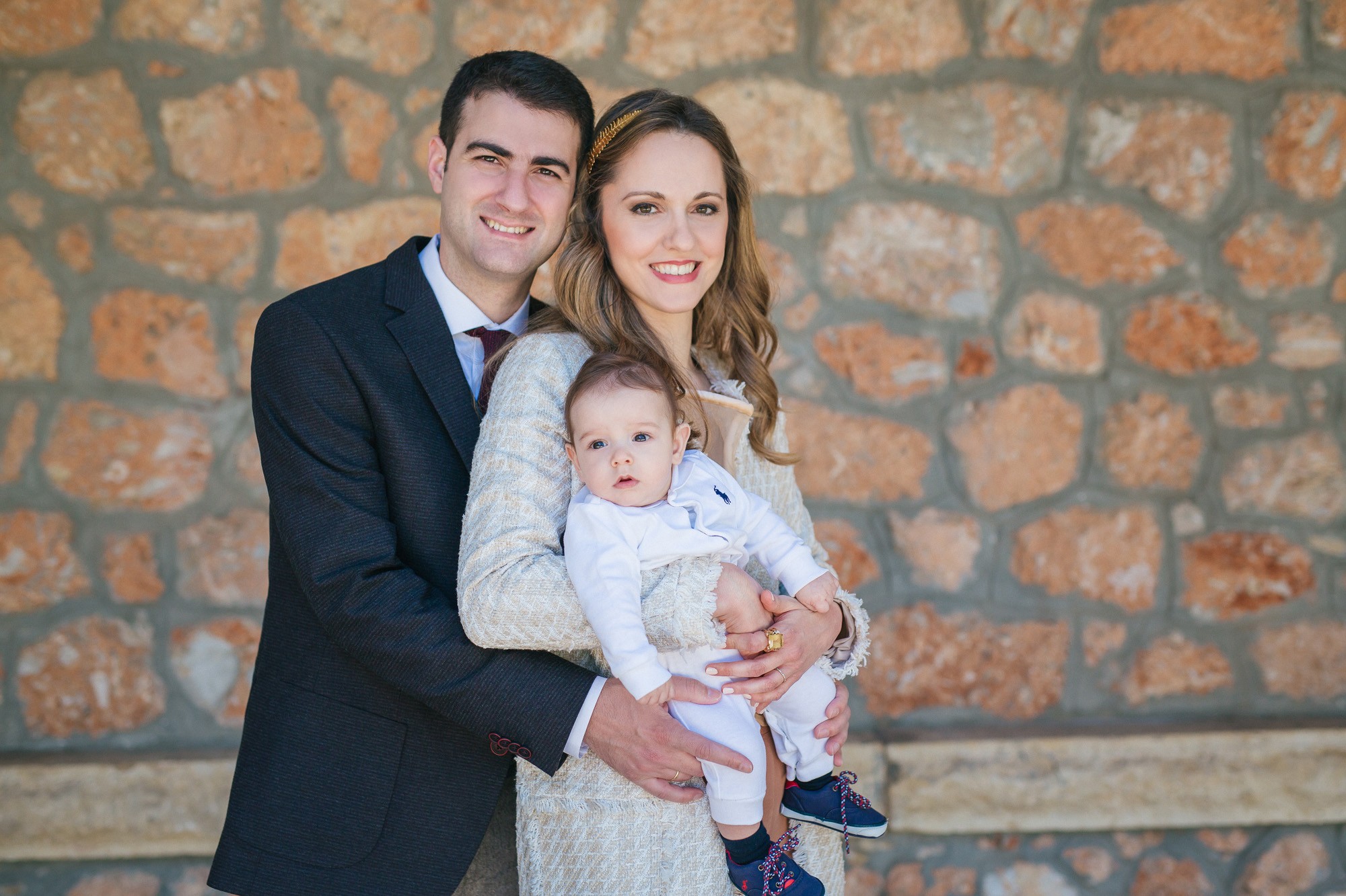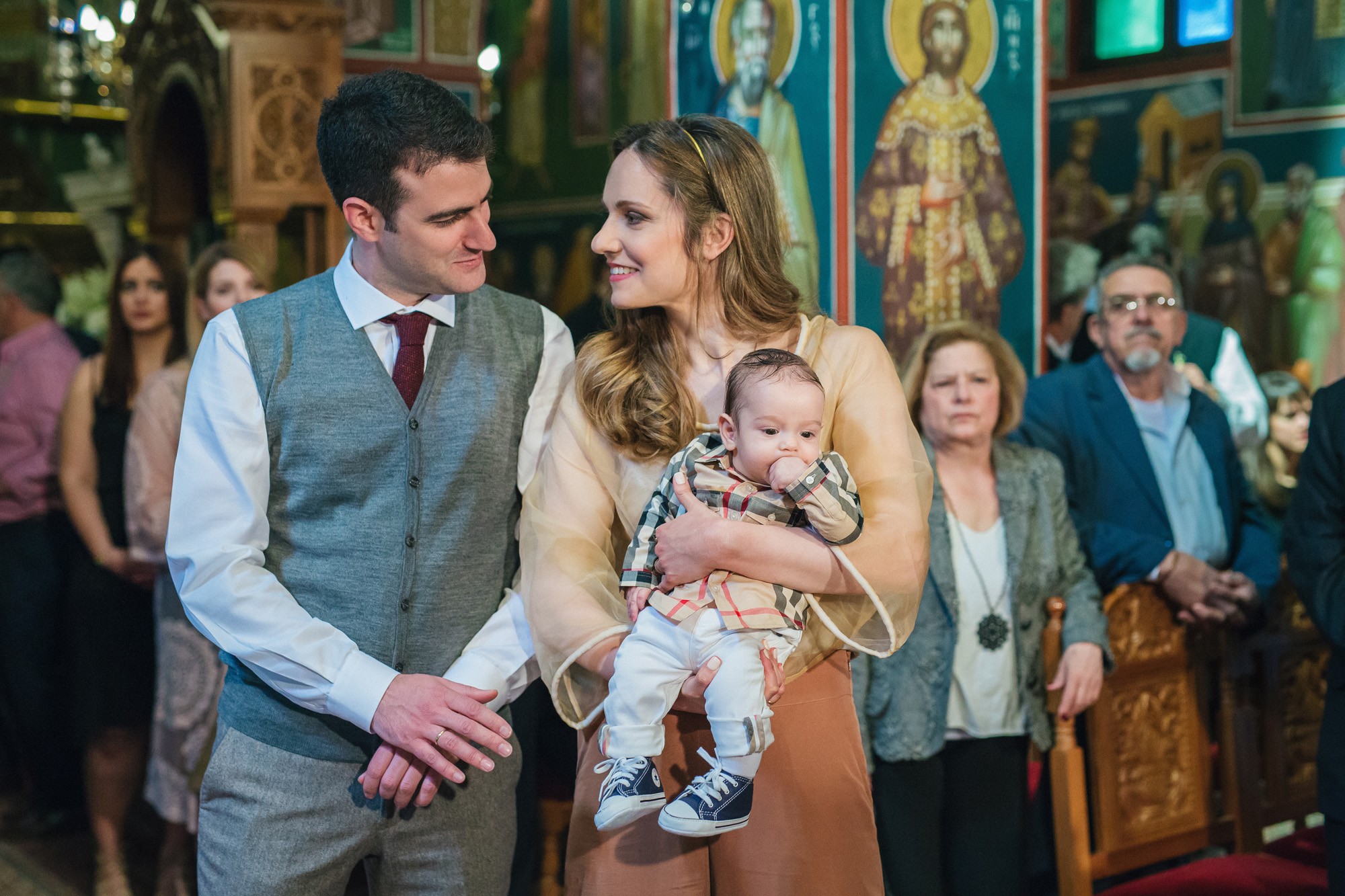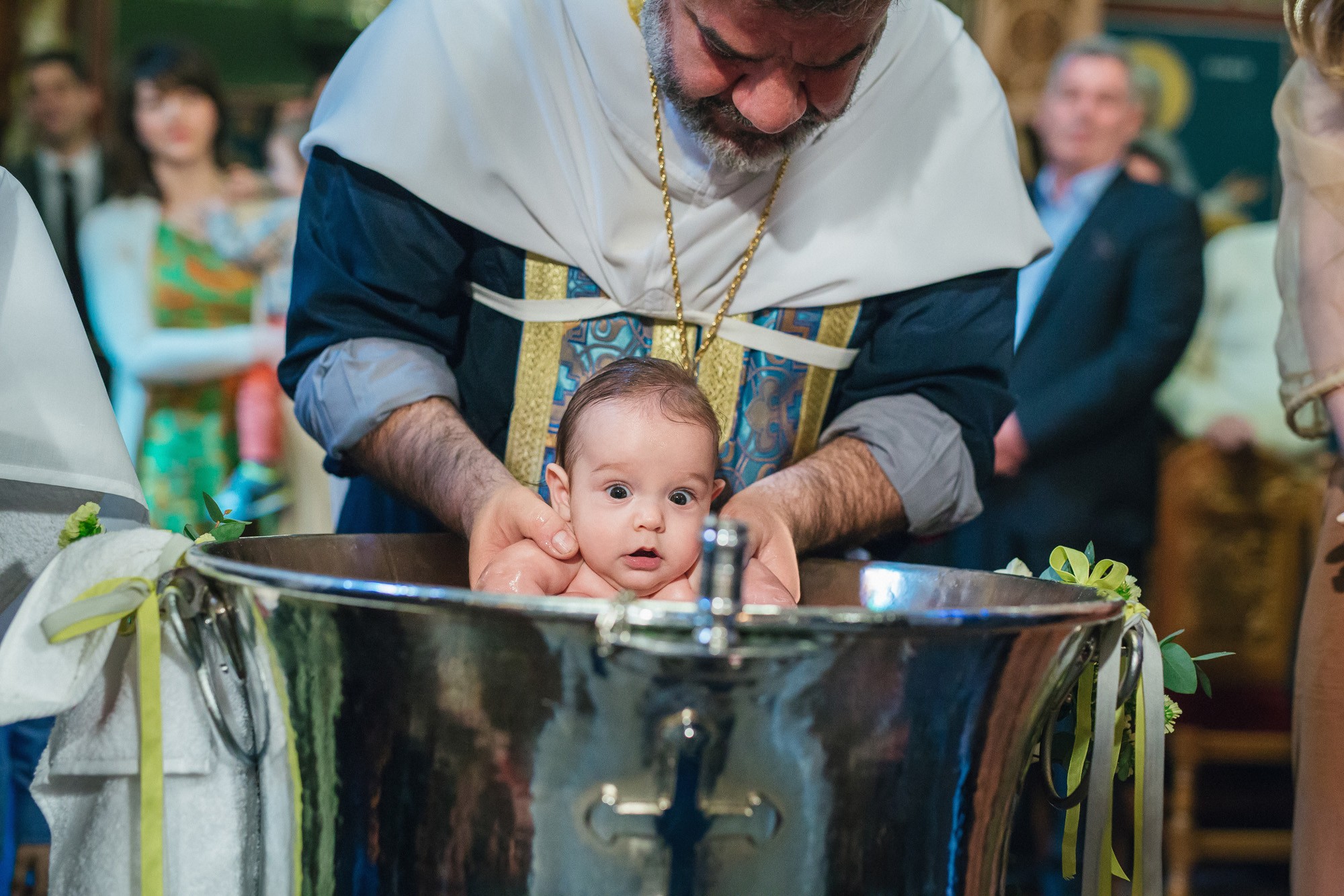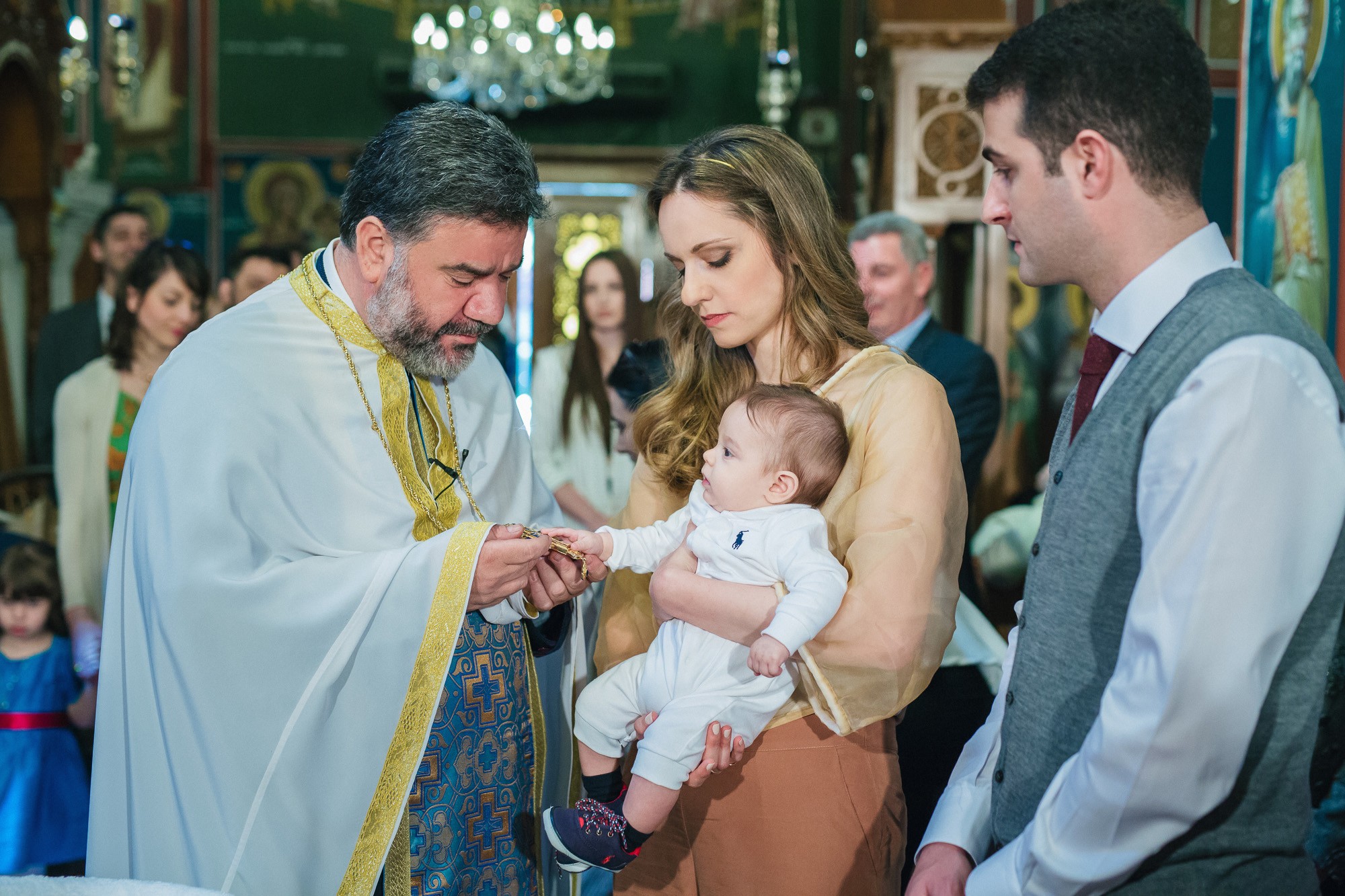 Οι γονείς και η νονά του Ευάγγελου στάθηκαν κοντά στον ιερέα και το μυστήριο έμελλε να ξεκινήσει. Και οι τρεις τους υπήρξαν κομψοί και λαμπεροί, πολύ ευτυχισμένοι με την παρουσία τους στον χώρο του ναού. Η κολυμπήθρα ήταν επίσης στολισμένη με κίτρινα τριαντάφυλλα όπως και ο εξωτερικός χώρος. Ο Ευάγγελος δεν έκλαψε σχεδόν καθόλου με τις βουτιές στην κολυμπήθρα προς έκπληξη όλων, ενώ μας χάρισε πολύ αστείες εκφράσεις στην φωτογράφιση της βάπτισης.