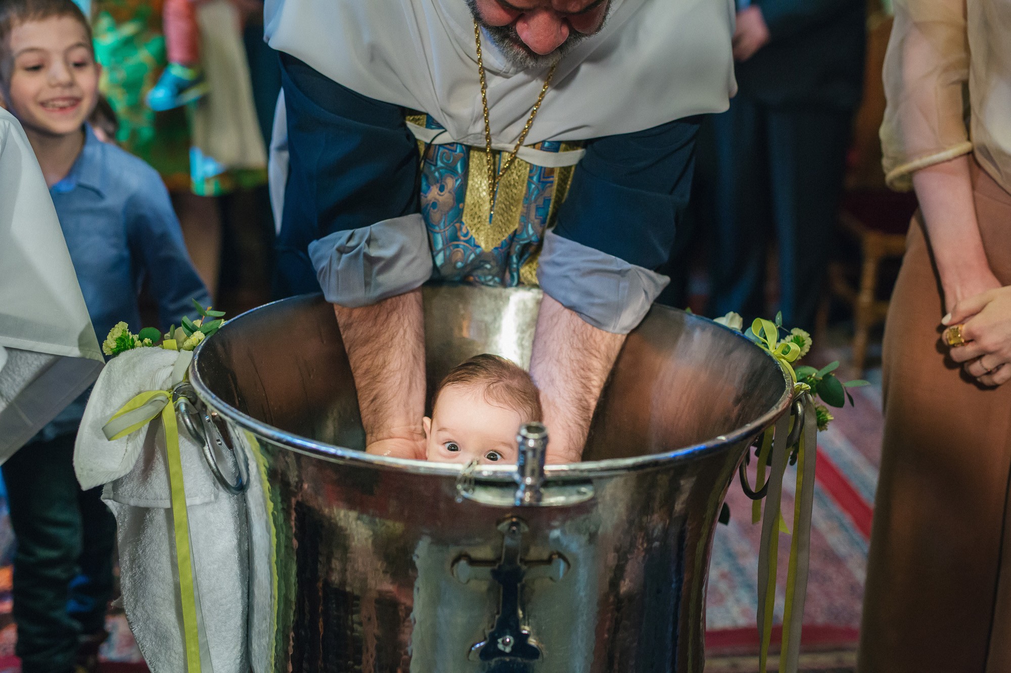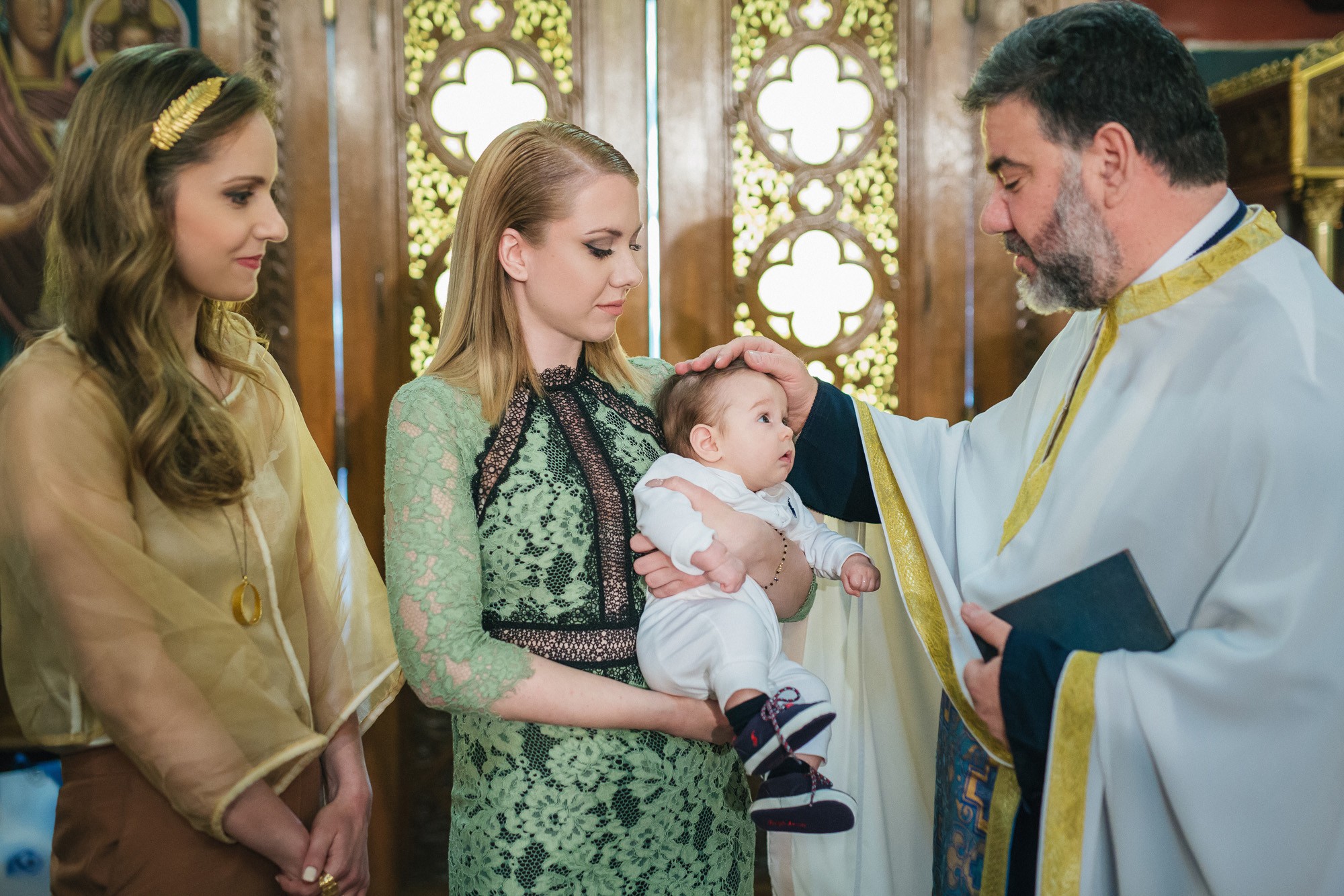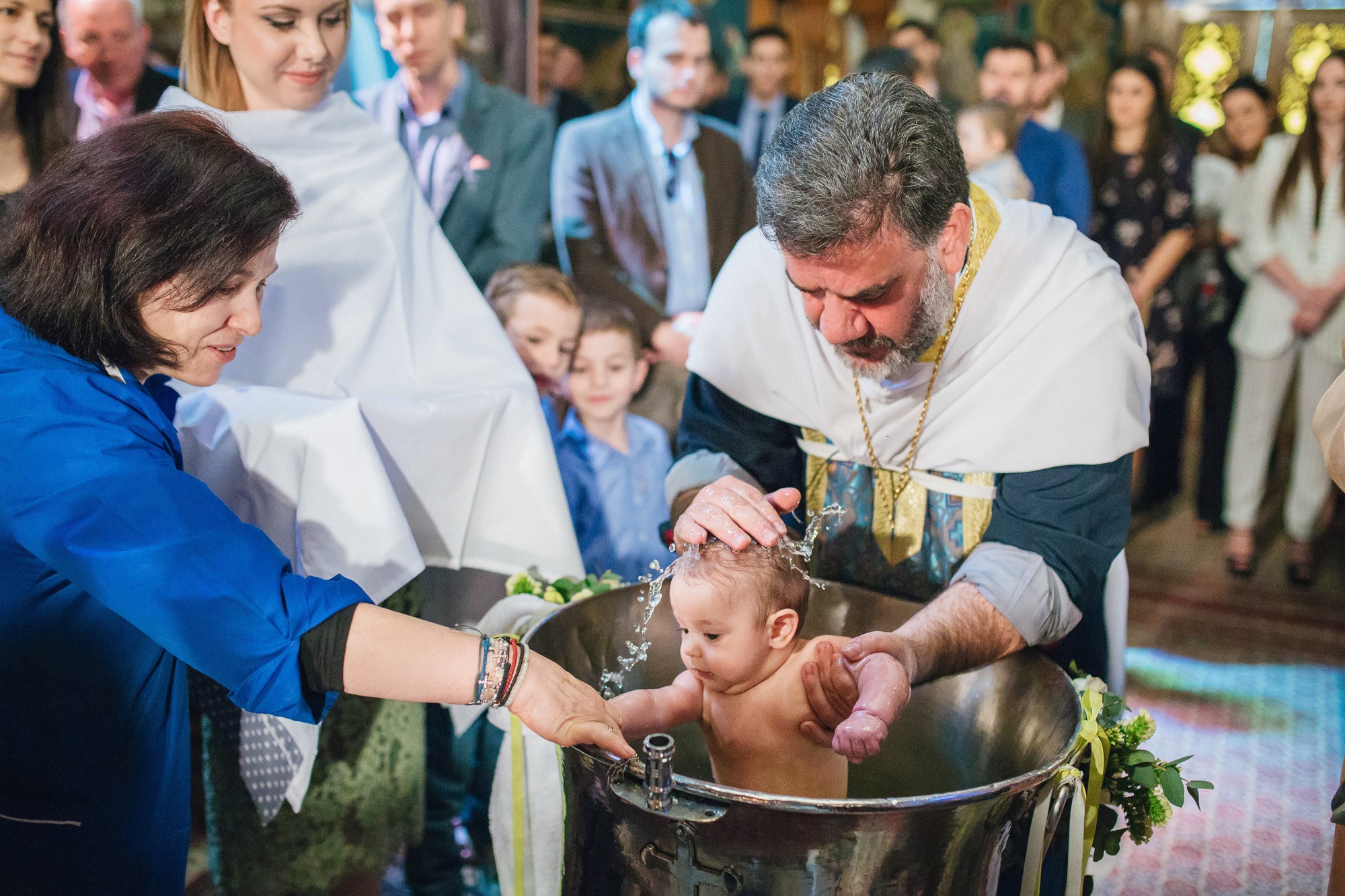 Οι γονείς και η νονά του Ευάγγελου στάθηκαν κοντά στον ιερέα και το μυστήριο έμελλε να ξεκινήσει. Και οι τρεις τους υπήρξαν κομψοί και λαμπεροί, πολύ ευτυχισμένοι με την παρουσία τους στον χώρο του ναού. Η κολυμπήθρα ήταν επίσης στολισμένη με κίτρινα τριαντάφυλλα όπως και ο εξωτερικός χώρος. Ο Ευάγγελος δεν έκλαψε σχεδόν καθόλου με τις βουτιές στην κολυμπήθρα προς έκπληξη όλων, ενώ μας χάρισε πολύ αστείες εκφράσεις στην φωτογράφιση της βάπτισης.