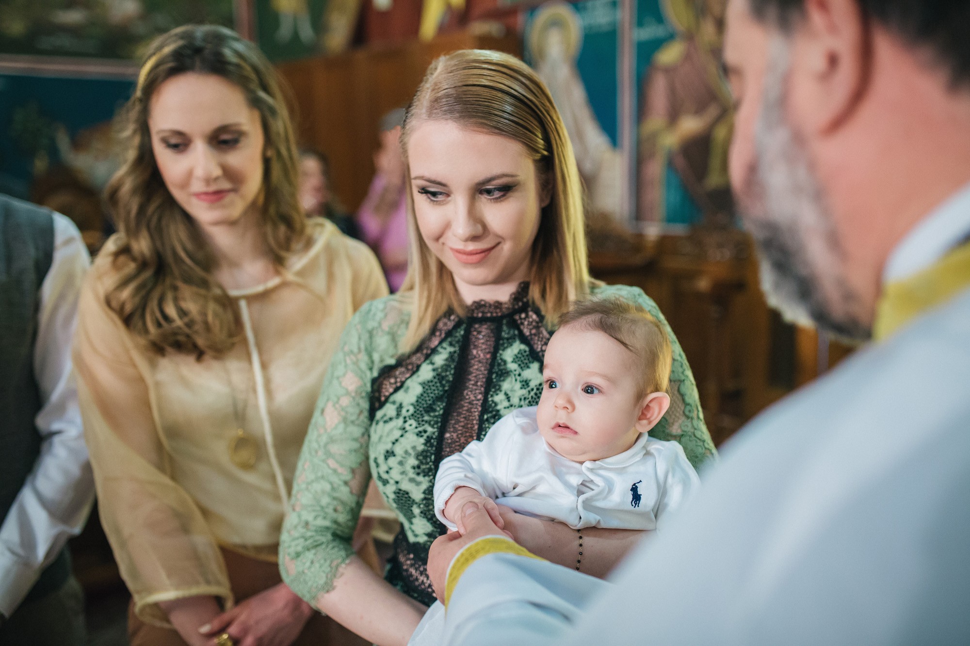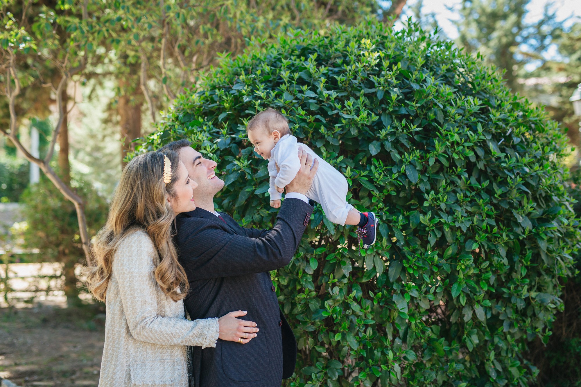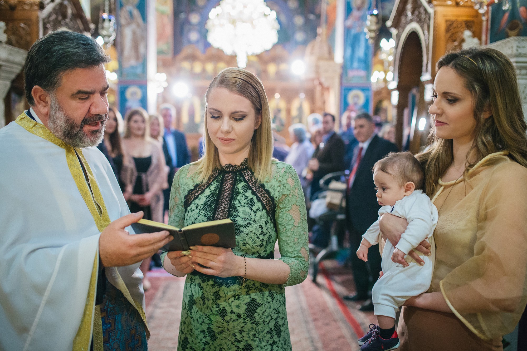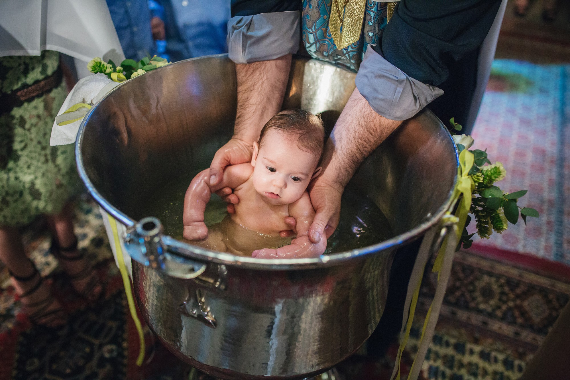 Οι γονείς και η νονά του Ευάγγελου στάθηκαν κοντά στον ιερέα και το μυστήριο έμελλε να ξεκινήσει. Και οι τρεις τους υπήρξαν κομψοί και λαμπεροί, πολύ ευτυχισμένοι με την παρουσία τους στον χώρο του ναού. Η κολυμπήθρα ήταν επίσης στολισμένη με κίτρινα τριαντάφυλλα όπως και ο εξωτερικός χώρος. Ο Ευάγγελος δεν έκλαψε σχεδόν καθόλου με τις βουτιές στην κολυμπήθρα προς έκπληξη όλων, ενώ μας χάρισε πολύ αστείες εκφράσεις στην φωτογράφιση της βάπτισης.