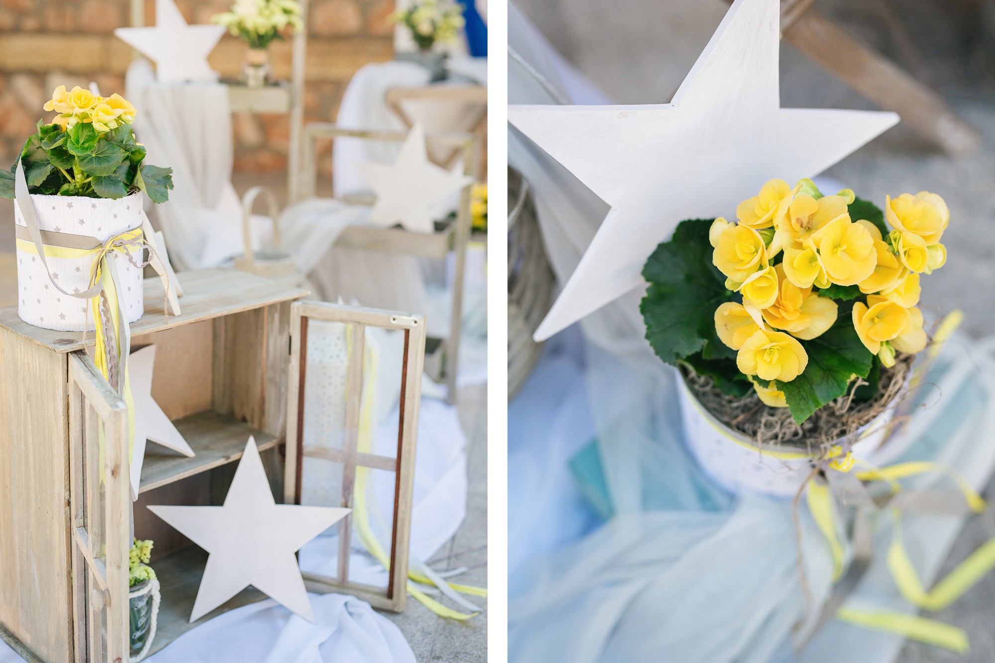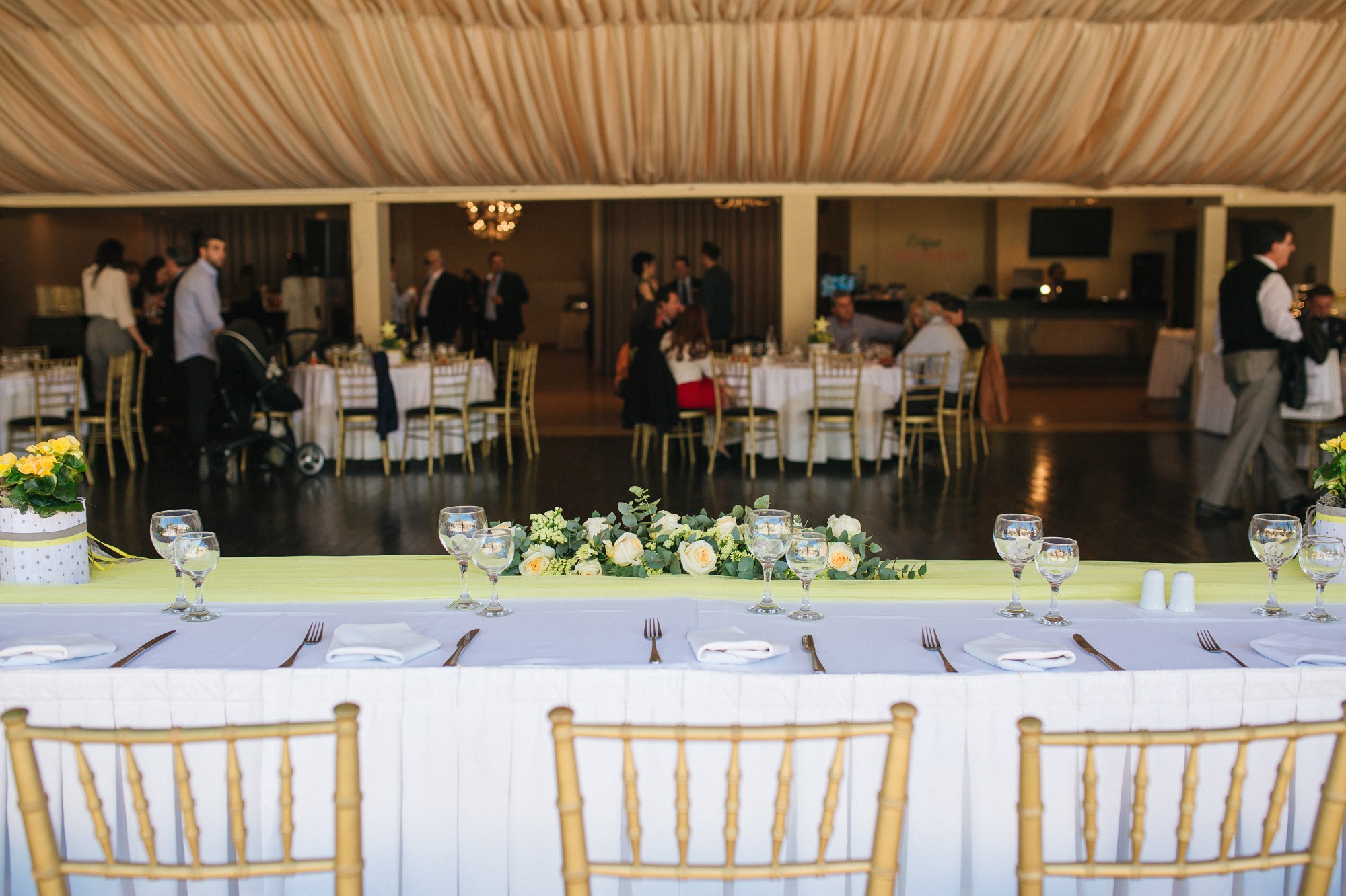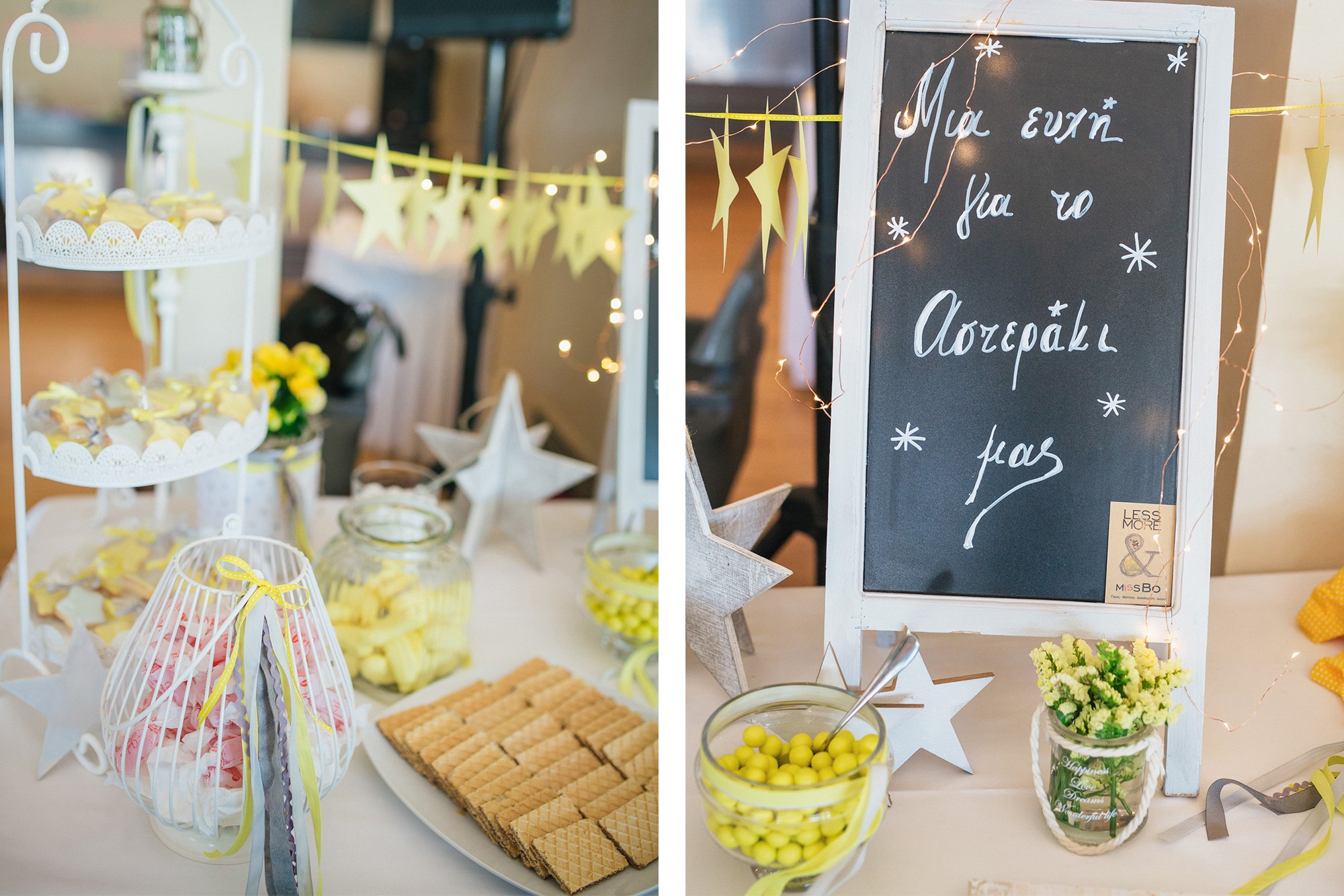 Αφού τελείωσε το μυστήριο, το Κτήμα ΝΙΚΟΛΕΛΗ ήταν η επόμενη στάση συγγενών και φίλων, όπου θα γίνονταν το τραπέζι της βάπτισης. Ο χώρος είχε στολιστεί άψογα διατηρώντας το ύφος του γενικού στολισμού σε αποχρώσεις του κίτρινου και το αστέρι ως βασικό σχήμα. Το ευχολόγιο του Ευάγγελου, τοποθετημένο στην υποδοχή έμελε να γεμίσει με ευχές από όλα τα πρόσωπα που τον αγαπούν. Στον χώρο υπήρξε φυσικά και παιδότοπος για την ευχαρίστηση όλων των παιδιών ενώ οι ενήλικες αφού έφαγαν χόρεψαν και διασκέδασαν κι εκείνοι. Η ημέρα έκλεισε με οικογενειακή φωτογράφιση και πολύ μεγάλα χαμόγελα.