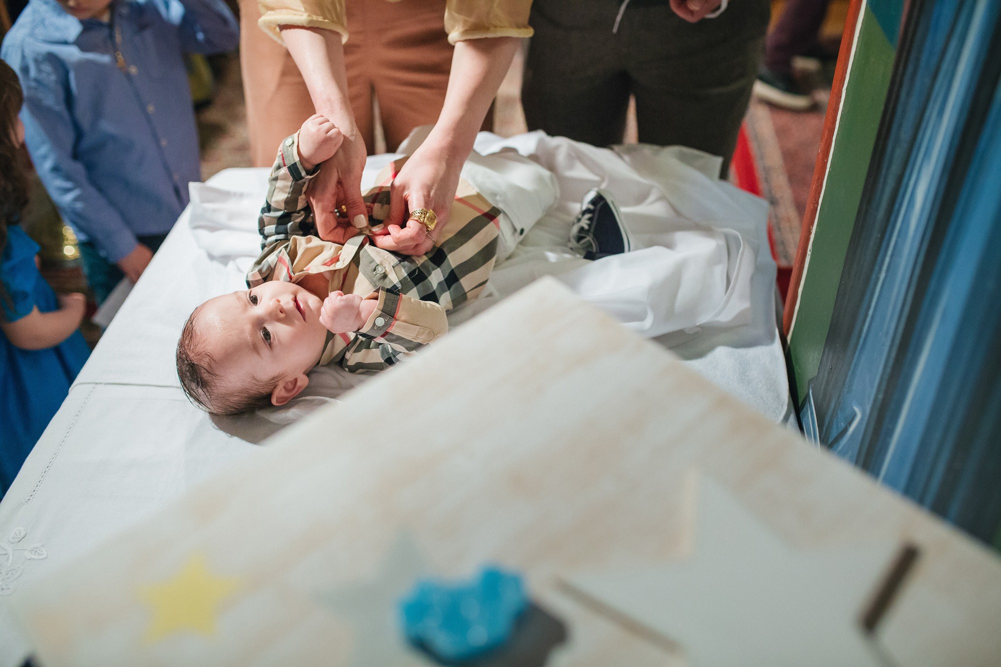 O Ευάγγελος βαπτίστηκε τέλη Μαρτίου του 2017. Ο χειμώνας μάς είχε πια αποχαιρετήσει και η φύση ξαναζωντάνευε ενώ η άνοιξη έκανε σιγά σιγά την εμφάνισή της. Η λιακάδα και ο ζεστός καιρός ήταν το πιο όμορφο ξεκίνημα για να συνεχίσει ευχάριστα η μέρα όλων για την βάπτιση του Ευάγγελου. Η οικογένεια με υποδέχτηκε στο σπίτι της στην Εκάλη, Αθηνών. Οι γονείς του μικρού ήταν, όπως θα περίμενε κανείς, πολύ χαρούμενοι και πολύ συγκινημένοι με το γεγονός. Ο Ευάγγελος μαζί με τον μεγαλύτερο αδερφό του φωτογραφήθηκαν στο χαριτωμένο παιδικό δωμάτιό τους και στη συνέχεια όλοι ετοιμάστηκαν για να οδηγηθούν προς την εκκλησία.