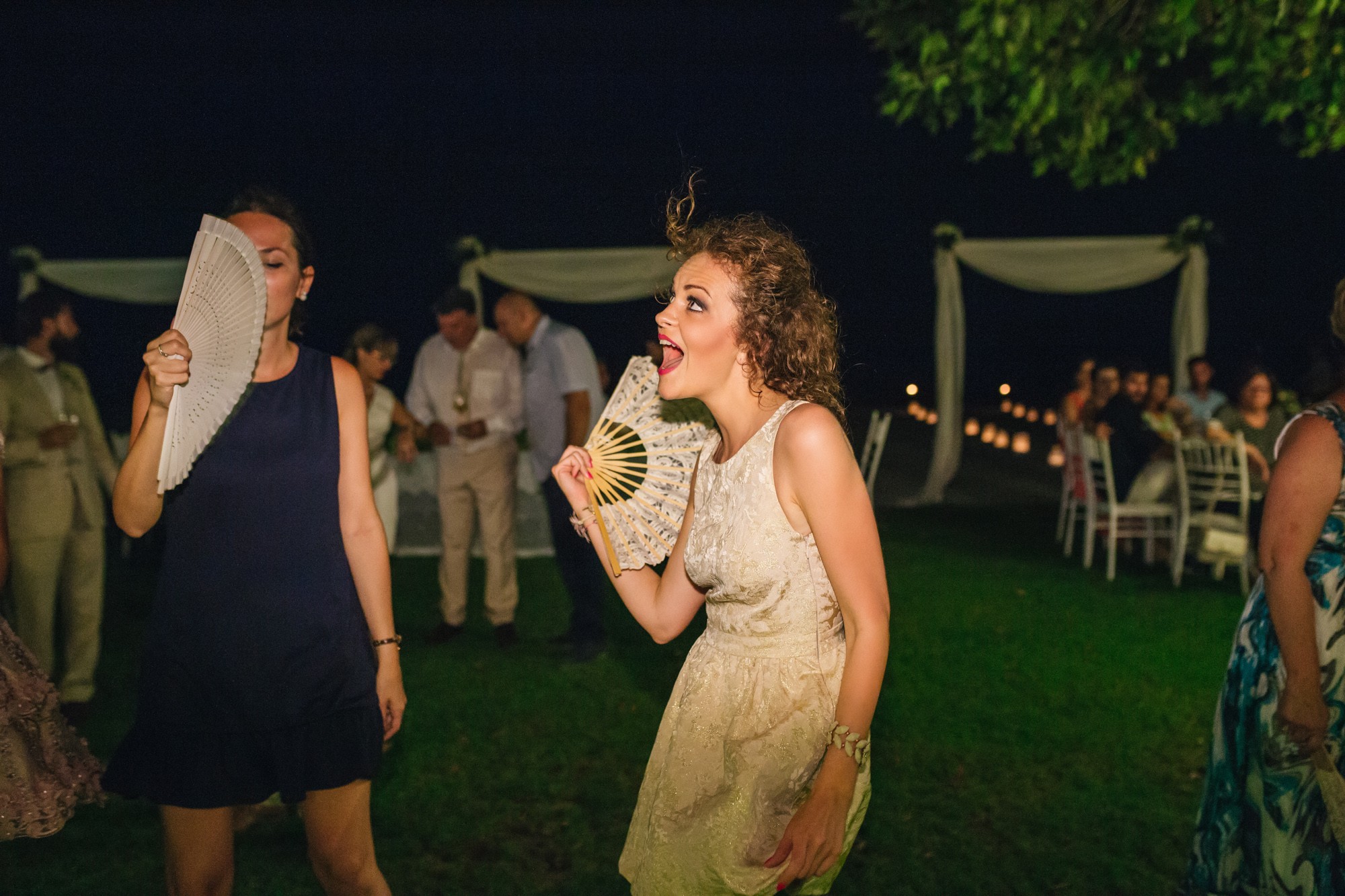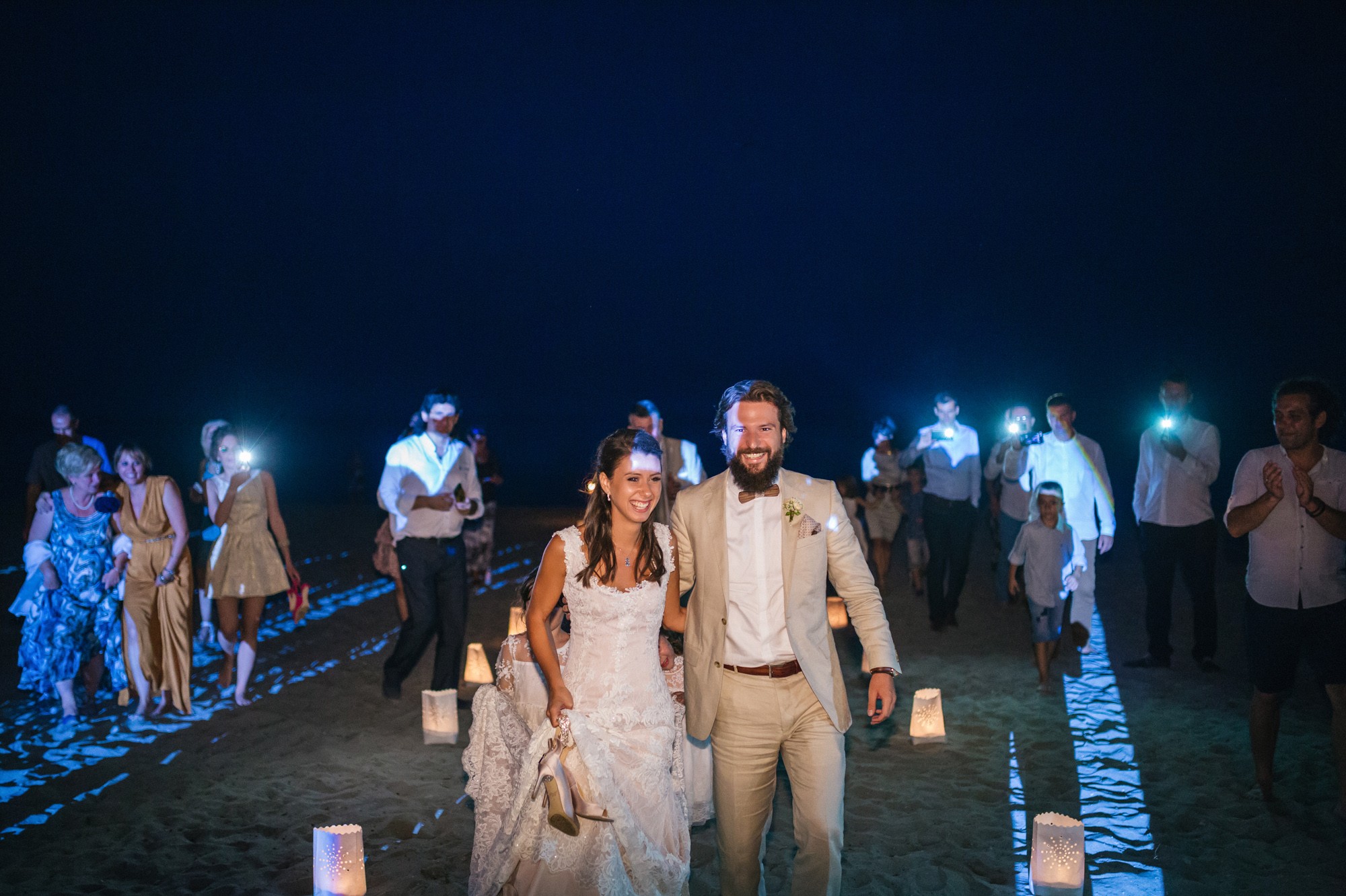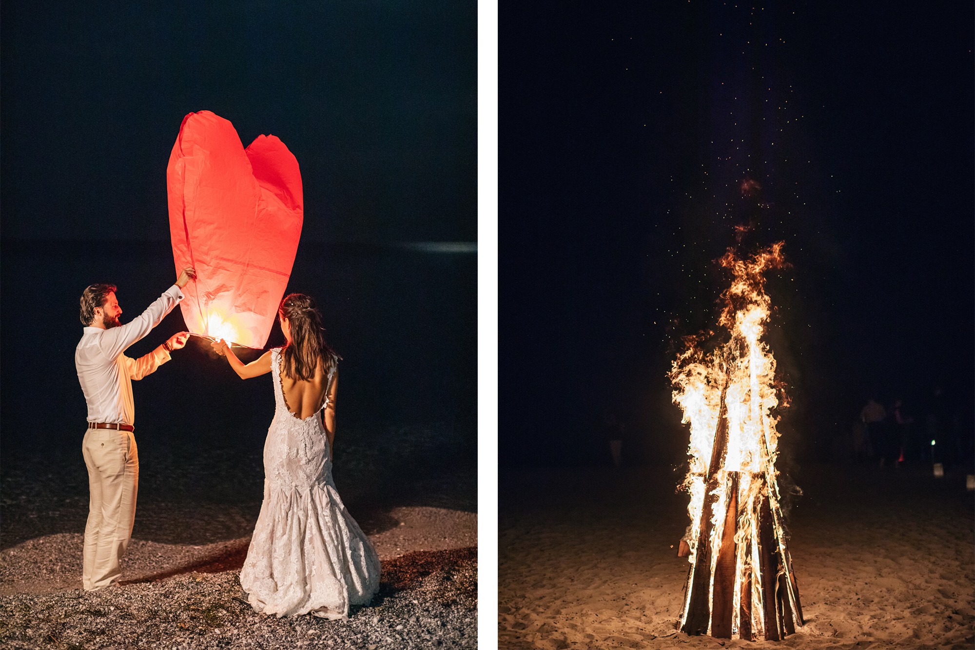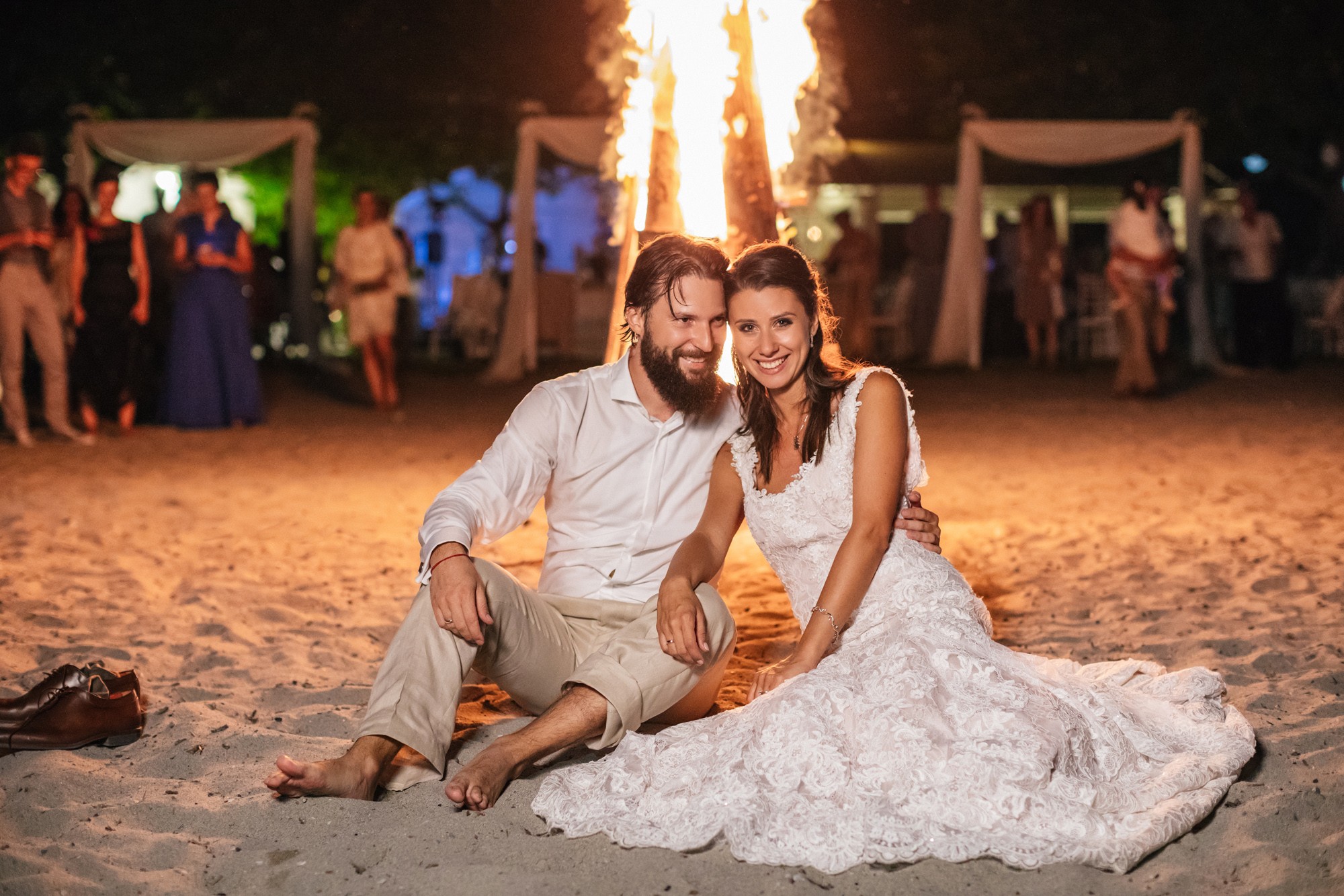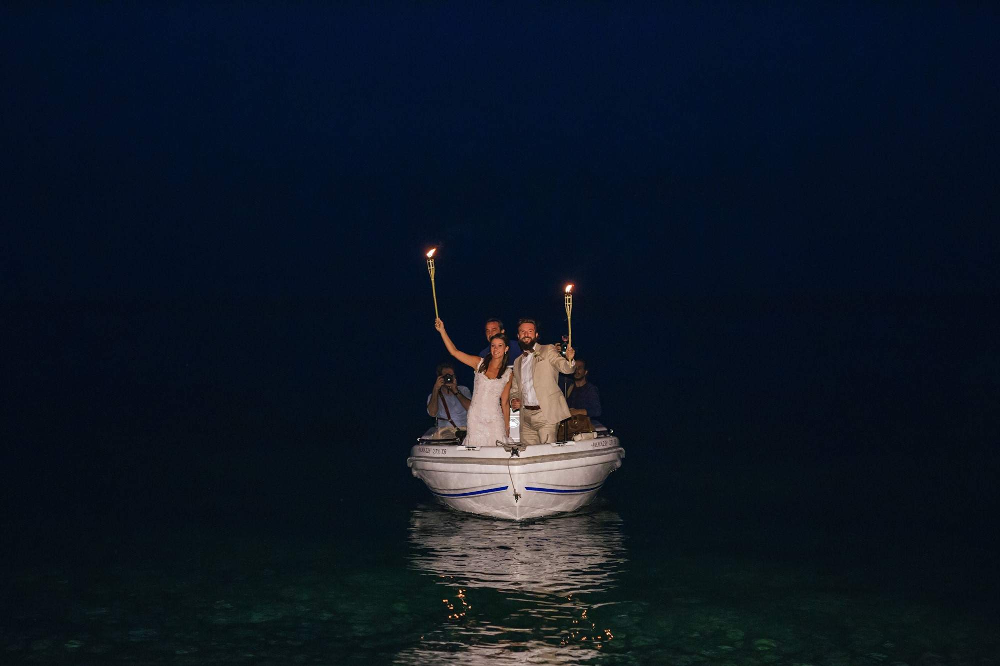 Οι καλεσμένοι περίμεναν το ζευγάρι στο Κτήμα Φαργκάνη και οι νεόνυμφοι κατέφθασαν εντυπωσιακά μέσα από τη θάλασσα με βαρκάκι. Η διάθεση που δημιουργήθηκε θύμιζε ένα πετυχημένο beach party γεμάτο ενέργεια και κέφι. Οι καλεσμένοι μαζί με το ζευγάρι άναψαν μια μεγάλη φωτιά στην παραλία και στη συνέχεια φώτισαν τον ουρανό με πανέμορφα κόκκινα φαναράκια. Οι φωτογραφίες αυτής της ρομαντικής στιγμής θα μας μείνουν αξέχαστες.