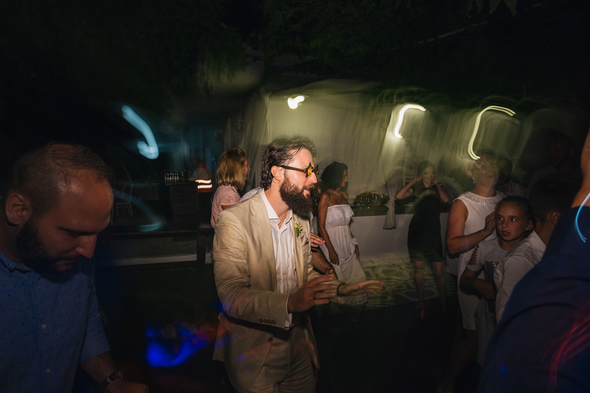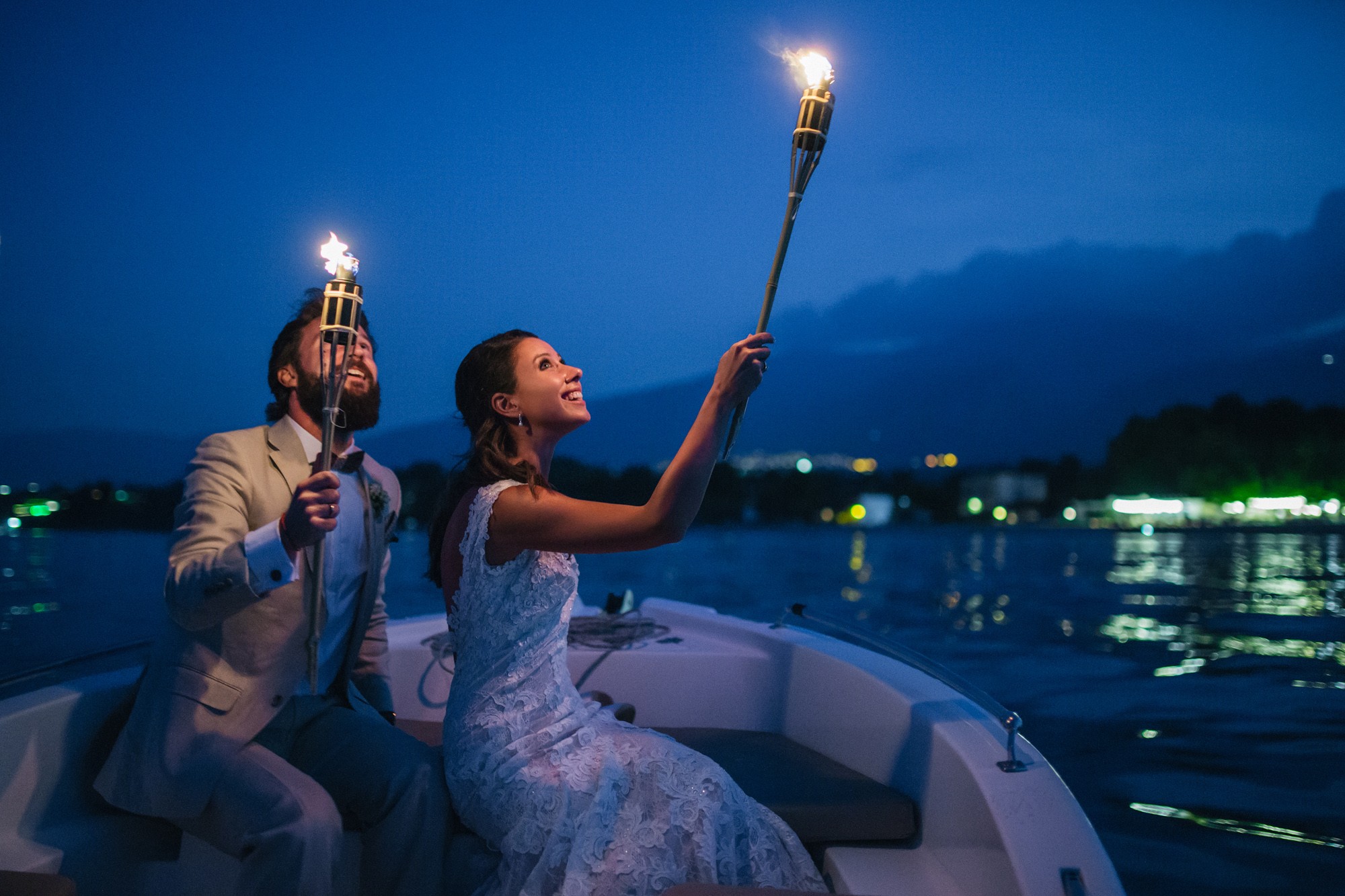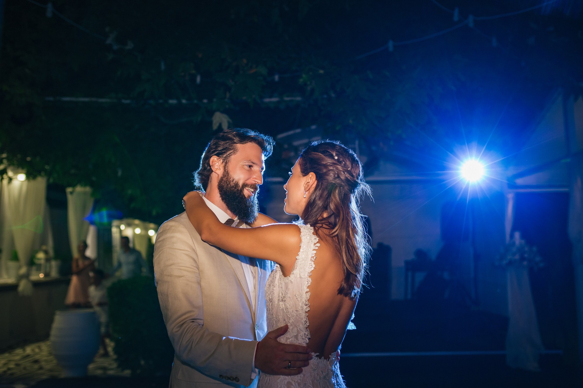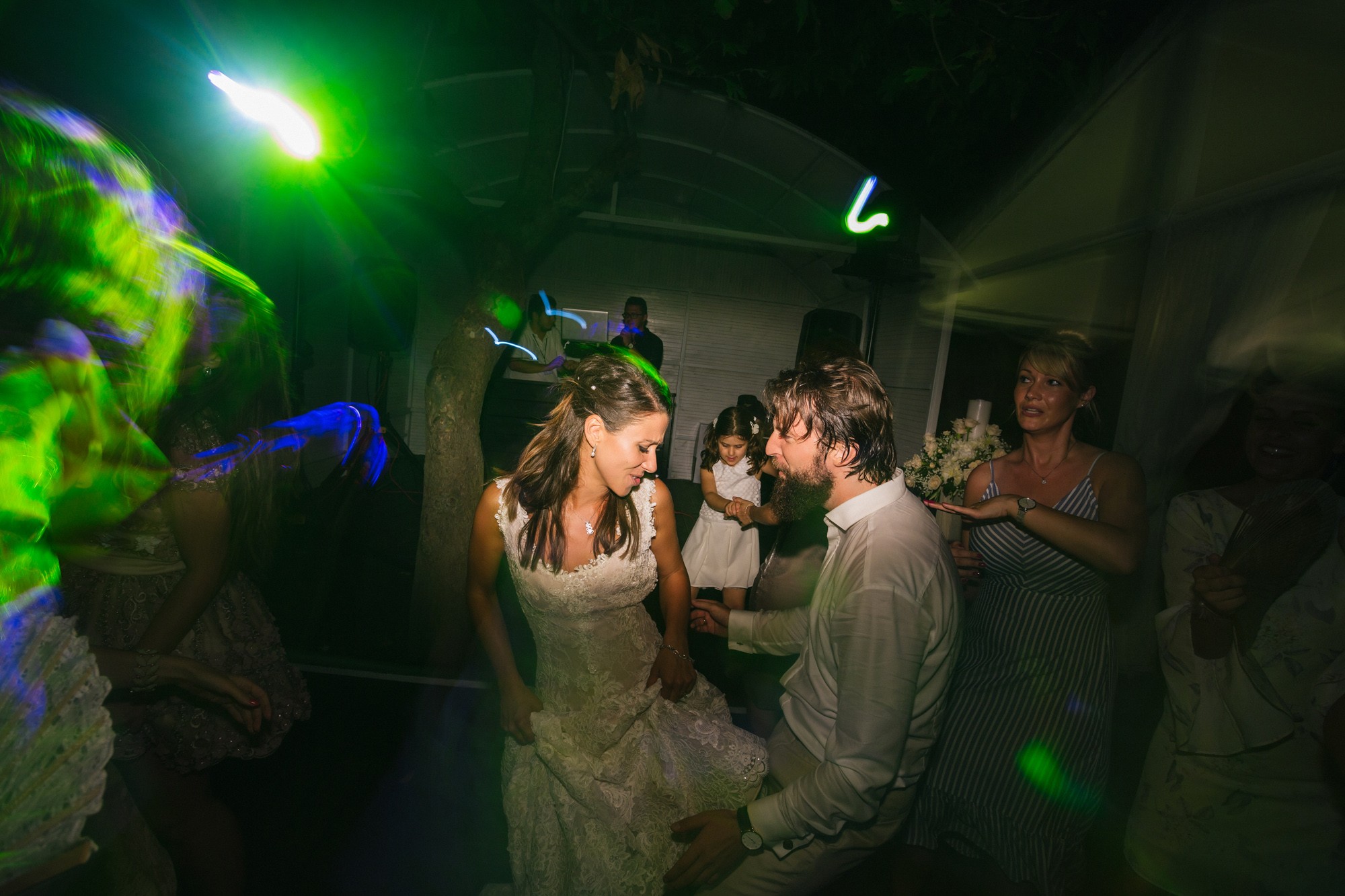 Οι καλεσμένοι περίμεναν το ζευγάρι στο Κτήμα Φαργκάνη και οι νεόνυμφοι κατέφθασαν εντυπωσιακά μέσα από τη θάλασσα με βαρκάκι. Η διάθεση που δημιουργήθηκε θύμιζε ένα πετυχημένο beach party γεμάτο ενέργεια και κέφι. Οι καλεσμένοι μαζί με το ζευγάρι άναψαν μια μεγάλη φωτιά στην παραλία και στη συνέχεια φώτισαν τον ουρανό με πανέμορφα κόκκινα φαναράκια. Οι φωτογραφίες αυτής της ρομαντικής στιγμής θα μας μείνουν αξέχαστες.
