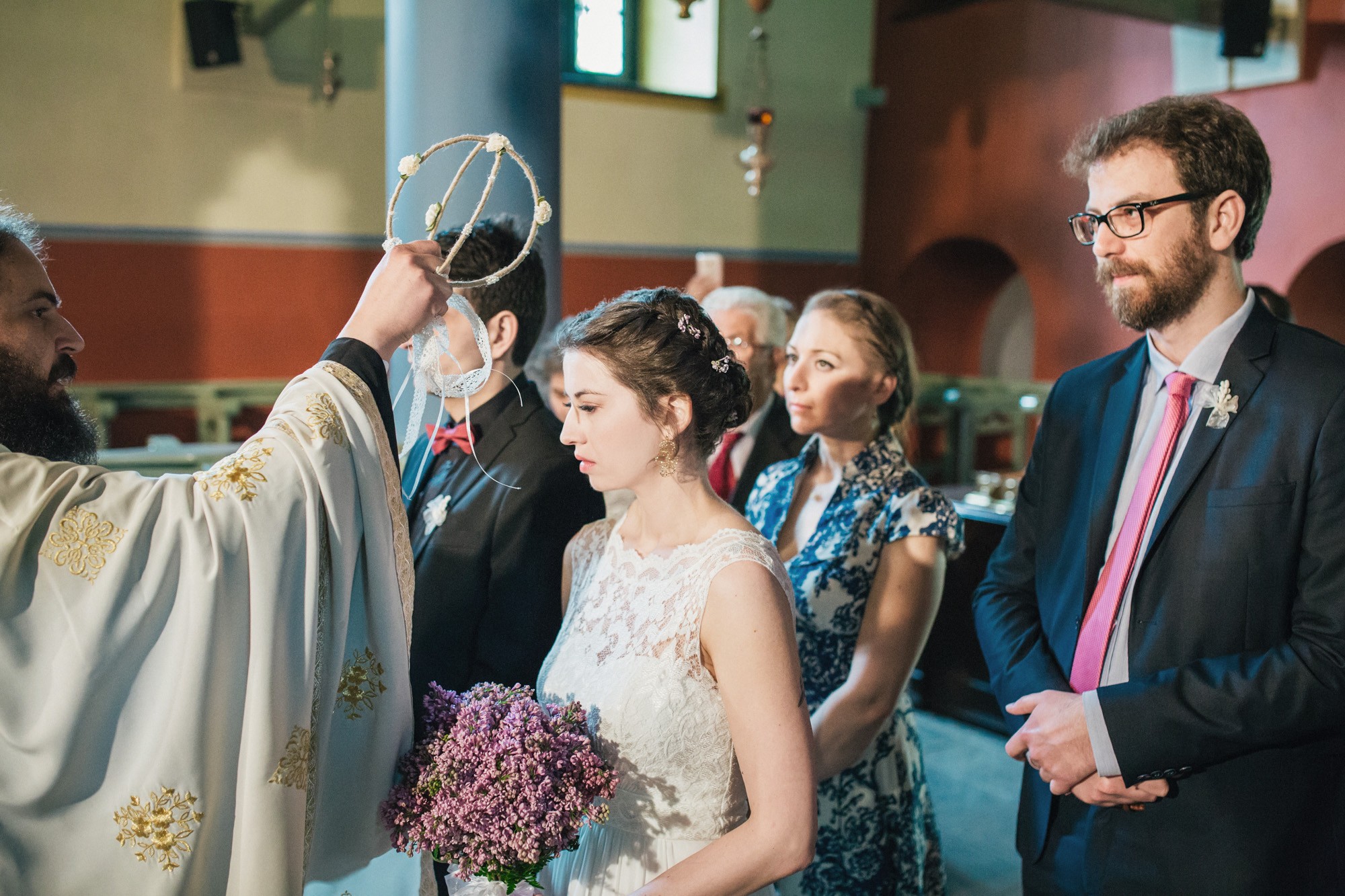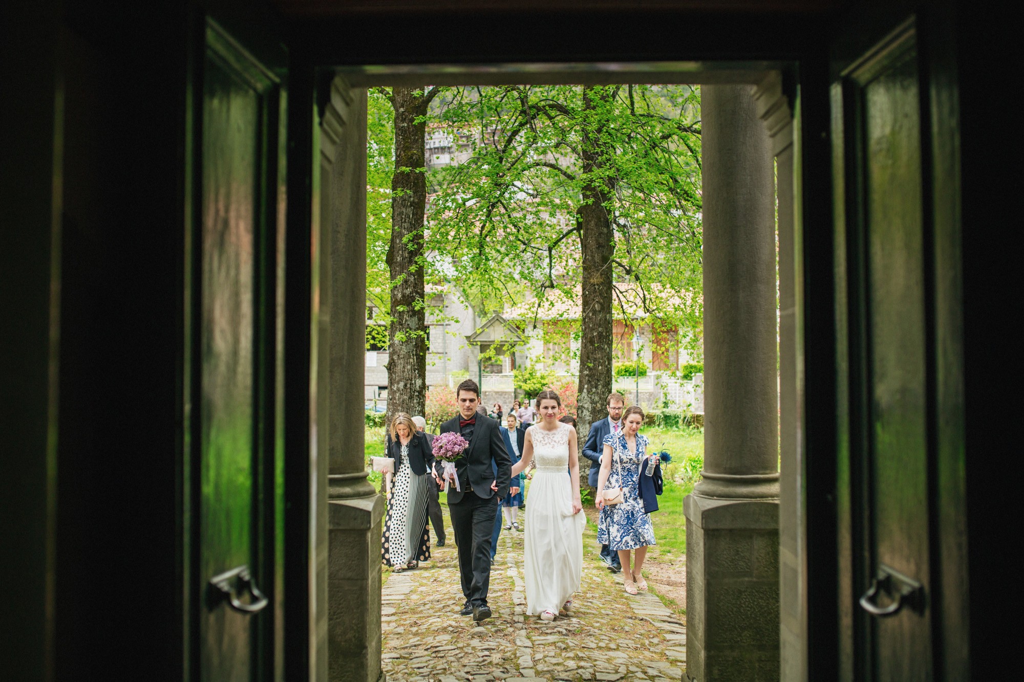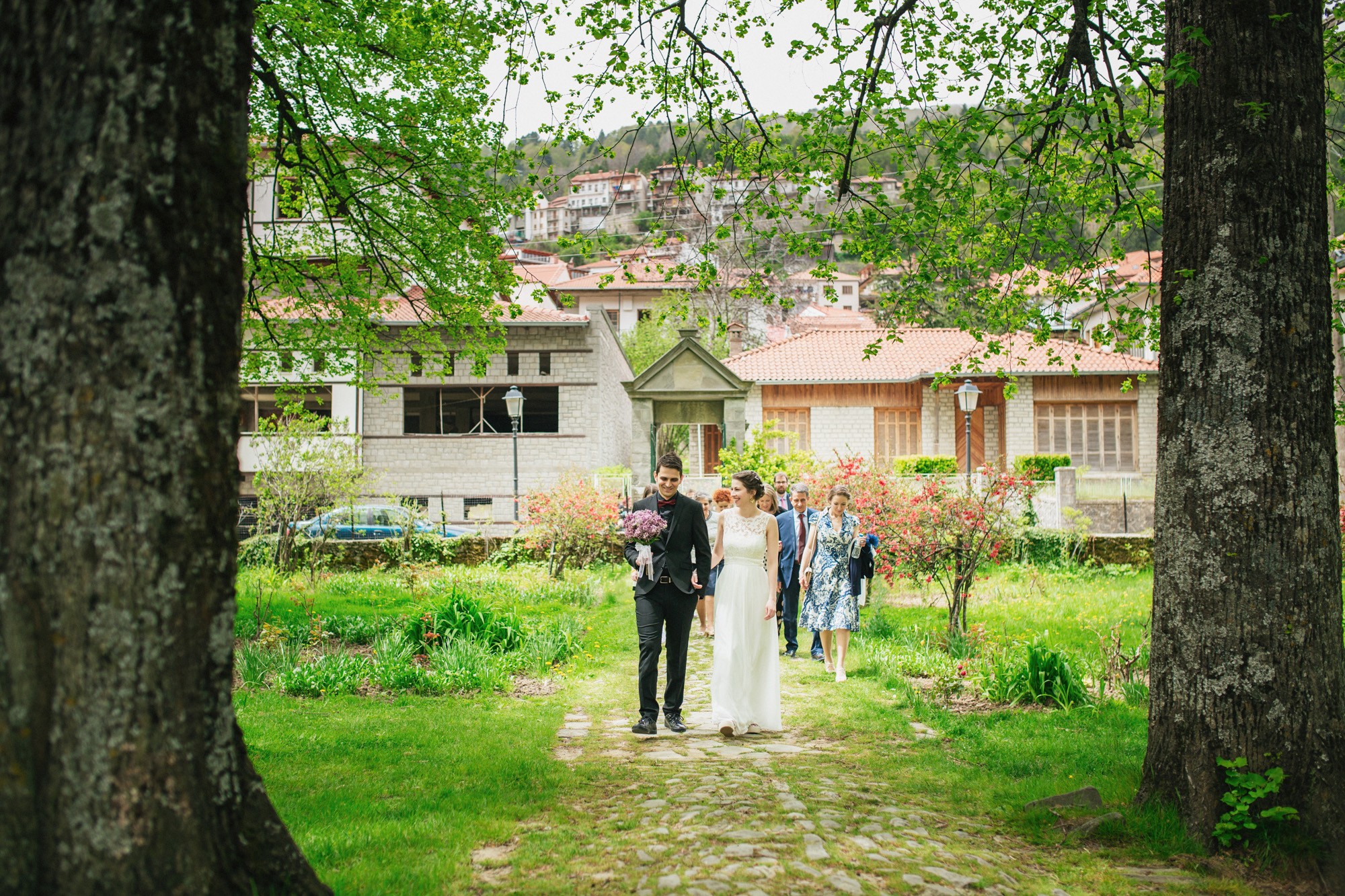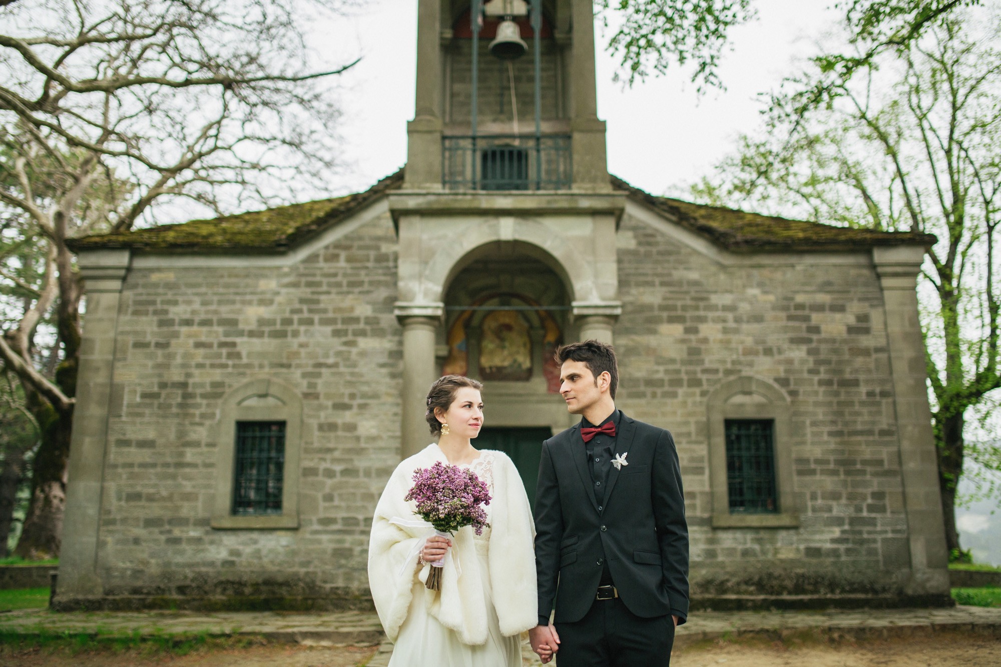 Οι δυο τους μη τηρώντας τον παραδοσιακό τρόπο που γαμπρός και νύφη συναντιούνται στην εκκλησία, ξεκίνησαν μαζί και κρατώντας ο ένας το χέρι του άλλου, έφτασαν στον ιερό χώρο της εκκλησίας. Ψηλά δέντρα περίκλυαν και ομόρφαιναν τον εξωτερικό χώρο, δημιουργώντας μία ιδιαίτερη ρομαντική ατμόσφαιρα και ένα ονειρικό σκηνικό για την φωτογράφιση του γάμου.