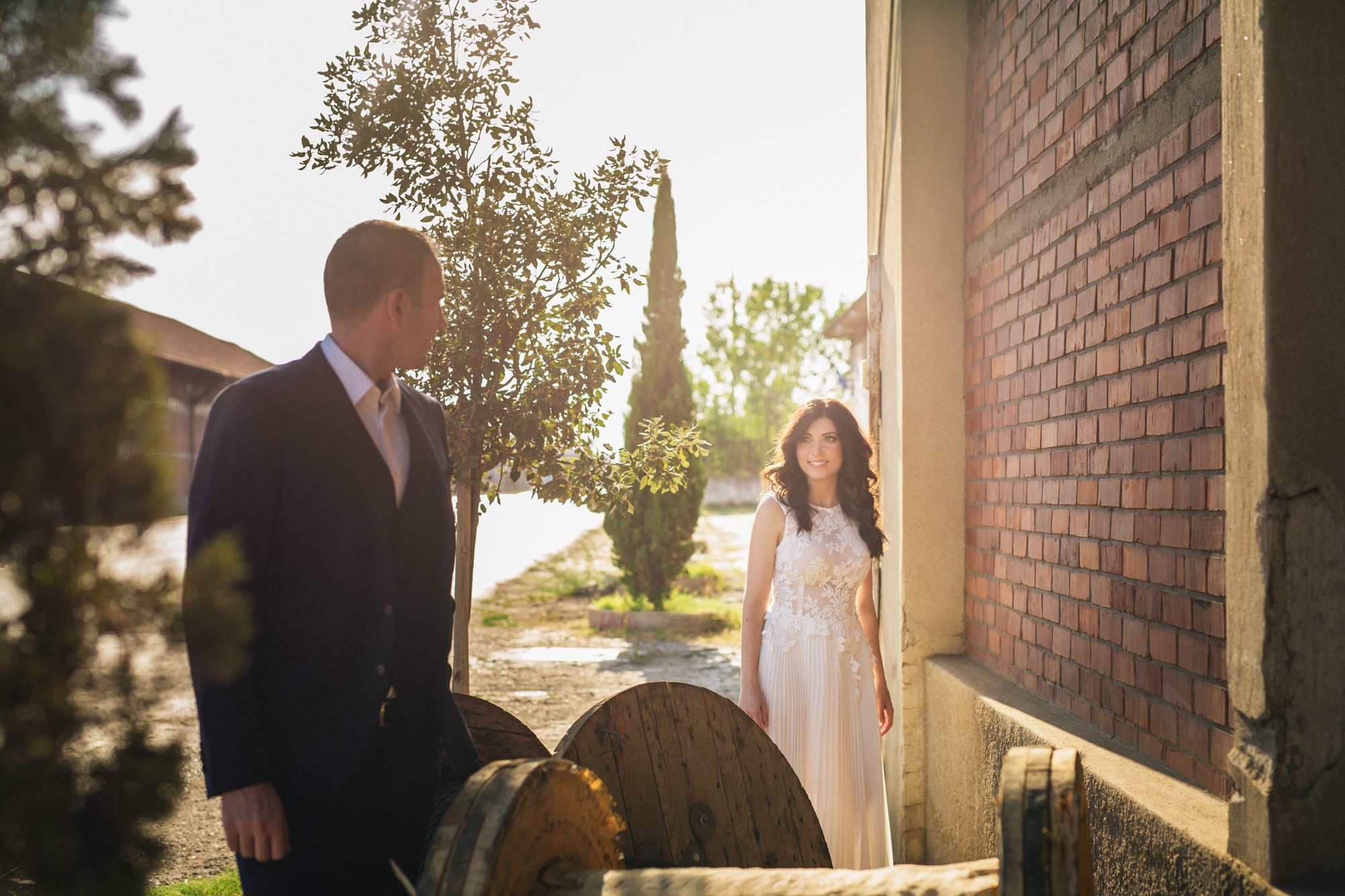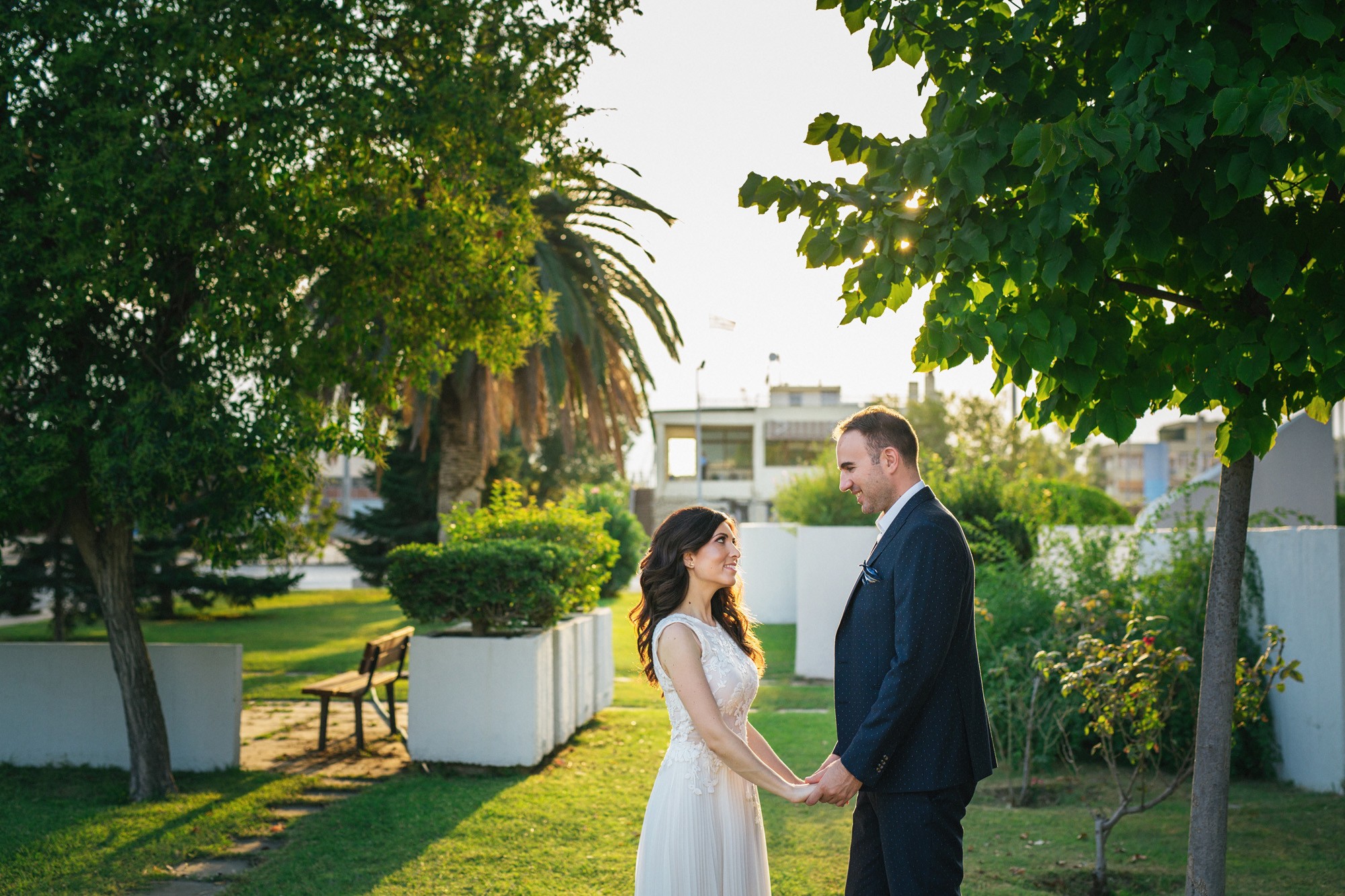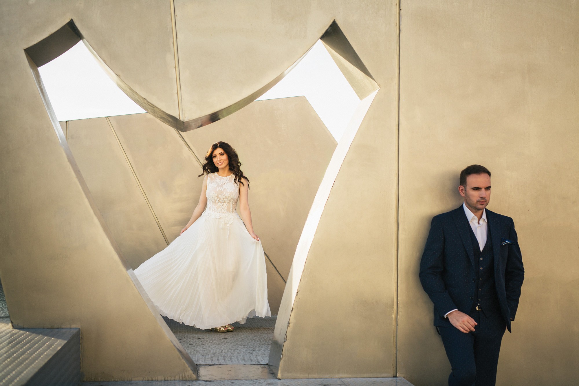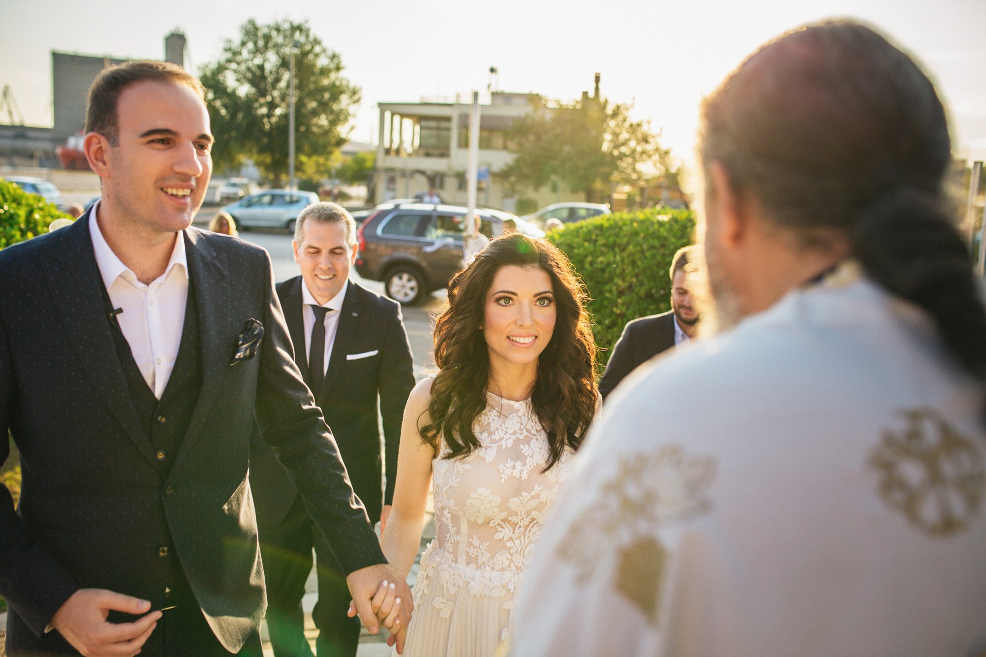 Η Αλεξάνδρα επέλεξε ένα αμάνικο αέρινο νυφικό, με κεντημένη δαντέλα στο επάνω μέρος και στο τελείωμά του, δοσμένο με στοιχεία ρομαντισμού χάρη στις πιέτες του. Ο Γιάννης αντίστοιχα, εμφανίστηκε με σκουρόχρωμο κοστούμι με πουά λεπτομέρεια και χρωματιστό μαντίλι στην τσέπη του σακακιού του. Το αποτέλεσμα κομψό και μοντέρνο, προσφέρει ζωντάνια στην φωτογραφία γάμου κάνοντάς την ξεχωριστή.