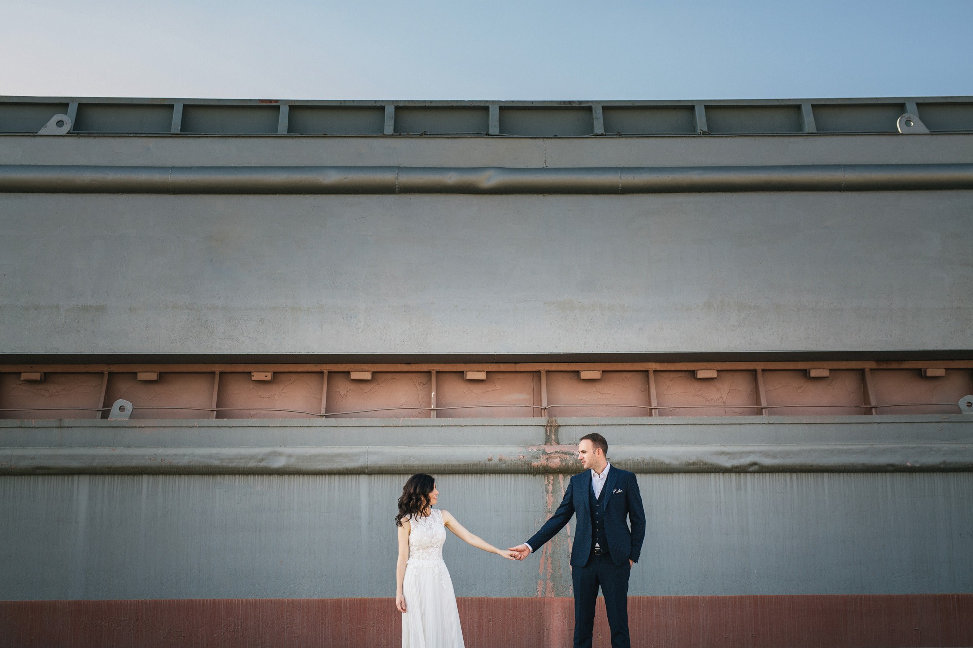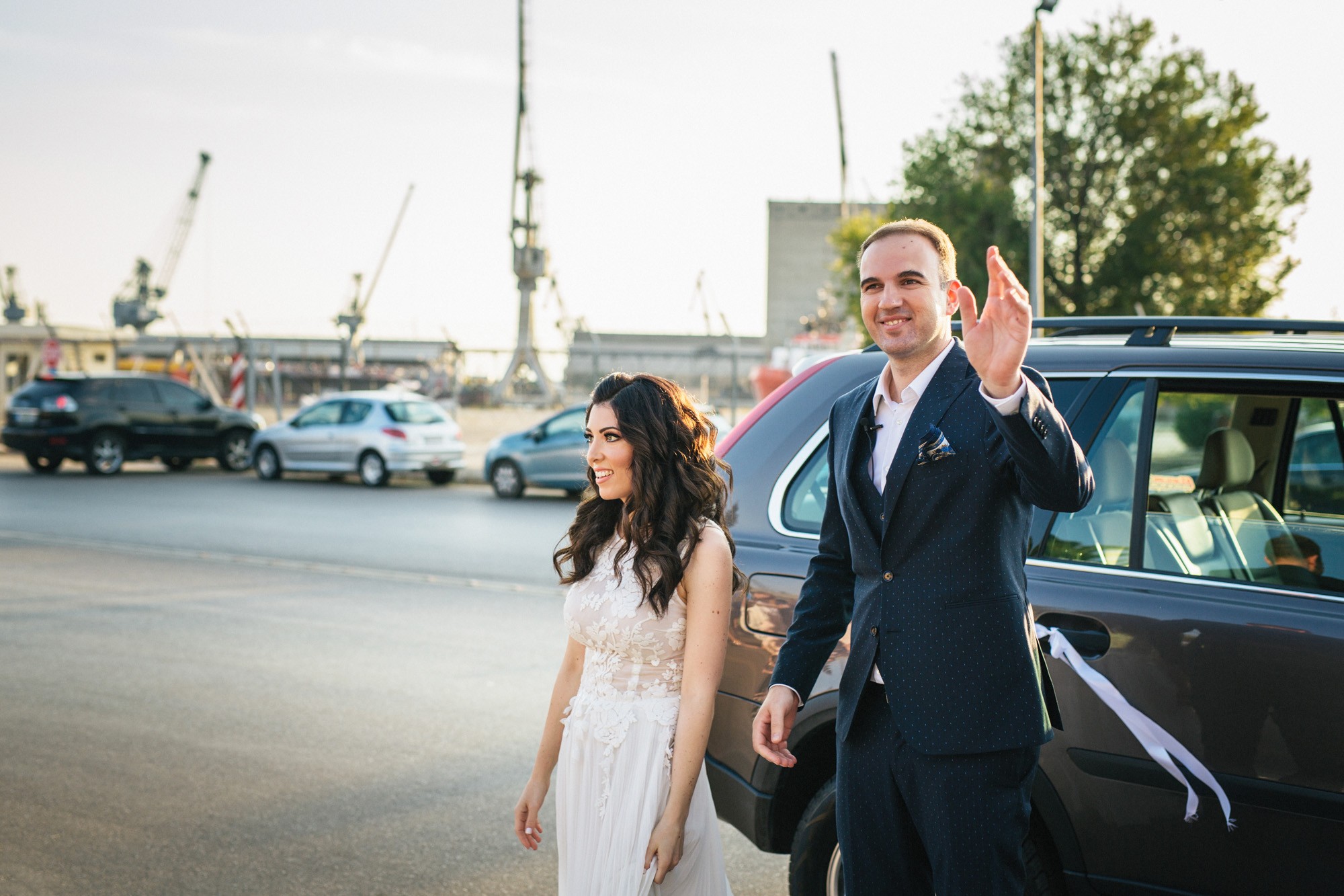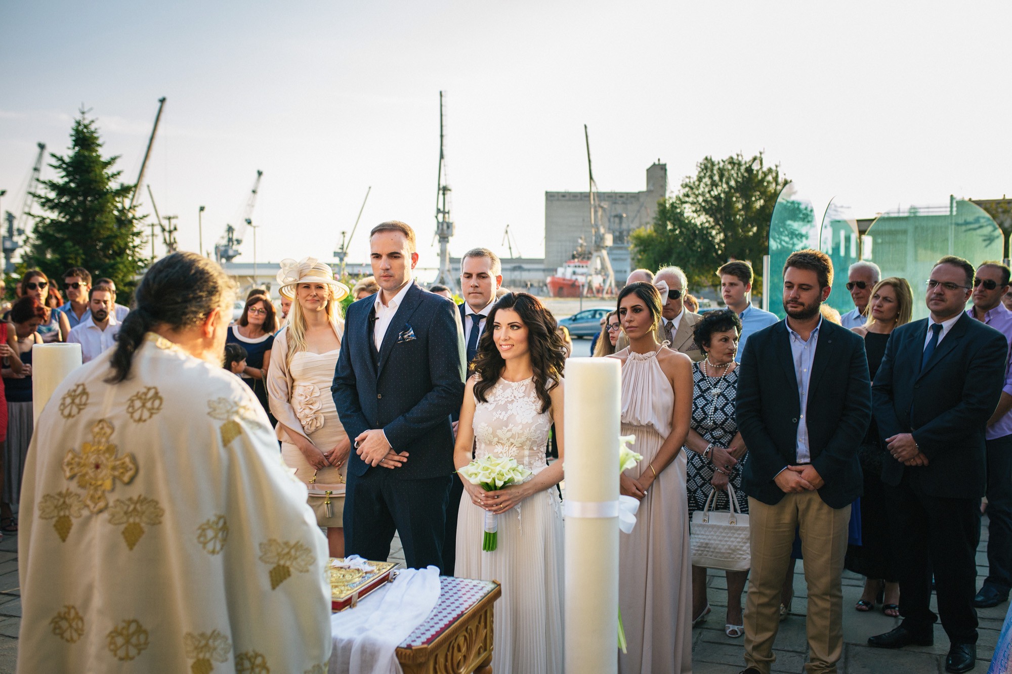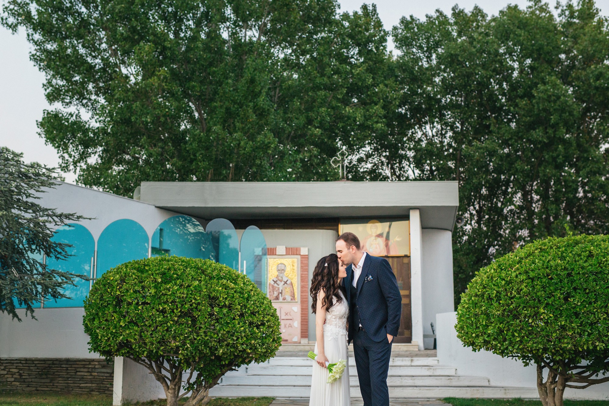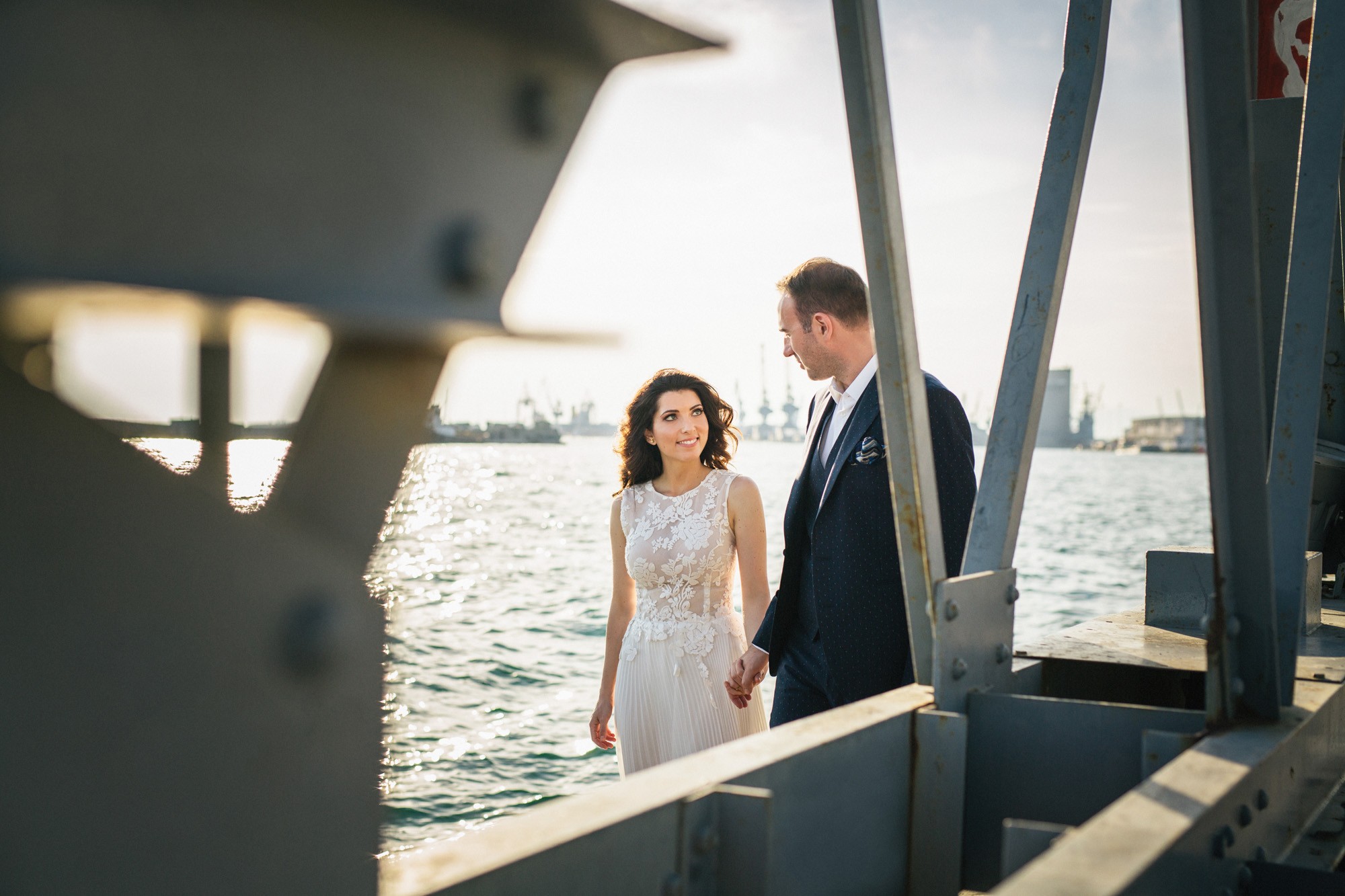 Η Αλεξάνδρα επέλεξε ένα αμάνικο αέρινο νυφικό, με κεντημένη δαντέλα στο επάνω μέρος και στο τελείωμά του, δοσμένο με στοιχεία ρομαντισμού χάρη στις πιέτες του. Ο Γιάννης αντίστοιχα, εμφανίστηκε με σκουρόχρωμο κοστούμι με πουά λεπτομέρεια και χρωματιστό μαντίλι στην τσέπη του σακακιού του. Το αποτέλεσμα κομψό και μοντέρνο, προσφέρει ζωντάνια στην φωτογραφία γάμου κάνοντάς την ξεχωριστή.