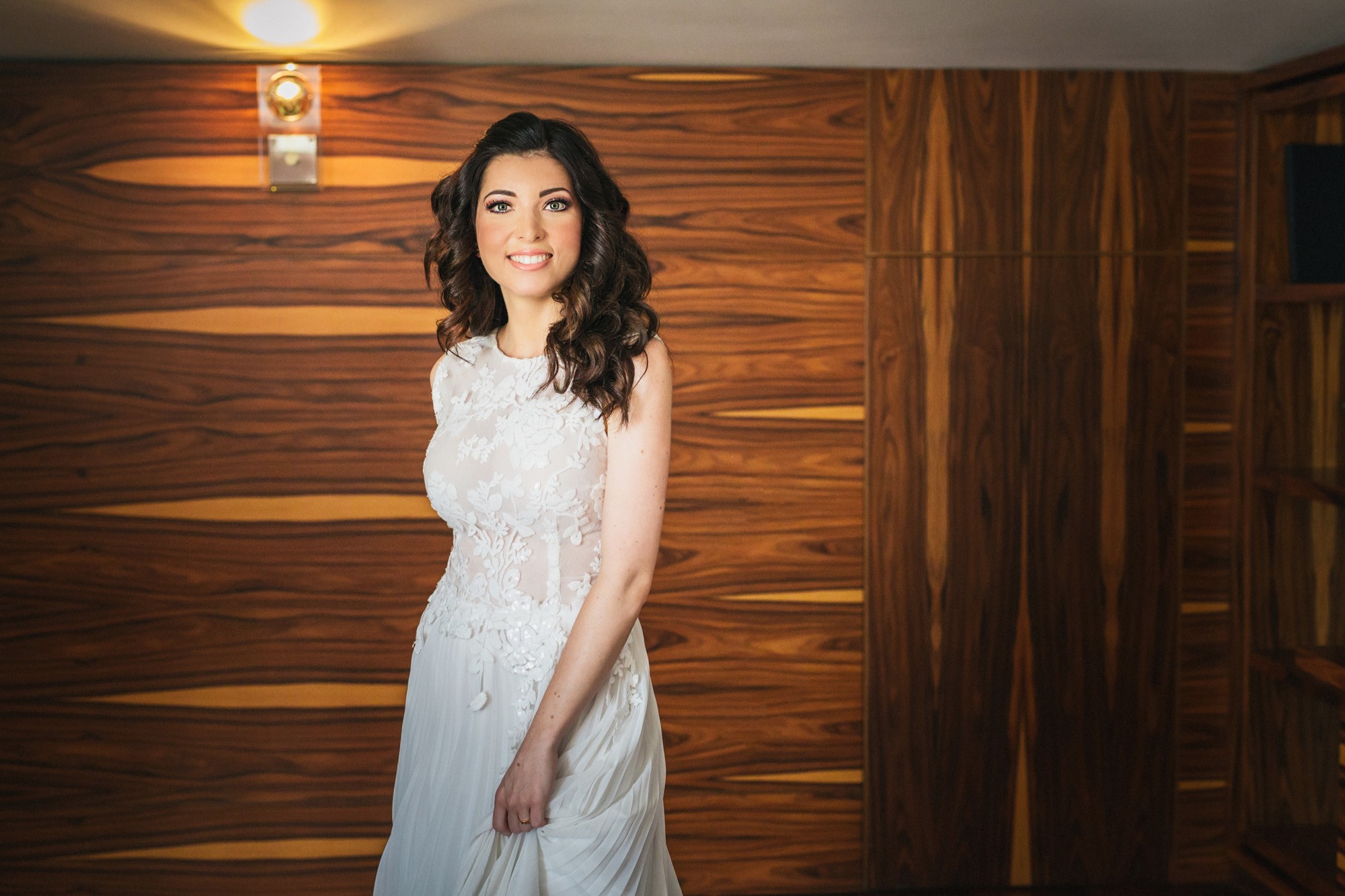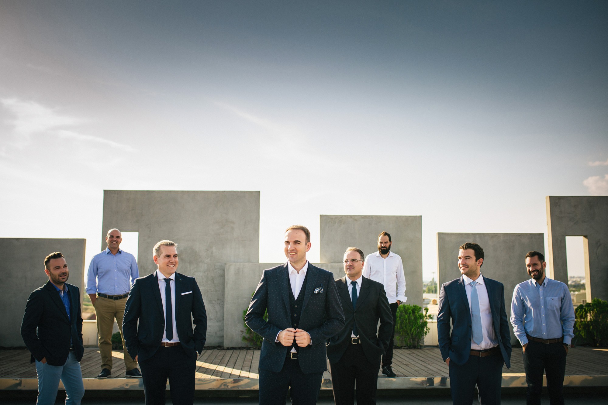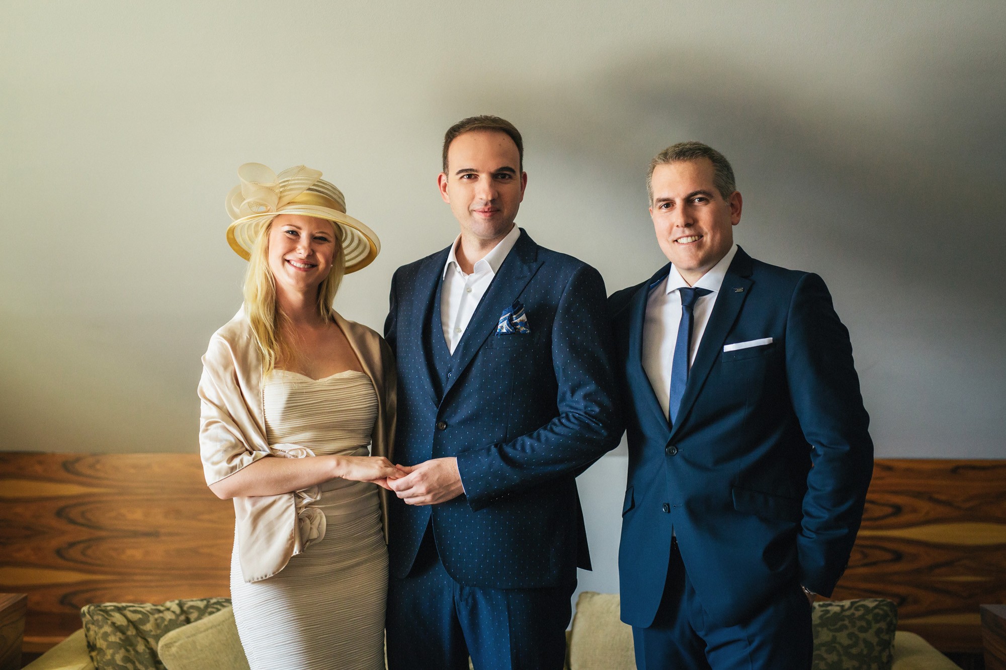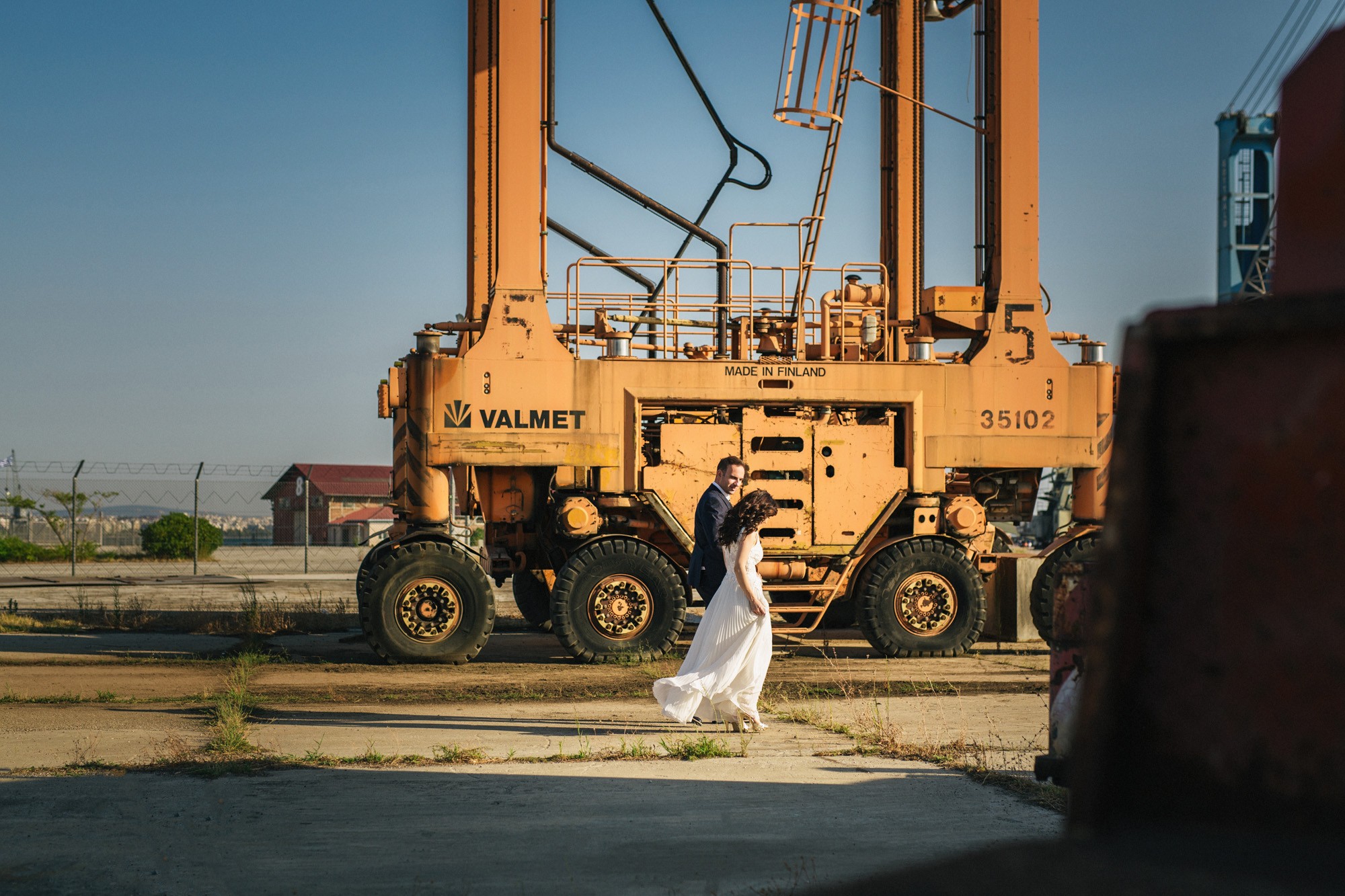 Η Αλεξάνδρα επέλεξε ένα αμάνικο αέρινο νυφικό, με κεντημένη δαντέλα στο επάνω μέρος και στο τελείωμά του, δοσμένο με στοιχεία ρομαντισμού χάρη στις πιέτες του. Ο Γιάννης αντίστοιχα, εμφανίστηκε με σκουρόχρωμο κοστούμι με πουά λεπτομέρεια και χρωματιστό μαντίλι στην τσέπη του σακακιού του. Το αποτέλεσμα κομψό και μοντέρνο, προσφέρει ζωντάνια στην φωτογραφία γάμου κάνοντάς την ξεχωριστή.