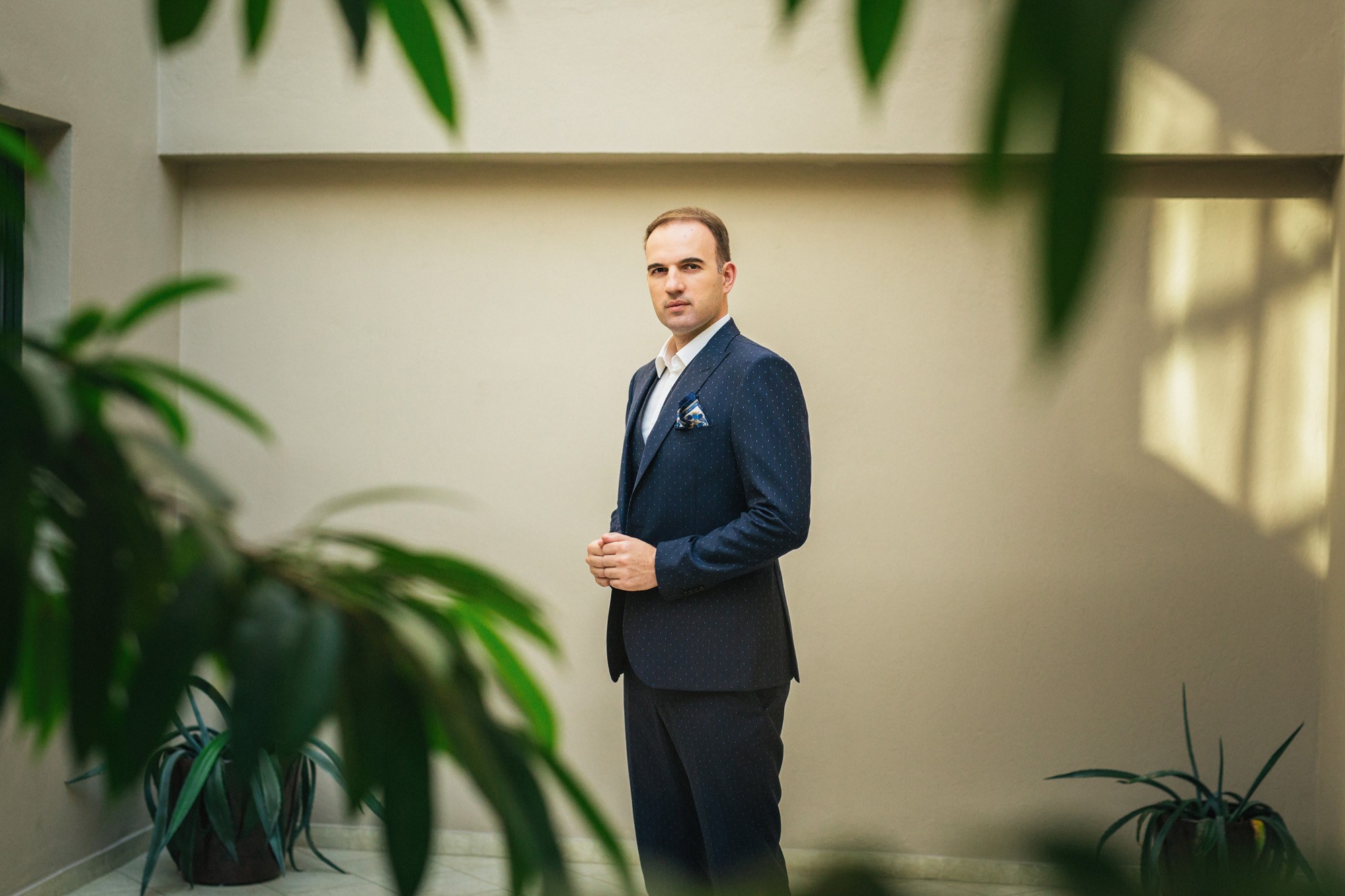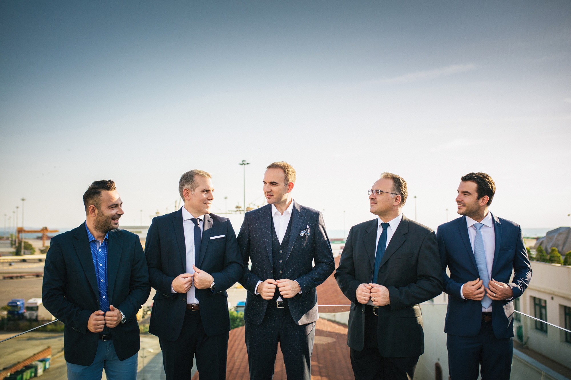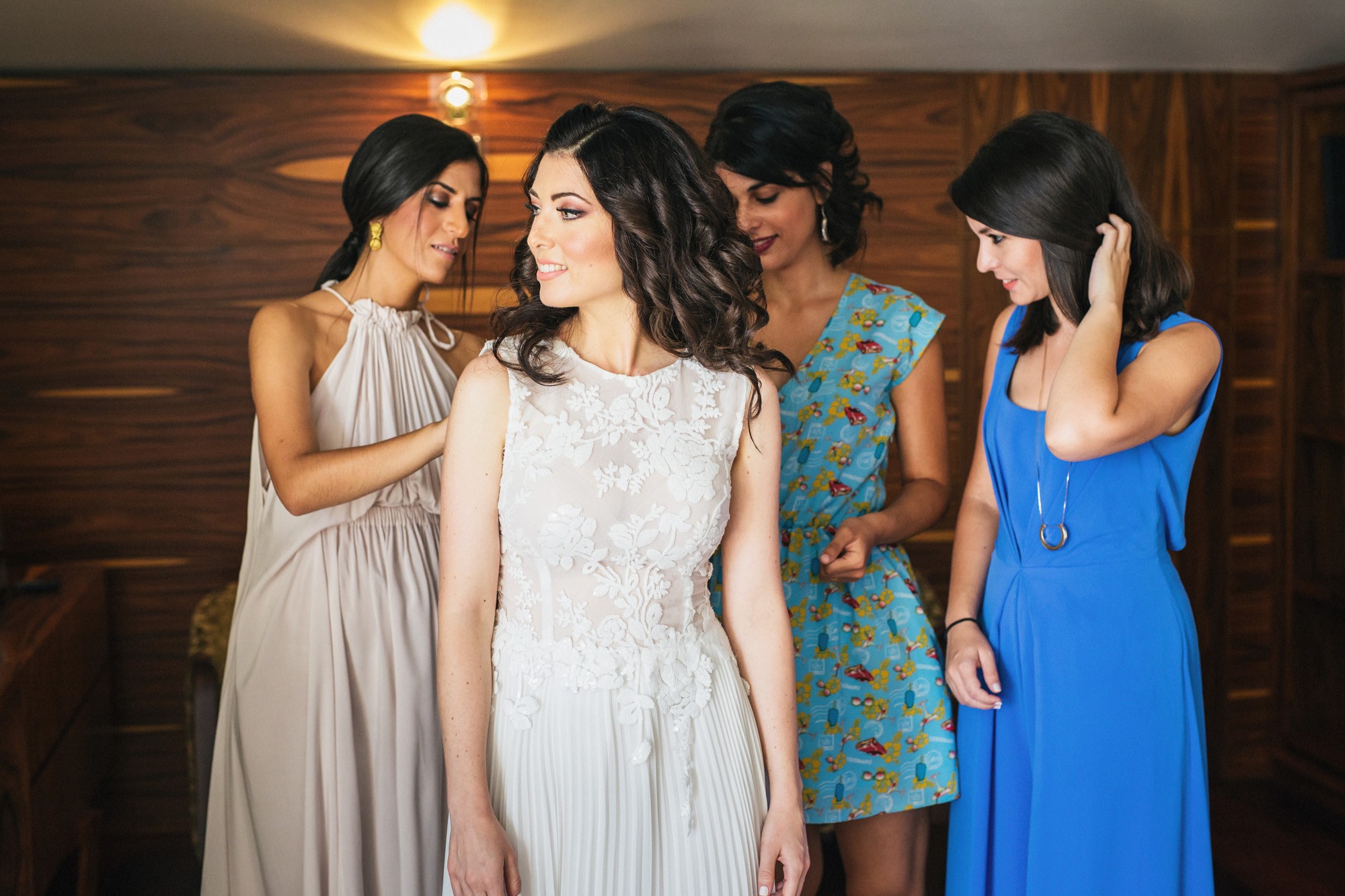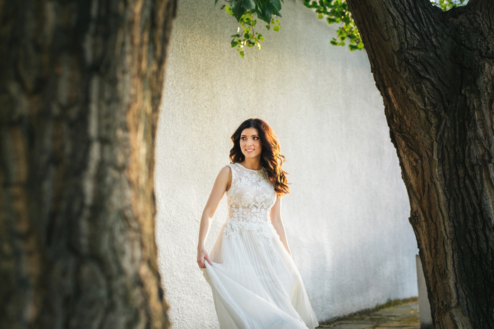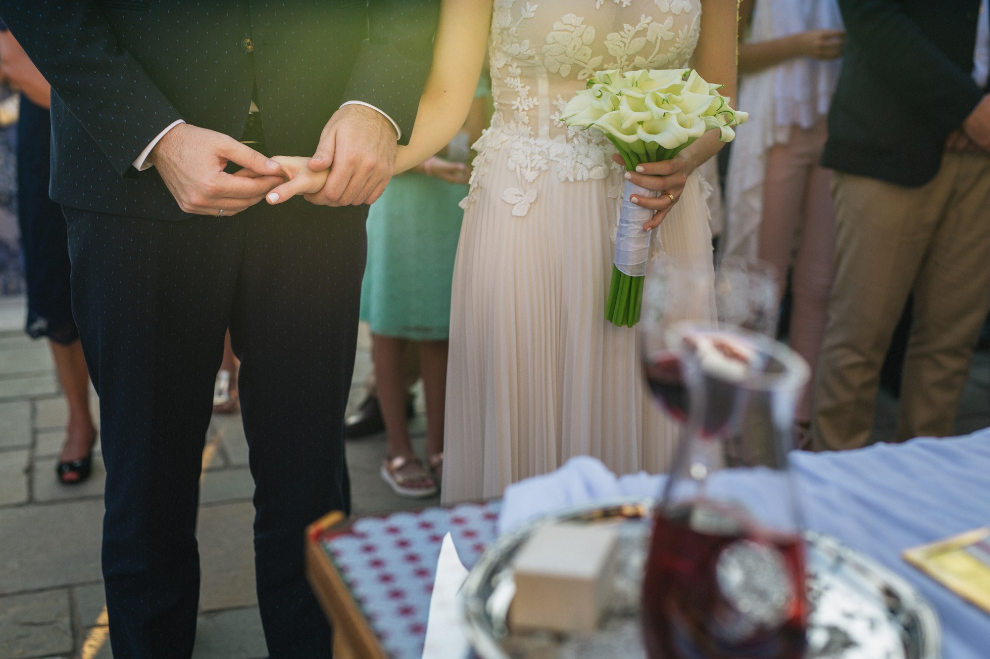 Η Αλεξάνδρα επέλεξε ένα αμάνικο αέρινο νυφικό, με κεντημένη δαντέλα στο επάνω μέρος και στο τελείωμά του, δοσμένο με στοιχεία ρομαντισμού χάρη στις πιέτες του. Ο Γιάννης αντίστοιχα, εμφανίστηκε με σκουρόχρωμο κοστούμι με πουά λεπτομέρεια και χρωματιστό μαντίλι στην τσέπη του σακακιού του. Το αποτέλεσμα κομψό και μοντέρνο, προσφέρει ζωντάνια στην φωτογραφία γάμου κάνοντάς την ξεχωριστή.