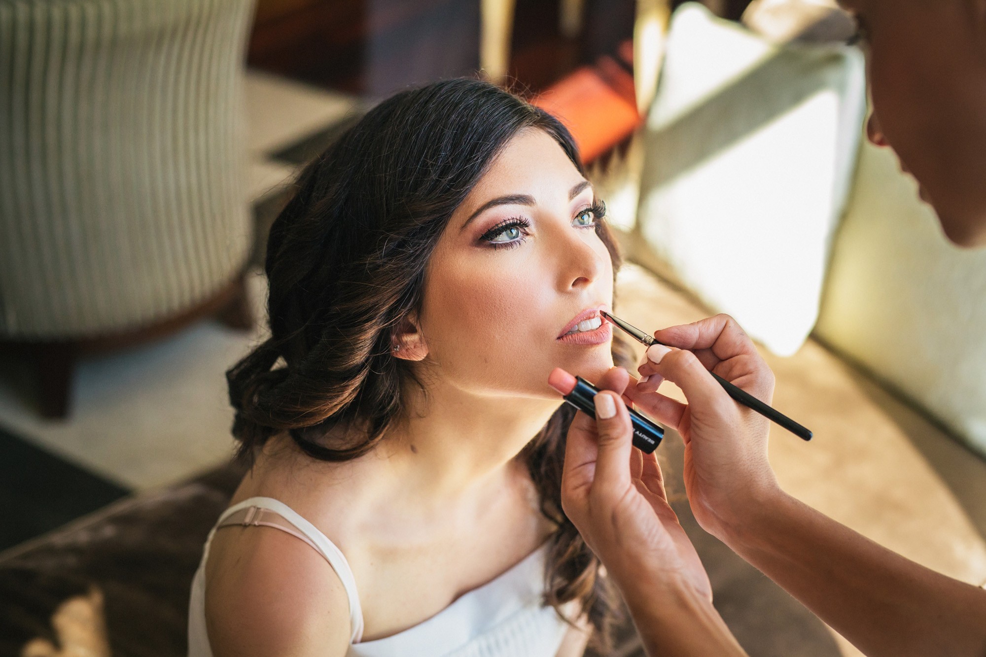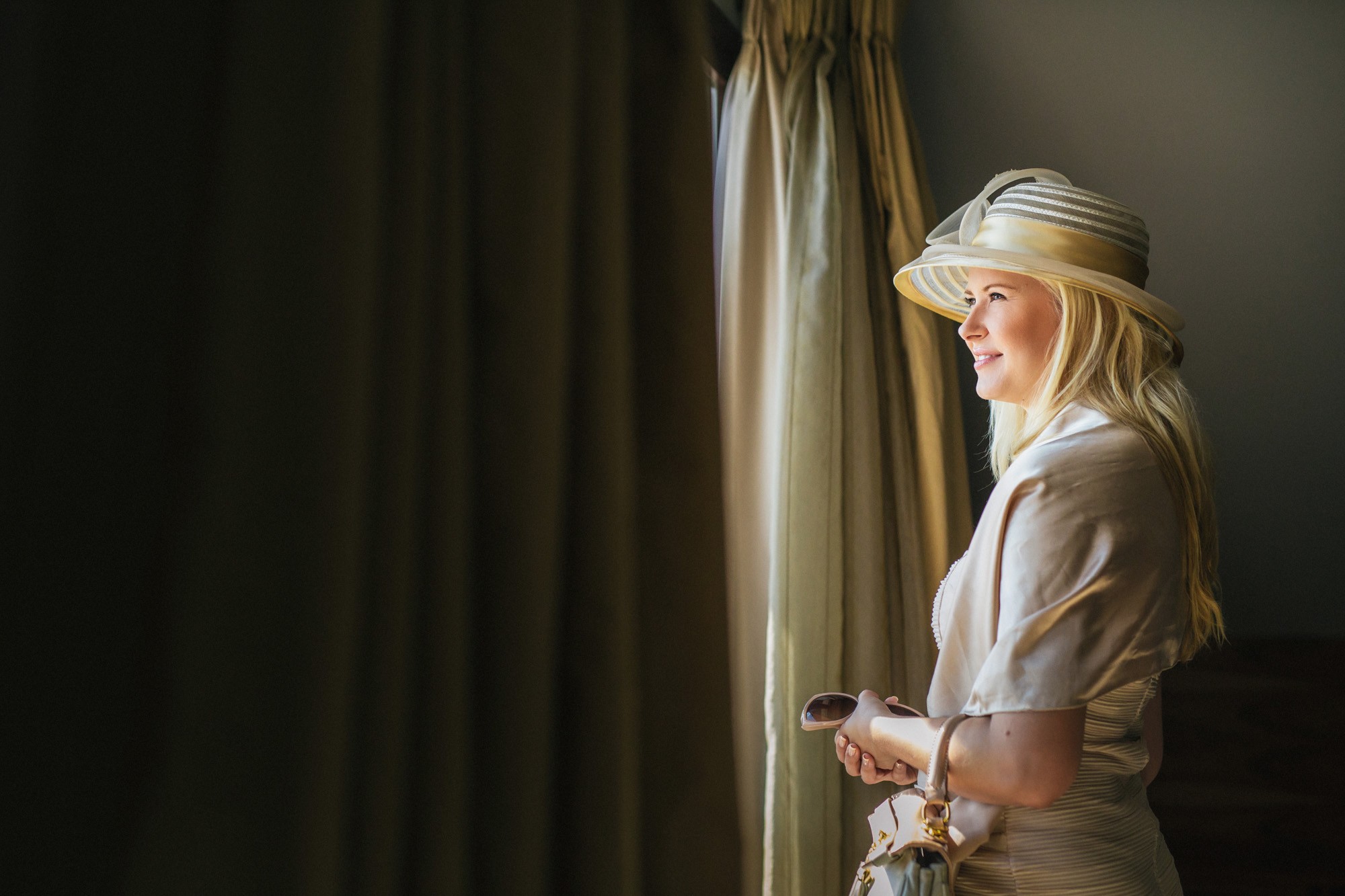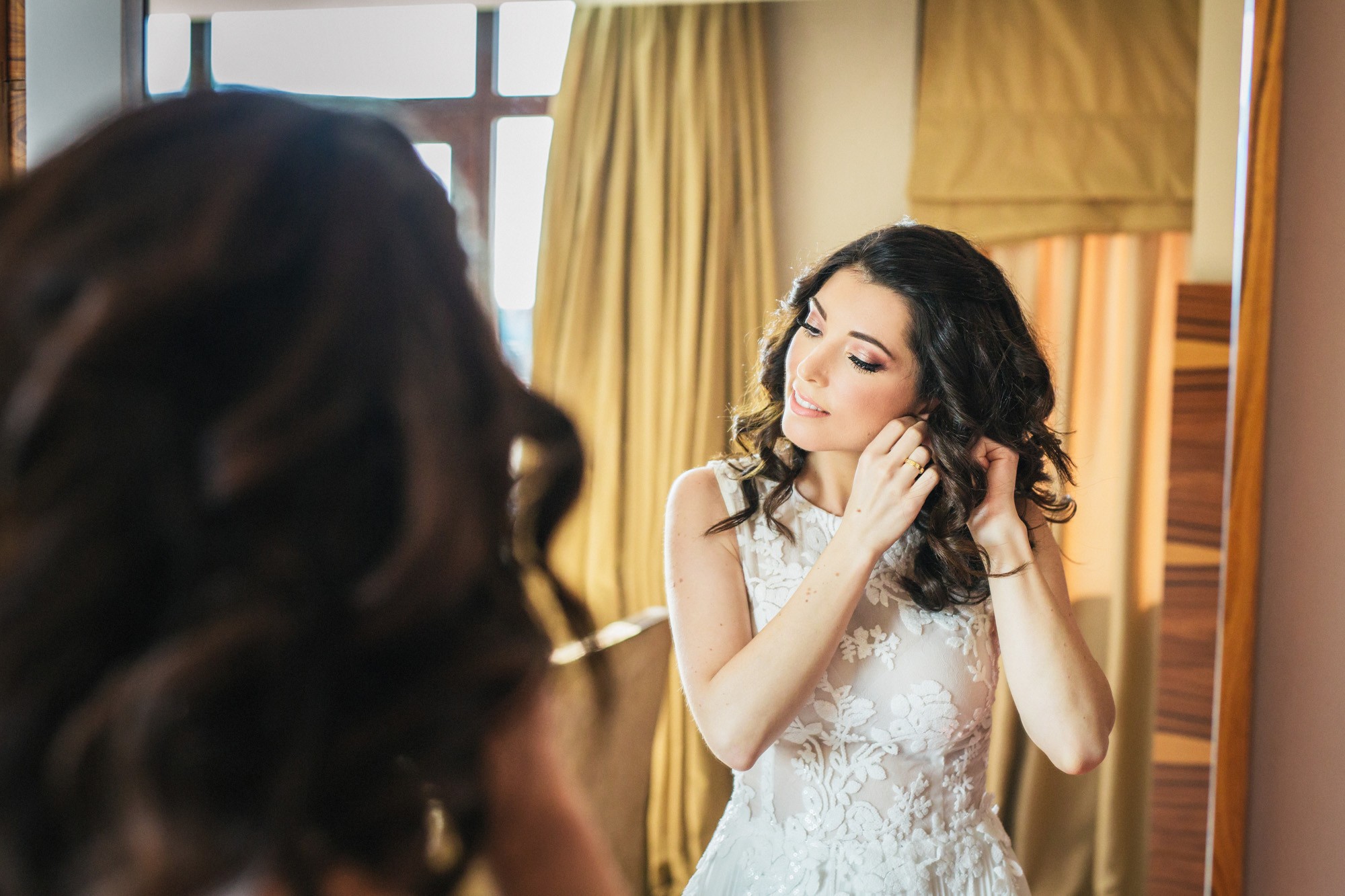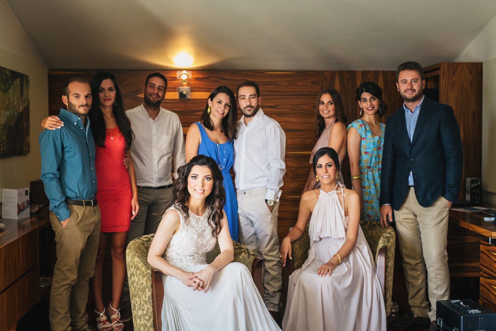 Η Αλεξάνδρα επέλεξε ένα αμάνικο αέρινο νυφικό, με κεντημένη δαντέλα στο επάνω μέρος και στο τελείωμά του, δοσμένο με στοιχεία ρομαντισμού χάρη στις πιέτες του. Ο Γιάννης αντίστοιχα, εμφανίστηκε με σκουρόχρωμο κοστούμι με πουά λεπτομέρεια και χρωματιστό μαντίλι στην τσέπη του σακακιού του. Το αποτέλεσμα κομψό και μοντέρνο, προσφέρει ζωντάνια στην φωτογραφία γάμου κάνοντάς την ξεχωριστή.