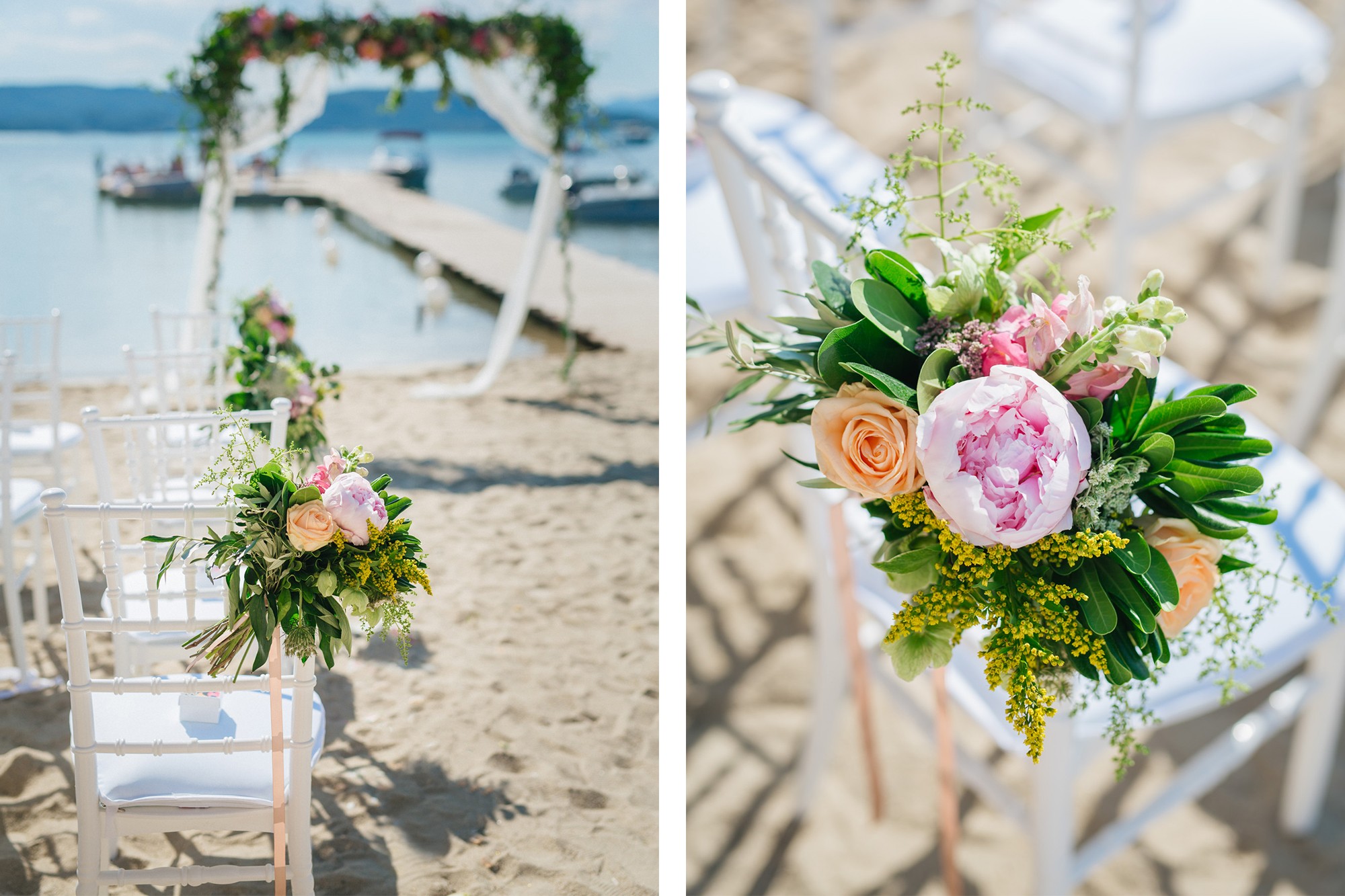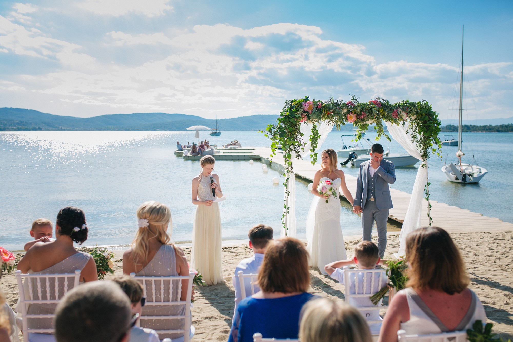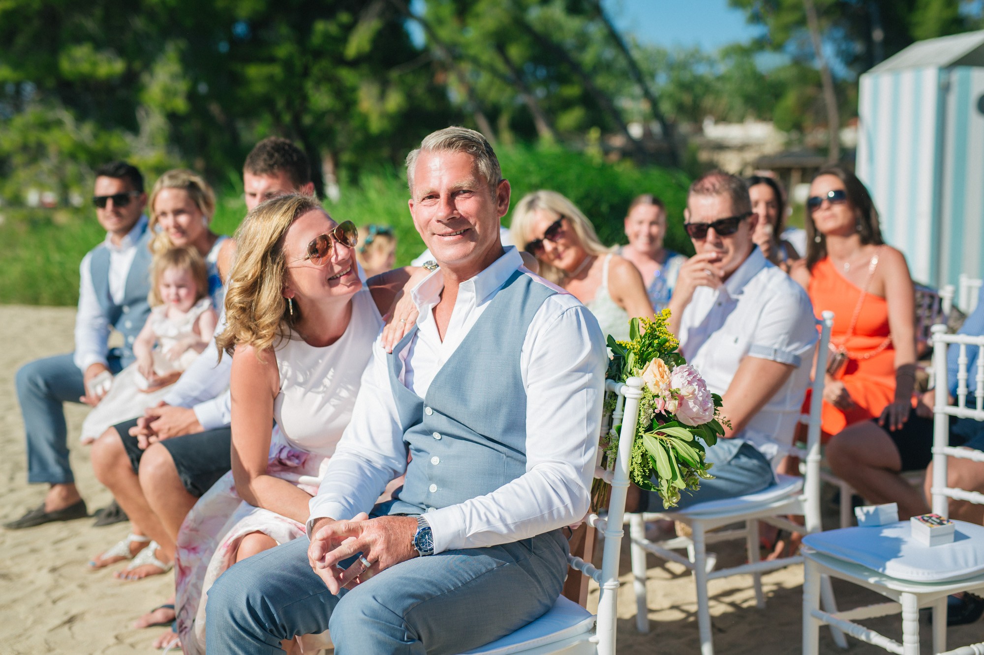 After all the preparations were completed as expected, everyone headed towards the beach, where the wedding ceremony would take place. White chairs, an arch made of white curtains with a beautiful floral arrangement served as the main decor of the space. This, combined with the gorgeous coastline, created one of the most impressive backdrops for wedding photography. The atmosphere was deeply emotional and touching, both for the couple and for their children and all the guests.