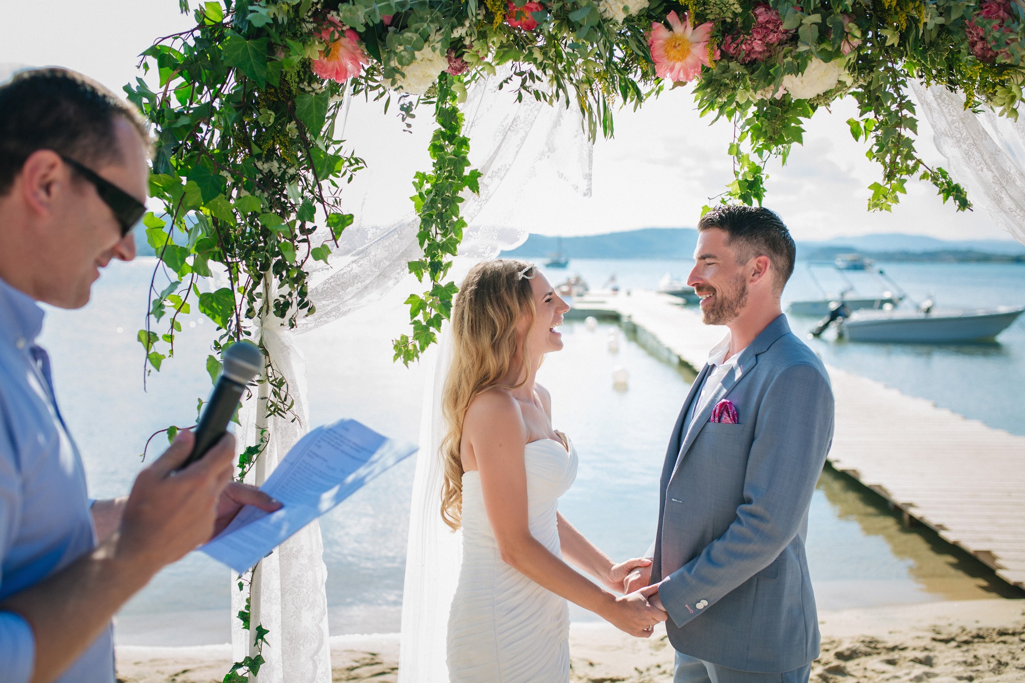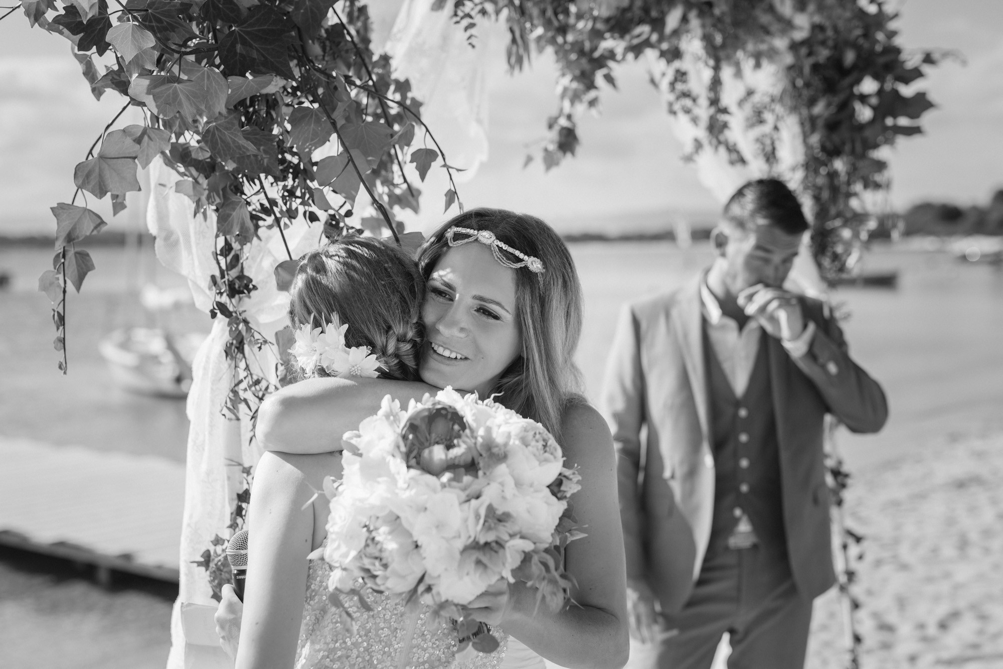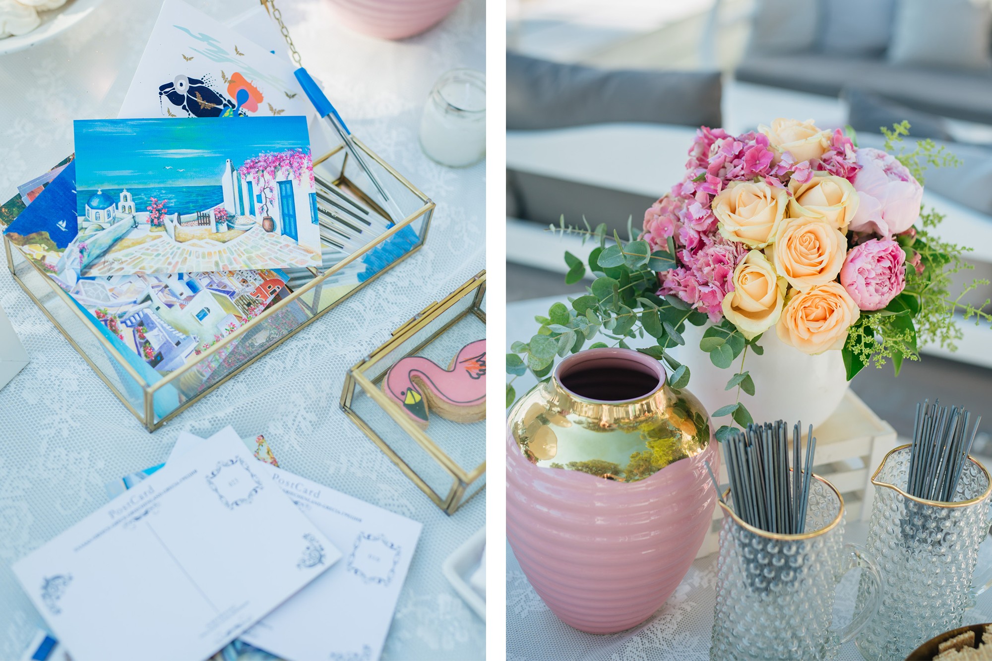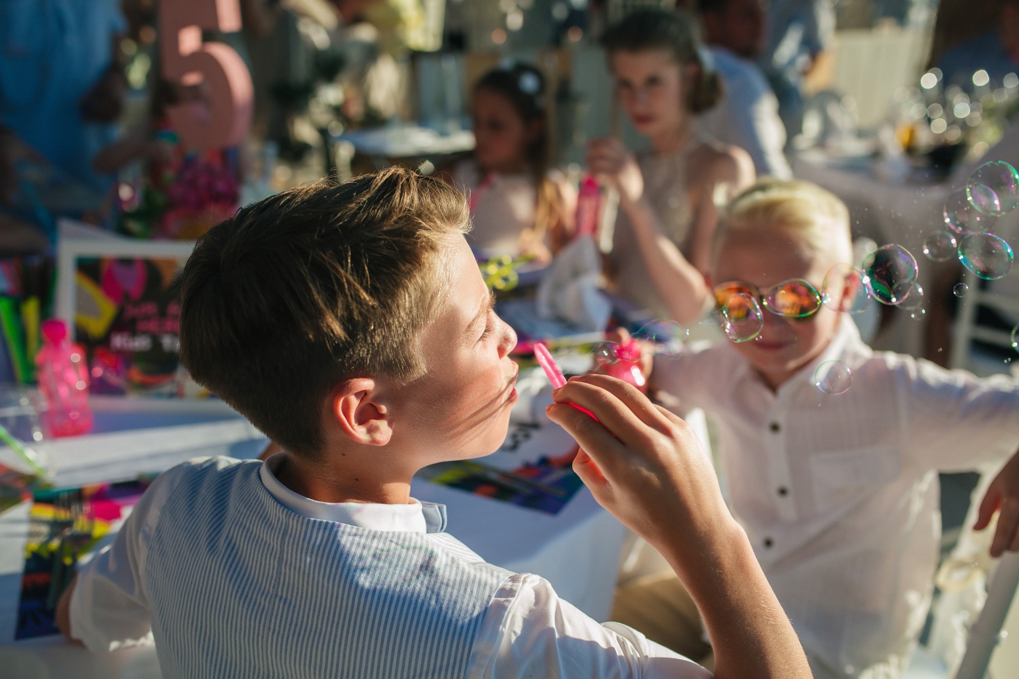 After all the preparations were completed as expected, everyone headed towards the beach, where the wedding ceremony would take place. White chairs, an arch made of white curtains with a beautiful floral arrangement served as the main decor of the space. This, combined with the gorgeous coastline, created one of the most impressive backdrops for wedding photography. The atmosphere was deeply emotional and touching, both for the couple and for their children and all the guests.