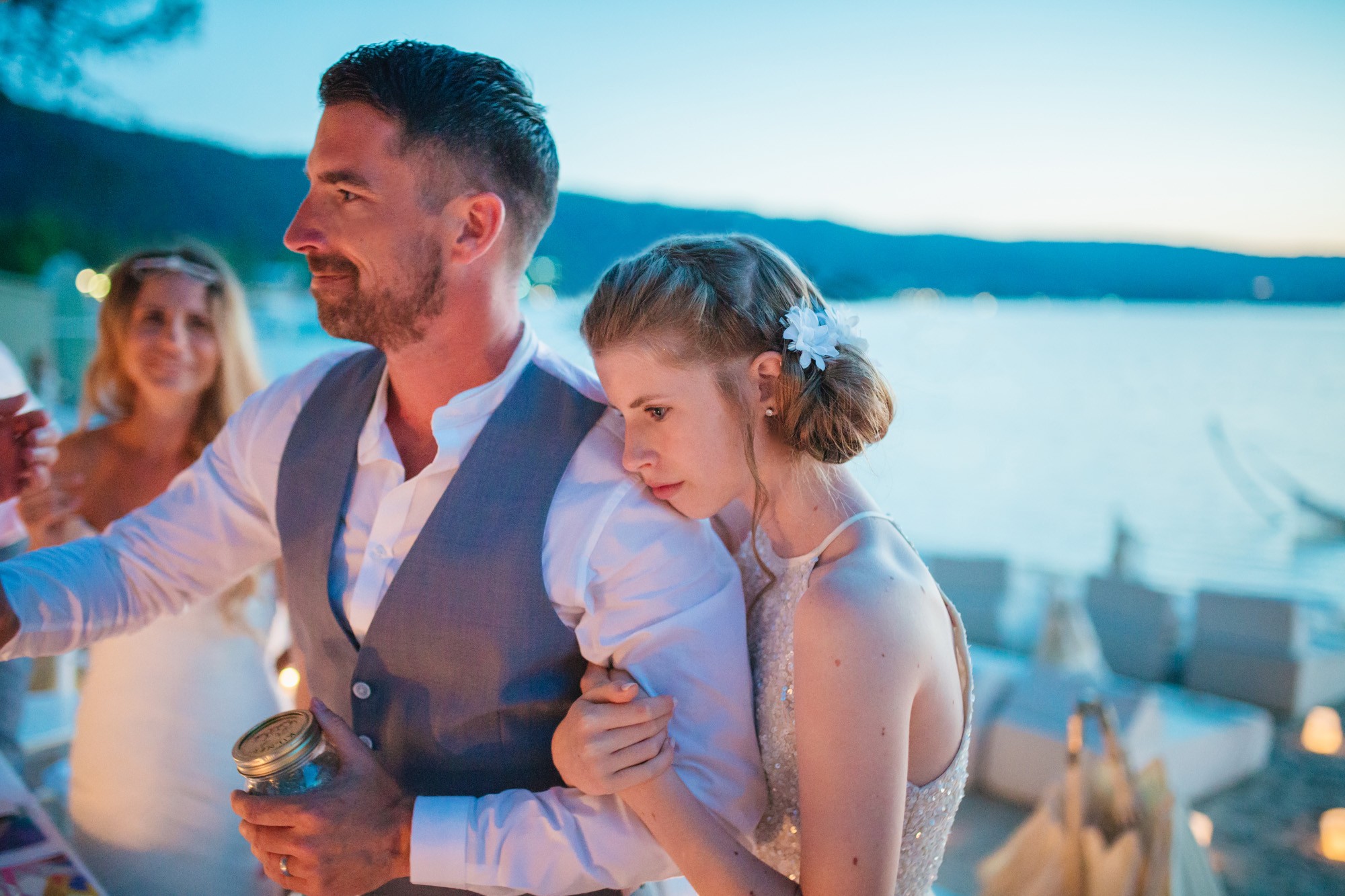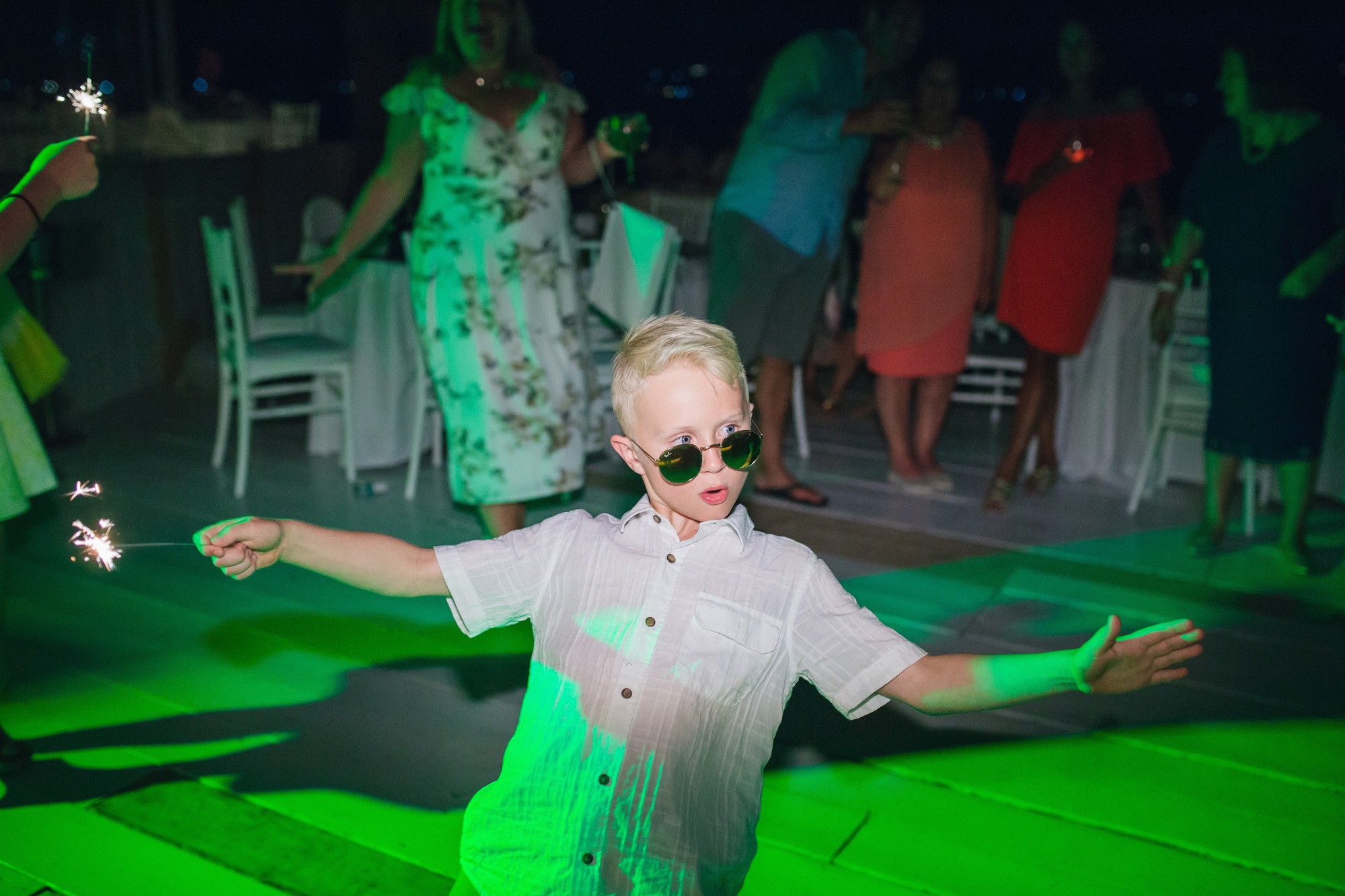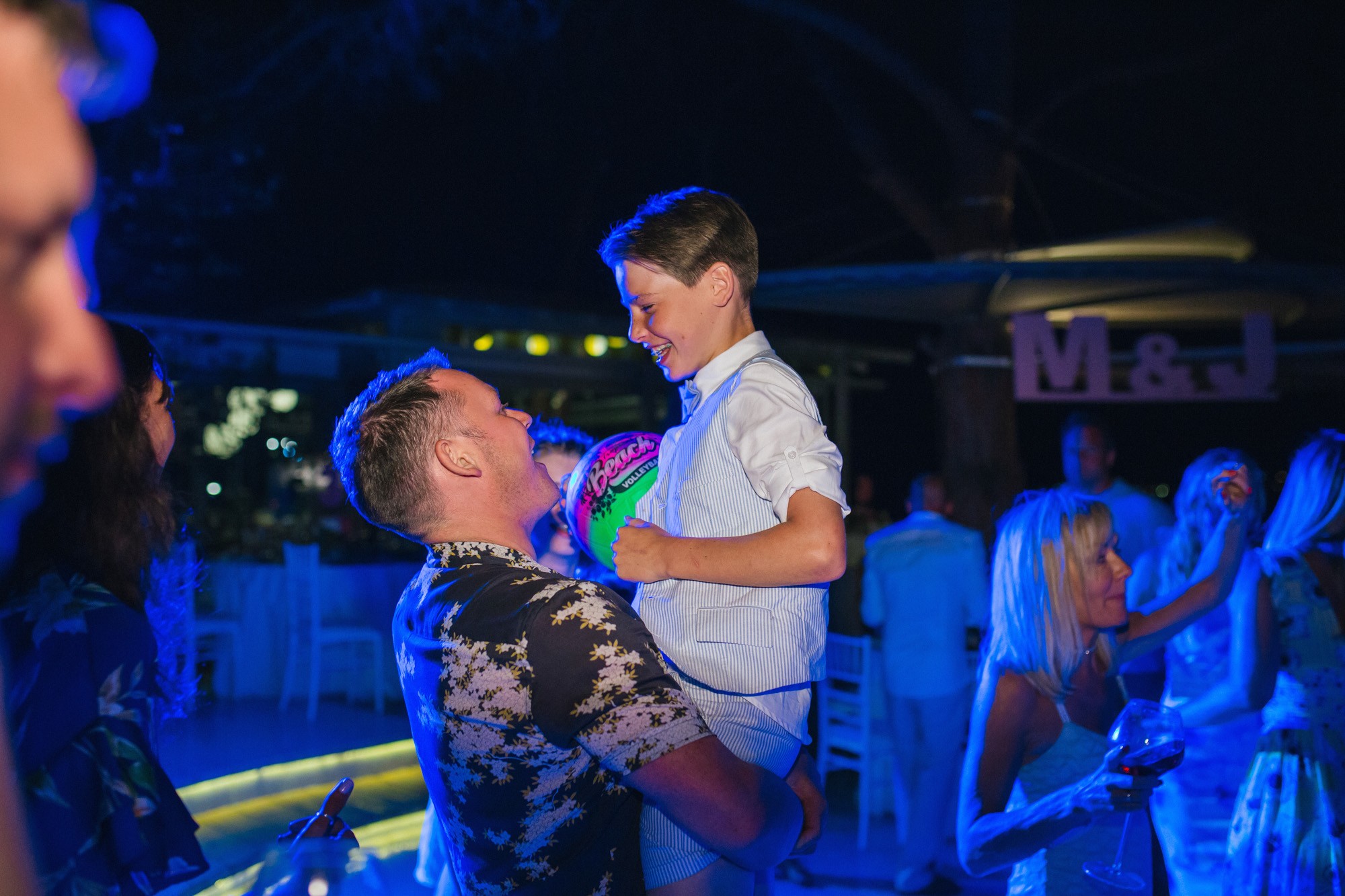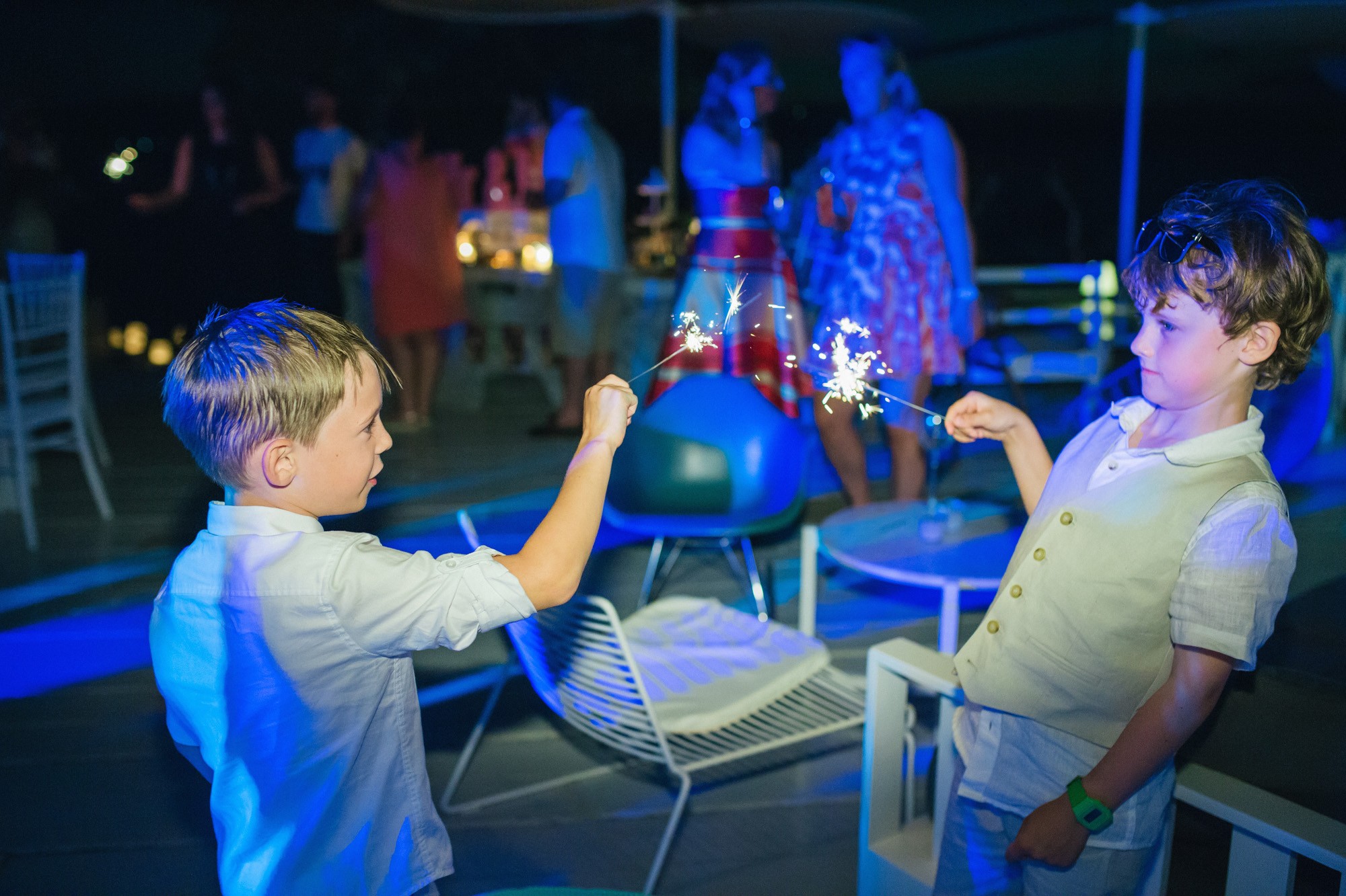As night arrived, lit lanterns adorned the sand, while one of the most emotionally intense moments occurred when the couple let the ashes of Mat’s beloved grandfather blend with the peaceful Aegean Sea. This moment was deeply moving for the entire family. However, the fun quickly took center stage with the start of the wedding party. Fireworks amazed the guests and instantly the night turned into an exuberant celebration, a lively, incredibly entertaining, and unforgettable party. The vibrant colors and festive atmosphere of the attendees created stunning images, which I captured with great enthusiasm and joy as a wedding photographer.