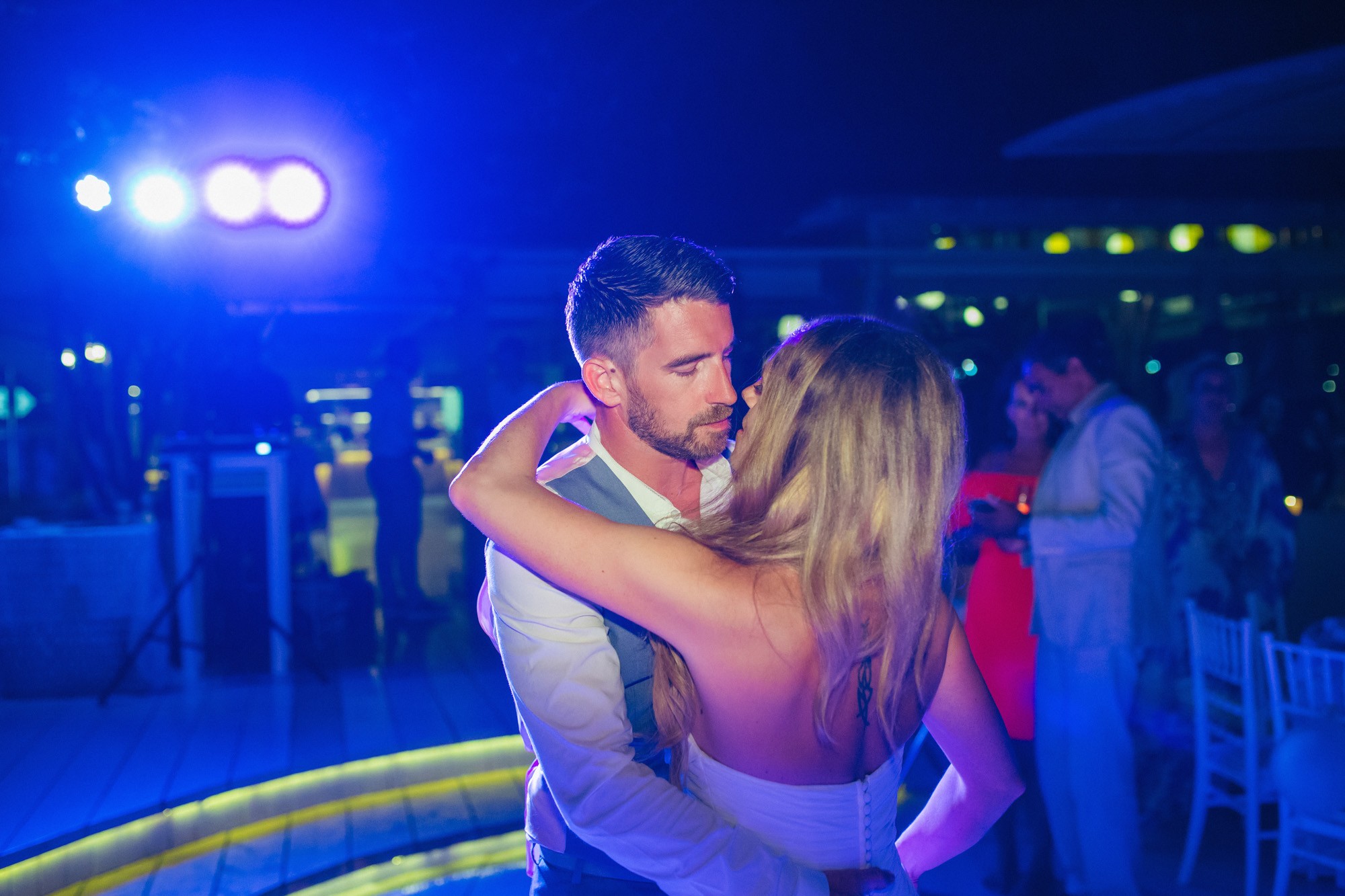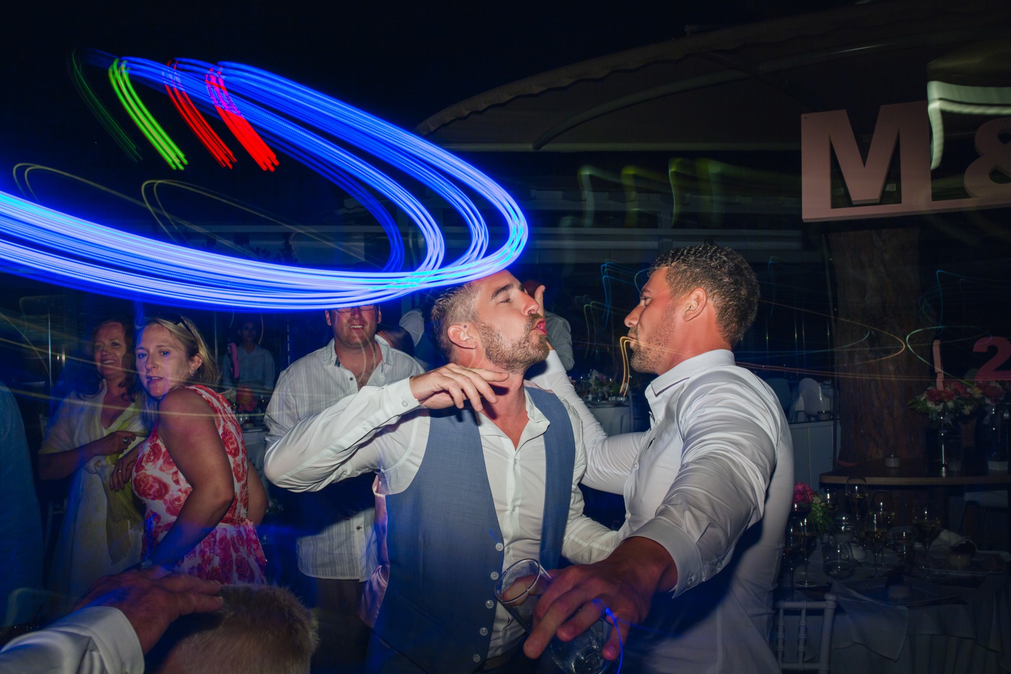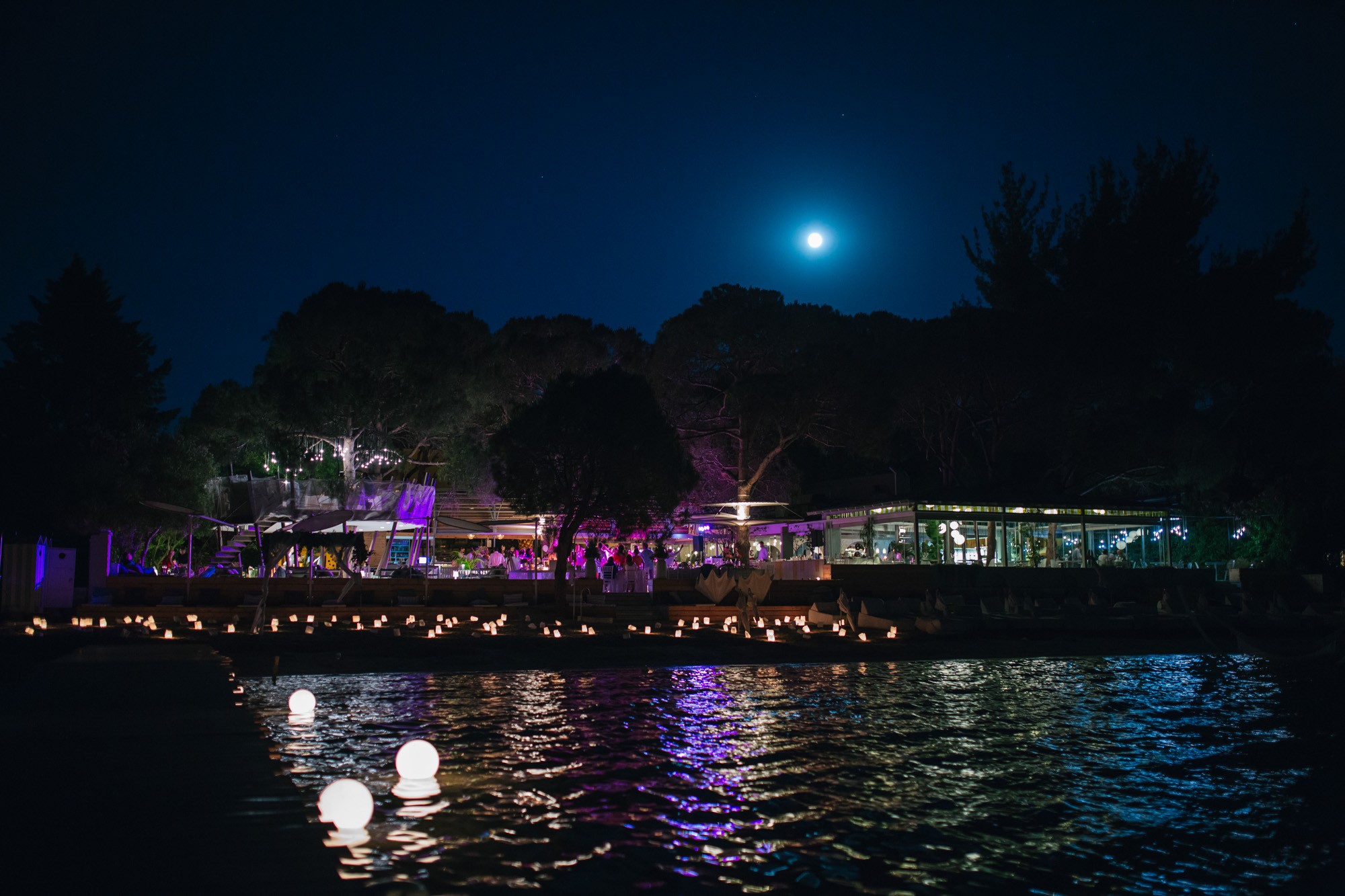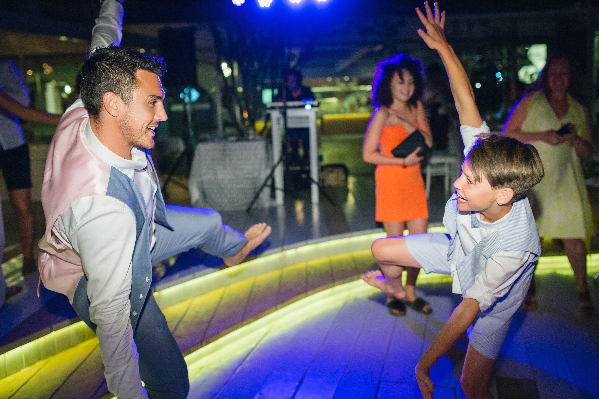 As night arrived, lit lanterns adorned the sand, while one of the most emotionally intense moments occurred when the couple let the ashes of Mat’s beloved grandfather blend with the peaceful Aegean Sea. This moment was deeply moving for the entire family. However, the fun quickly took center stage with the start of the wedding party. Fireworks amazed the guests and instantly the night turned into an exuberant celebration, a lively, incredibly entertaining, and unforgettable party. The vibrant colors and festive atmosphere of the attendees created stunning images, which I captured with great enthusiasm and joy as a wedding photographer.