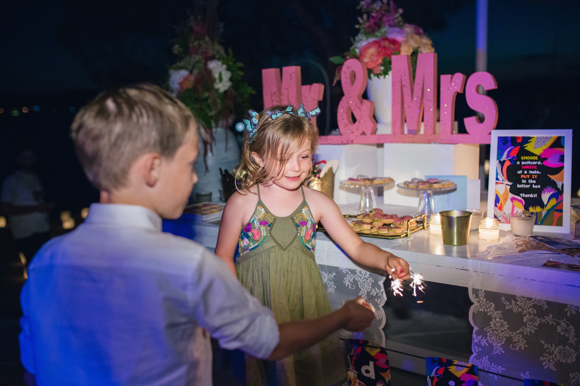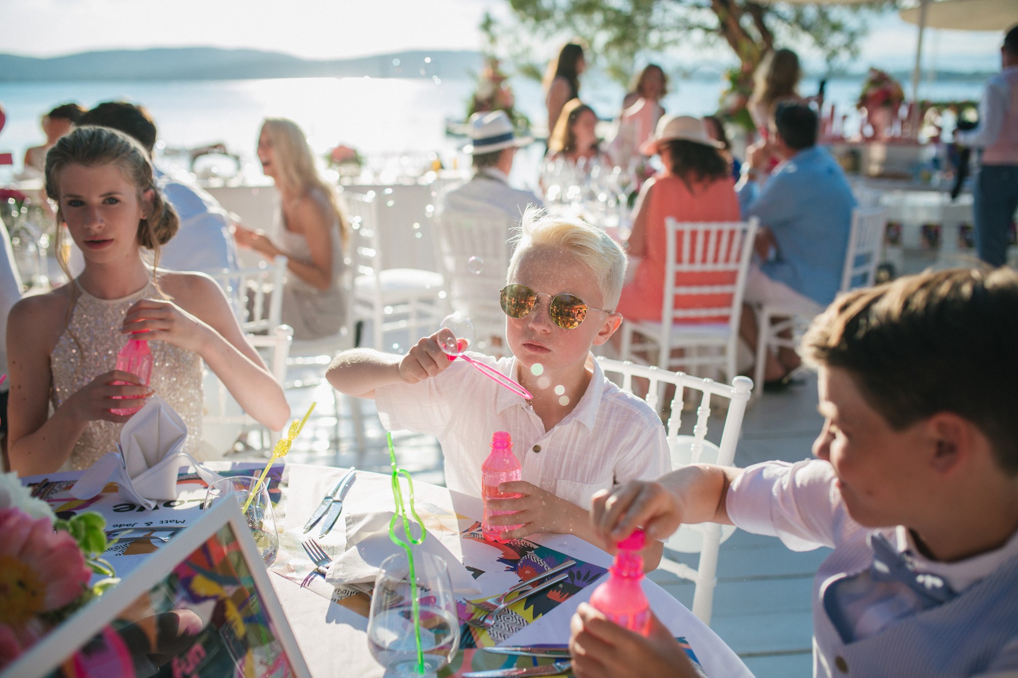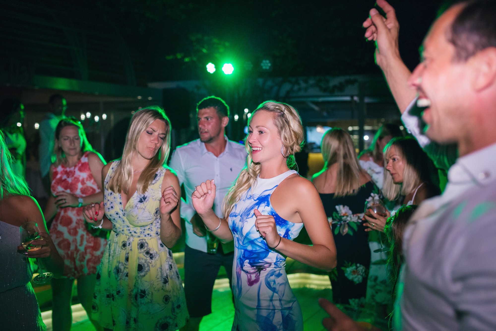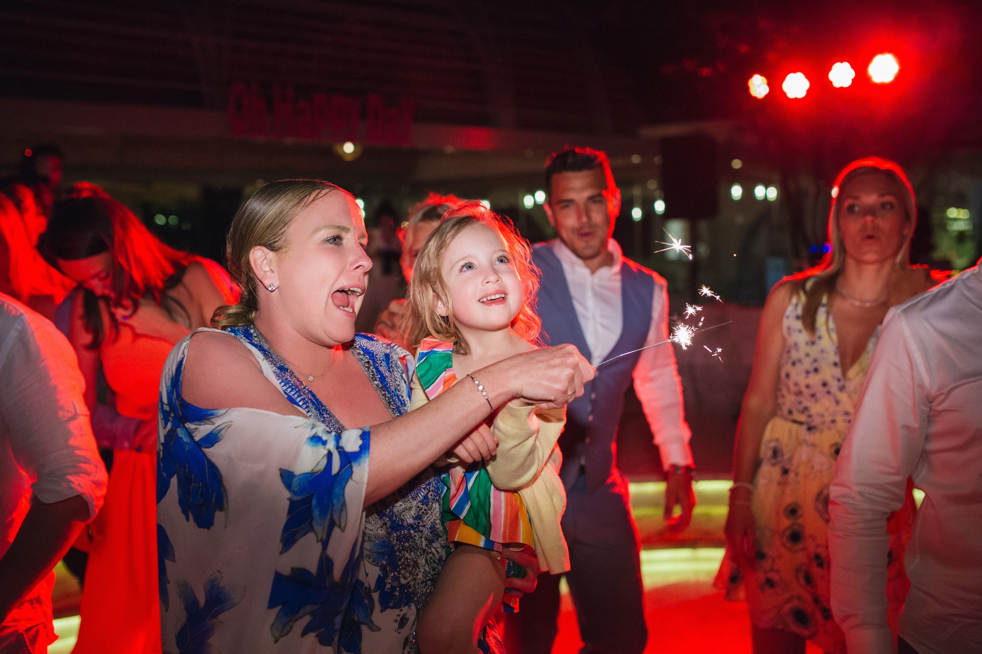 As night arrived, lit lanterns adorned the sand, while one of the most emotionally intense moments occurred when the couple let the ashes of Mat’s beloved grandfather blend with the peaceful Aegean Sea. This moment was deeply moving for the entire family. However, the fun quickly took center stage with the start of the wedding party. Fireworks amazed the guests and instantly the night turned into an exuberant celebration, a lively, incredibly entertaining, and unforgettable party. The vibrant colors and festive atmosphere of the attendees created stunning images, which I captured with great enthusiasm and joy as a wedding photographer.