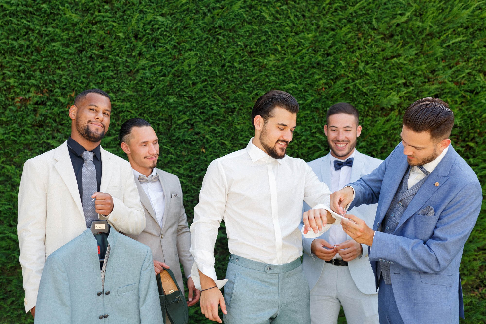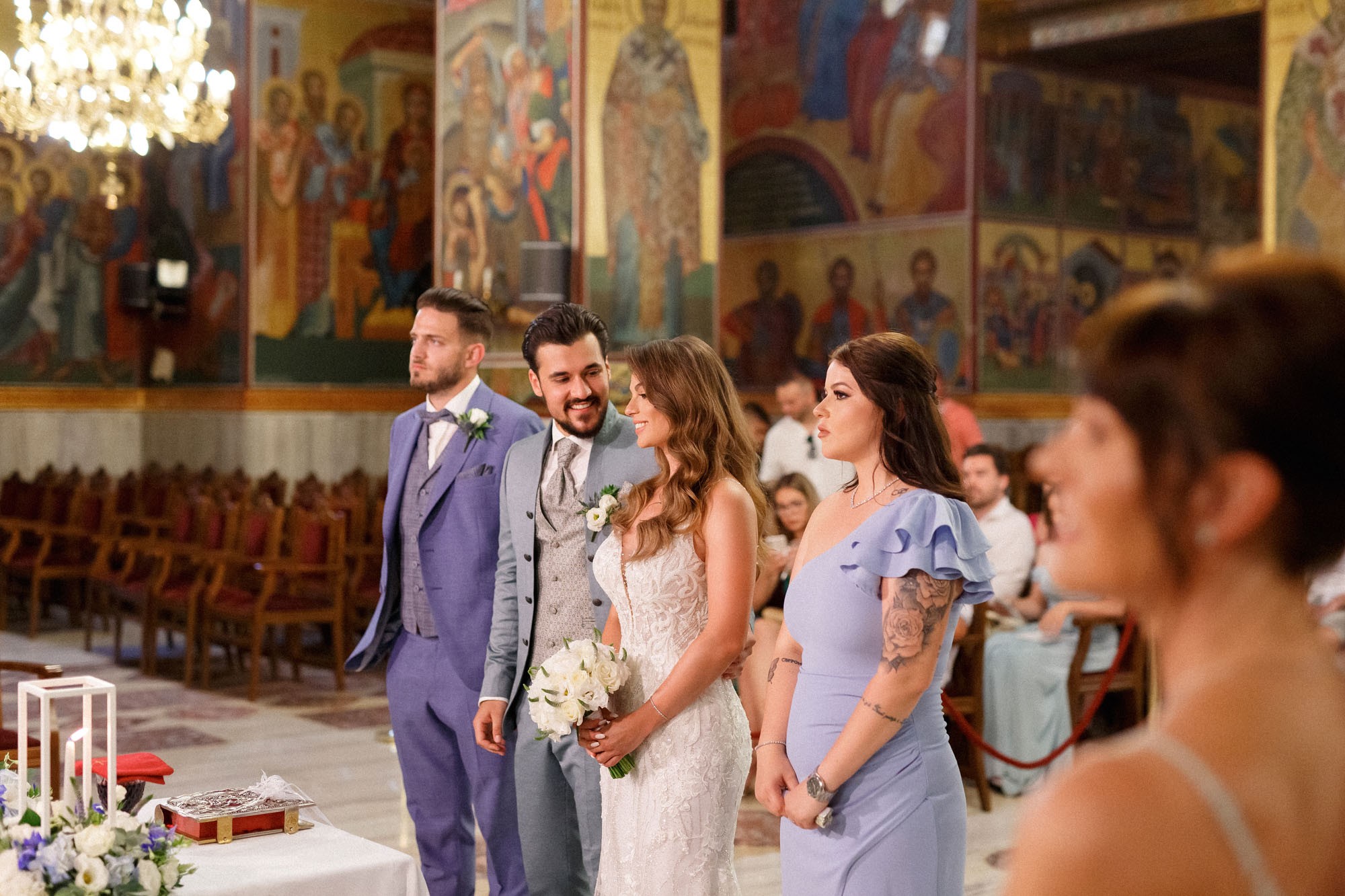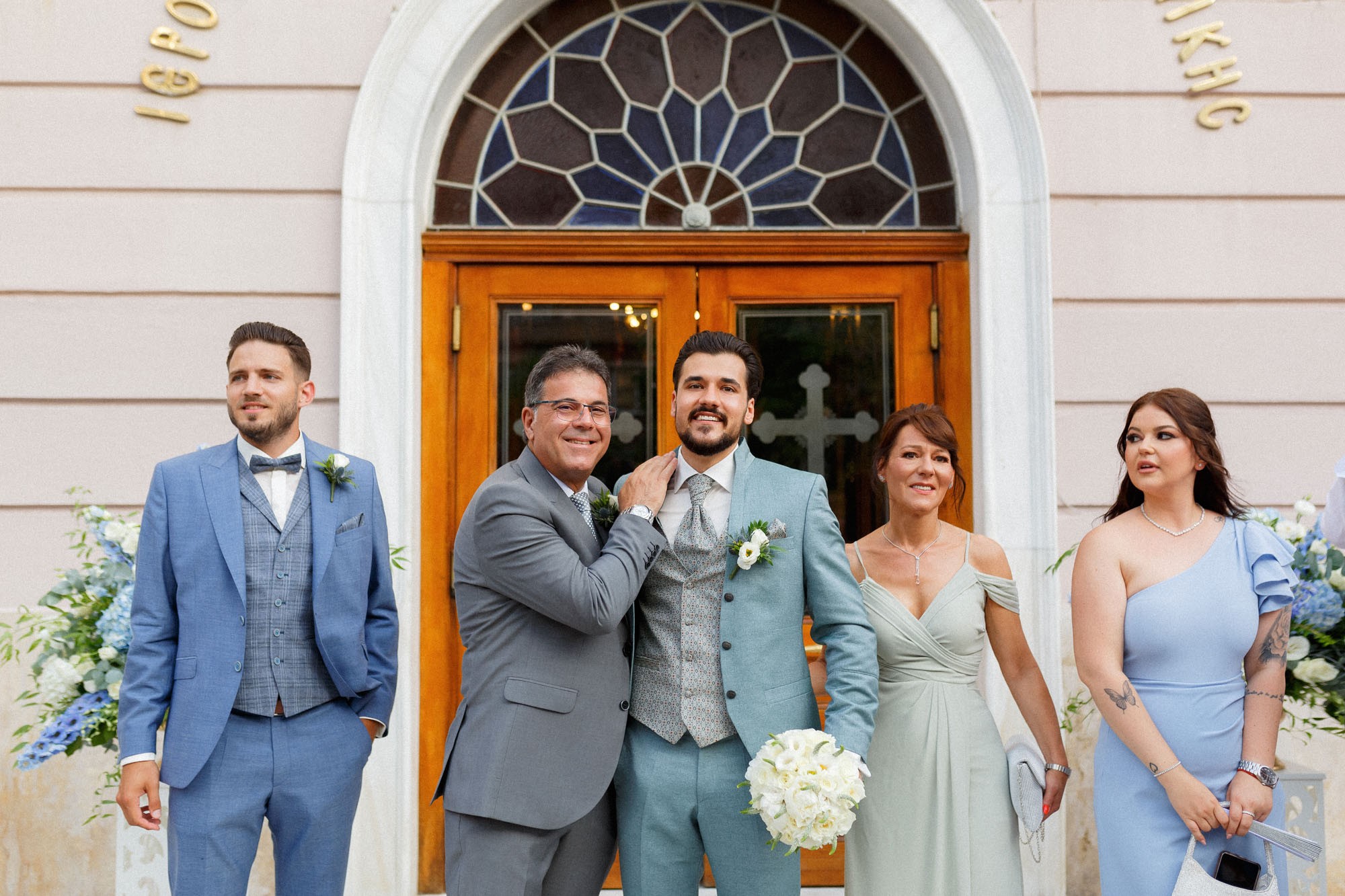 Panos, on the other hand, got ready at his home, where his friends joined him for some fun moments by the outdoor pool at Hortiaiti region. The atmosphere was relaxed and full of excitement. Dressed in his light blue suit, Panos was ready for the big day. The wedding photographer, Hector, captured every little detail of his preparations, ensuring that each moment was preserved.