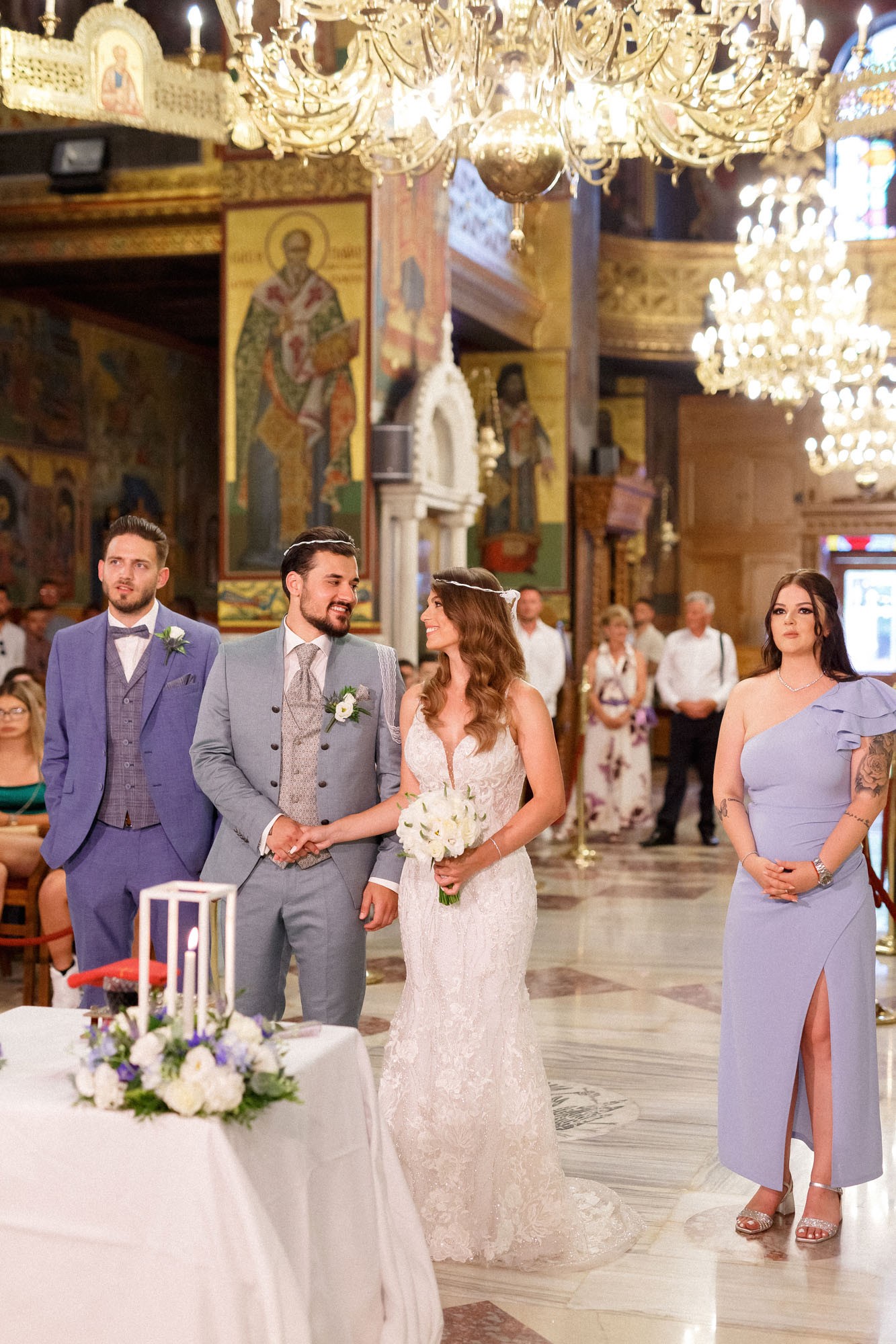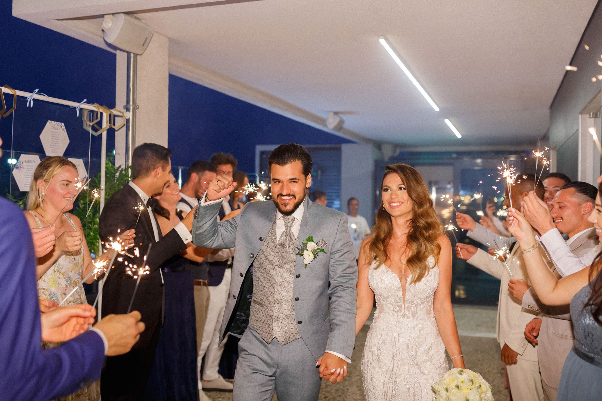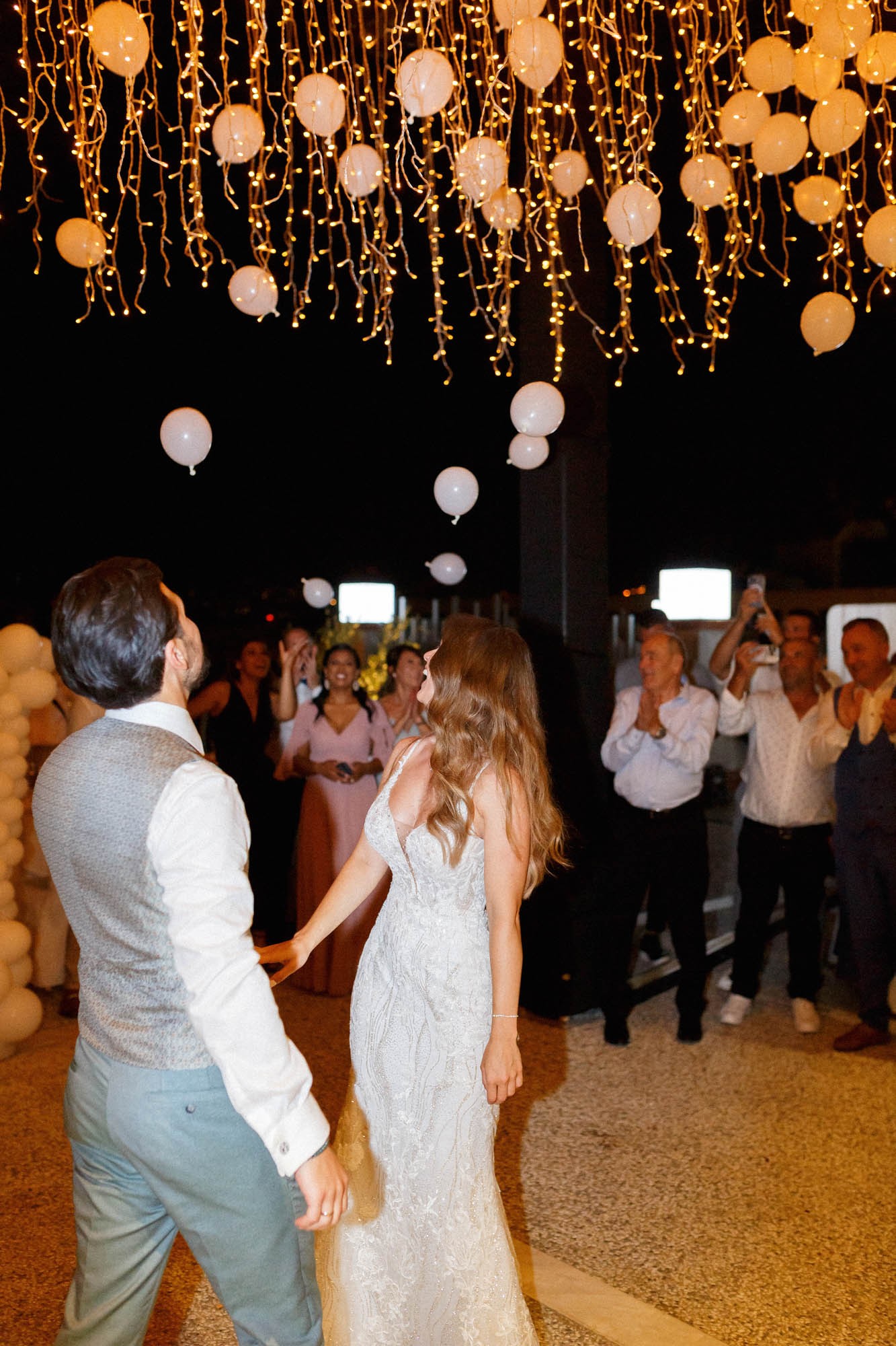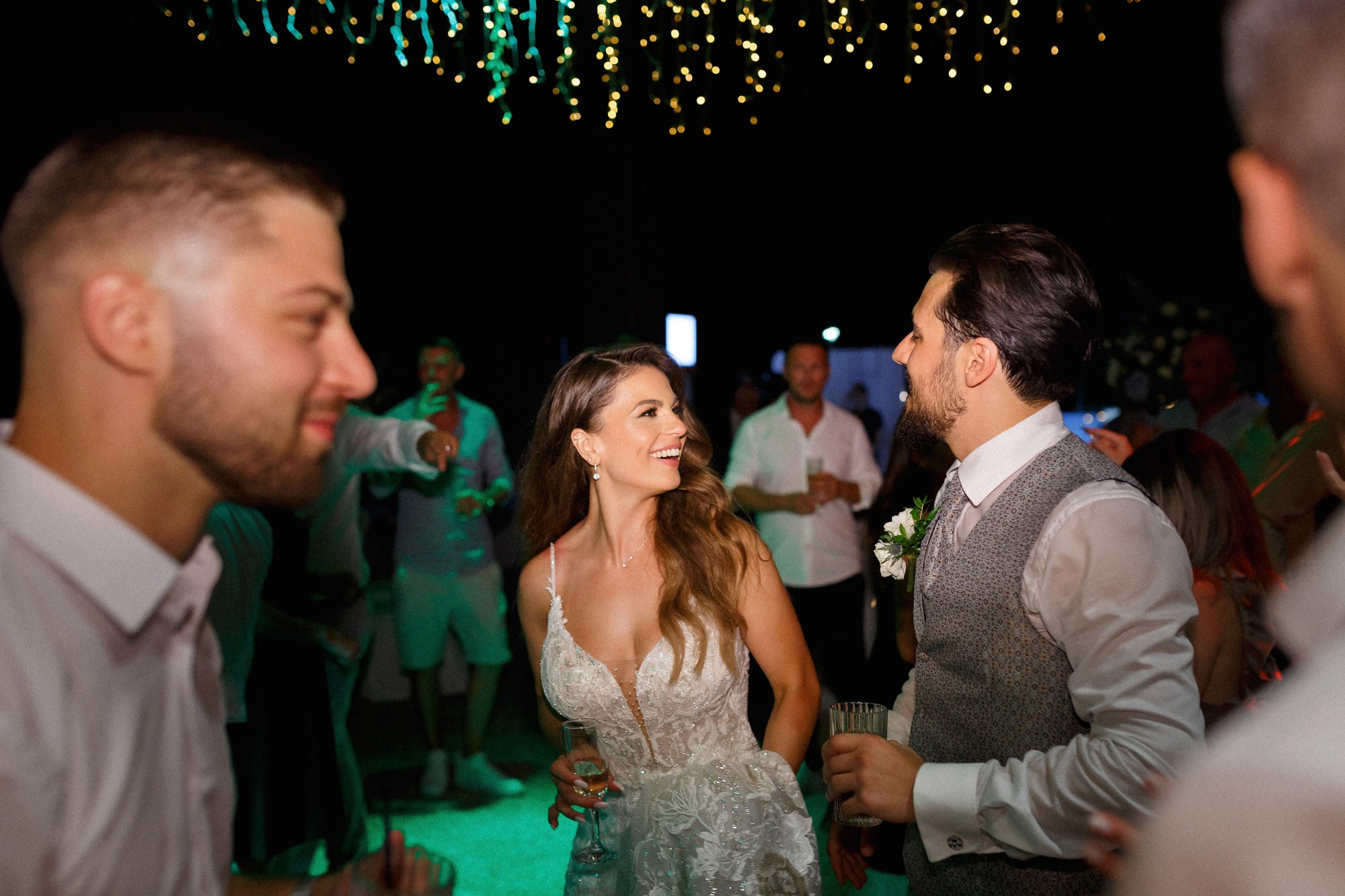 The reception took place in the outdoor area of the luxurious Porto Palace, which was beautifully decorated in white, with stunning flower columns at each table. The air was filled with laughter, dancing, and joy, creating an unforgettable experience for all the guests. The wedding photos taken by wedding photographers Christina and Hector will preserve these precious memories for the couple, making sure this day will always be remembered.